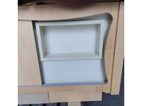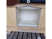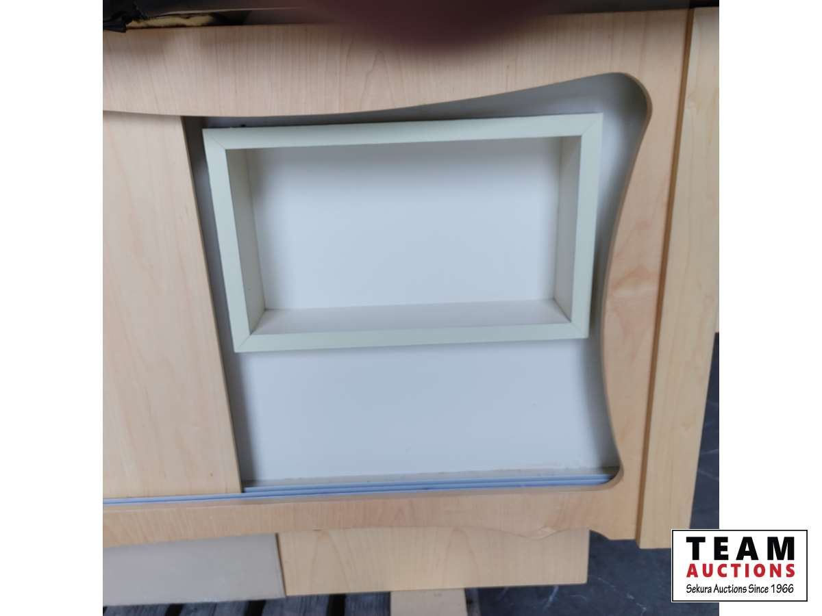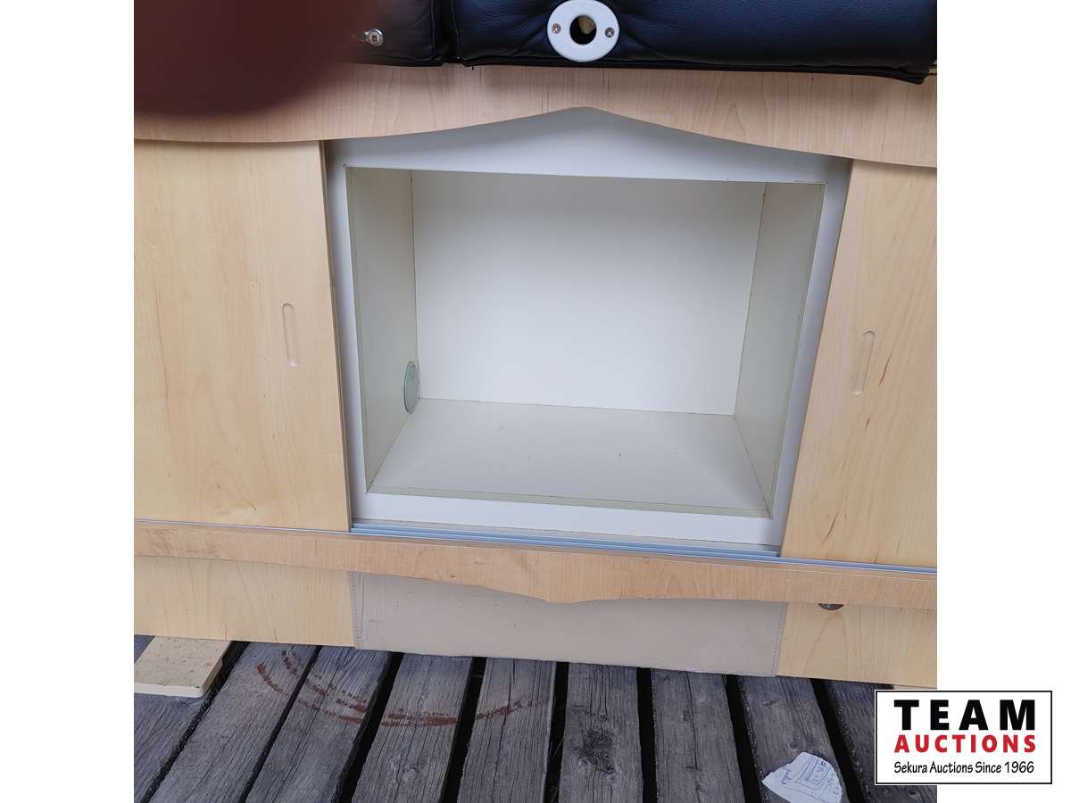 Tilt up headrest, foot bath, storage cabinets below.