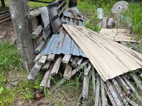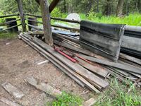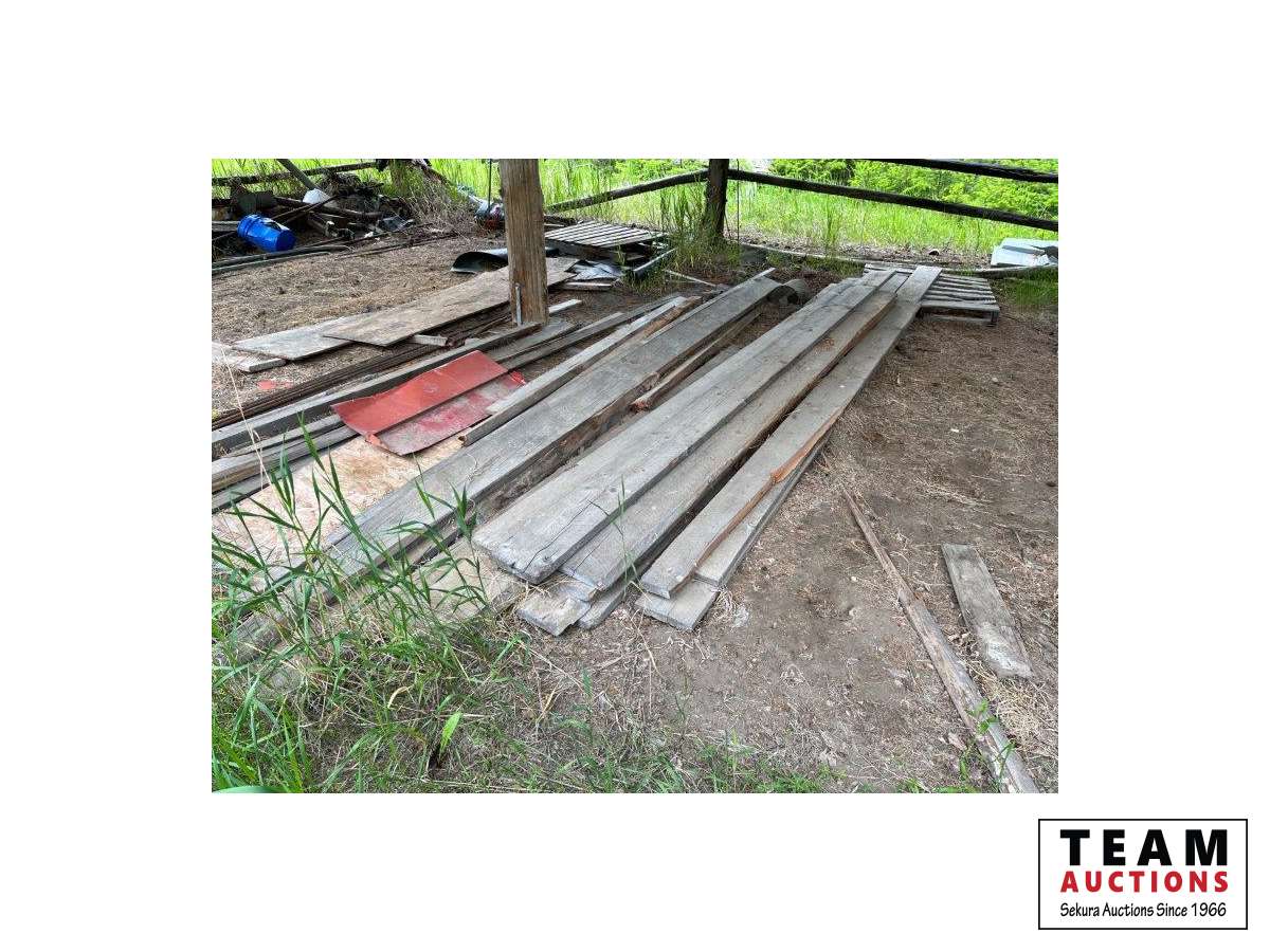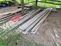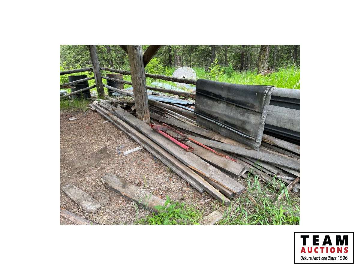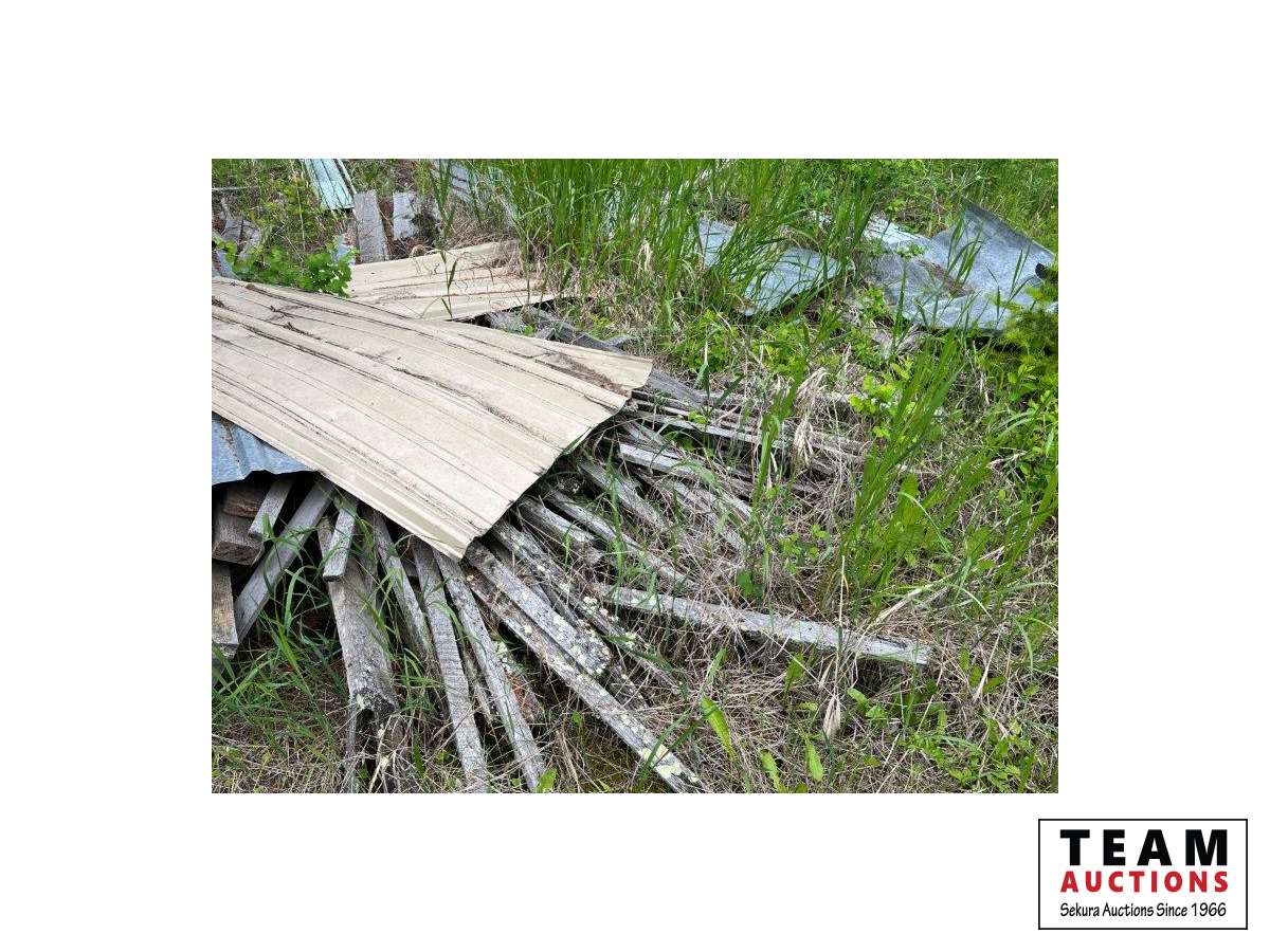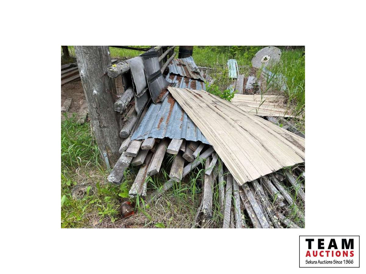 Various items in under cover and within 50 ft of Pole Shed Steel roofing Lumber Old farm equipment Old Bombardie snowmobile Take what you want Pole Shed not included