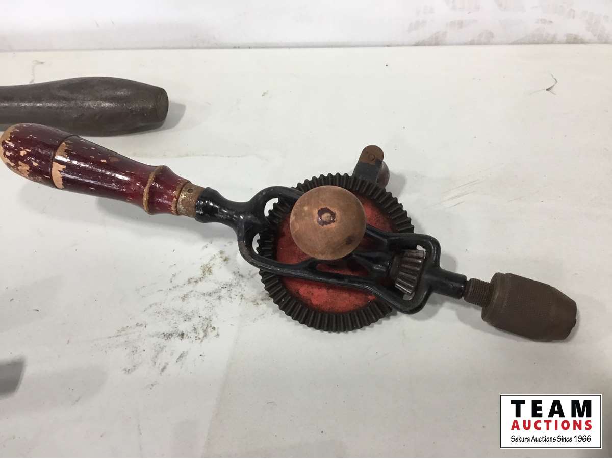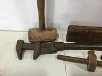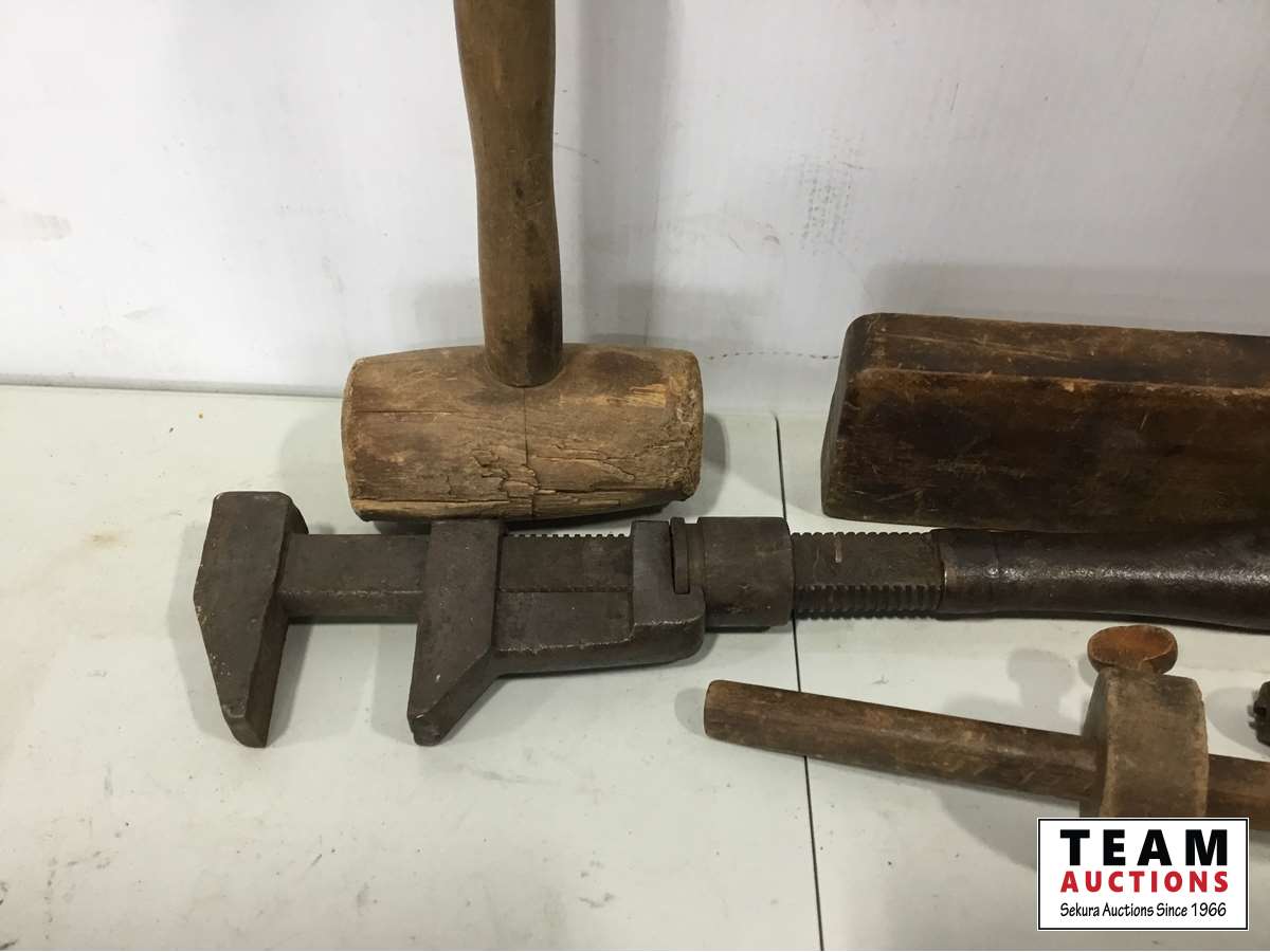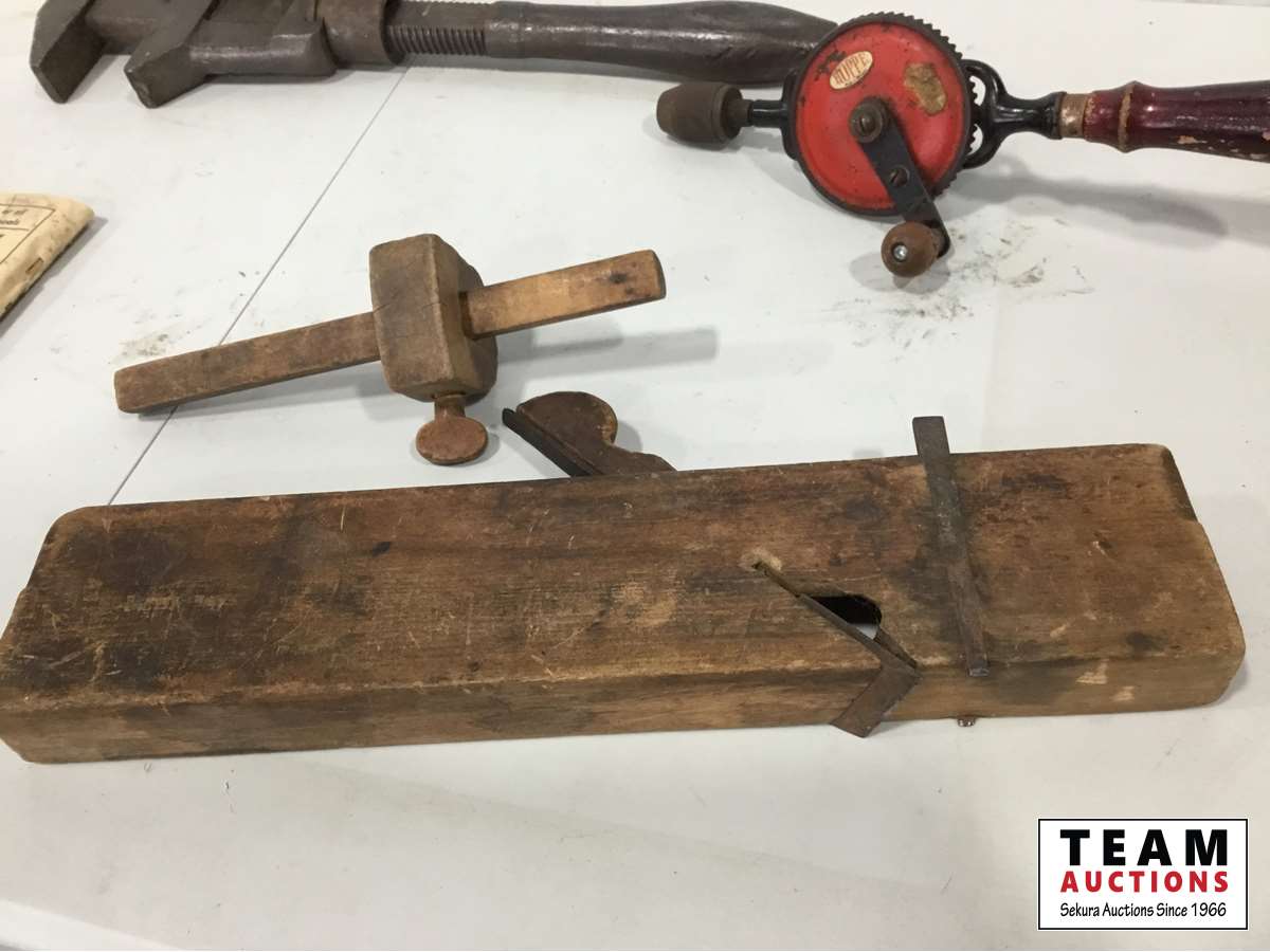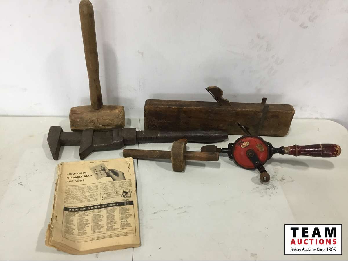 Wood mallet, wood plane, hand drill, pipe wrench, work shop manual