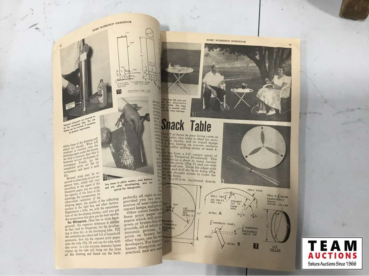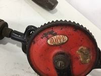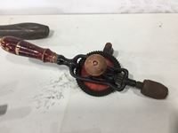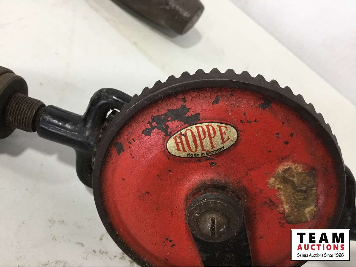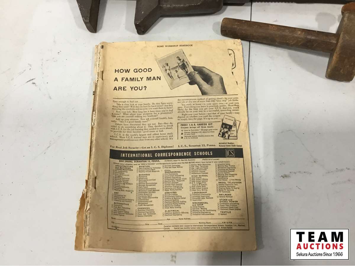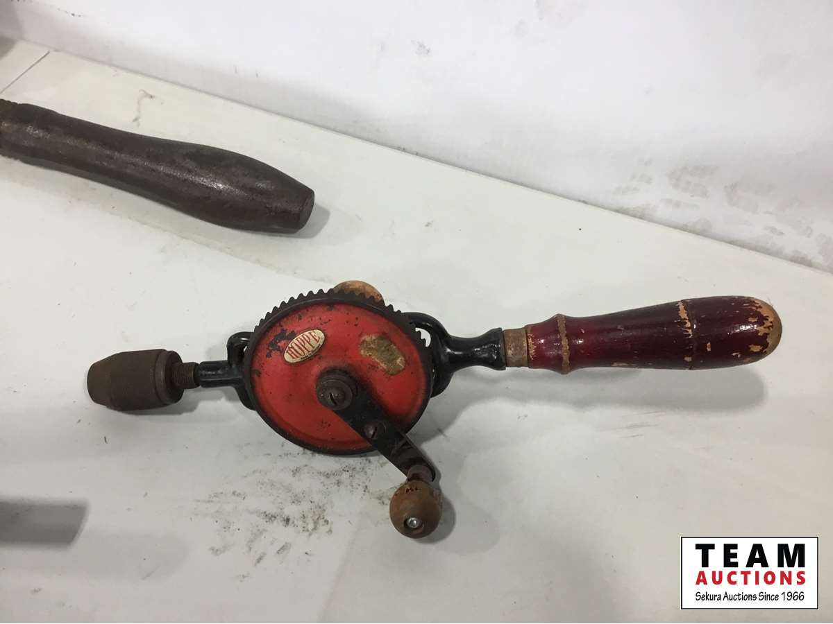 Wood mallet, wood plane, hand drill, pipe wrench, work shop manual