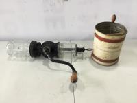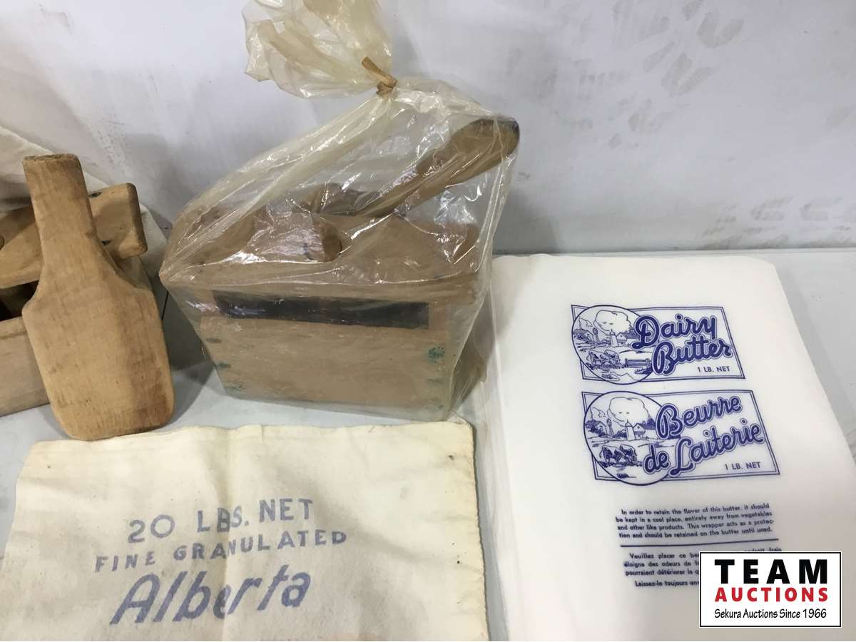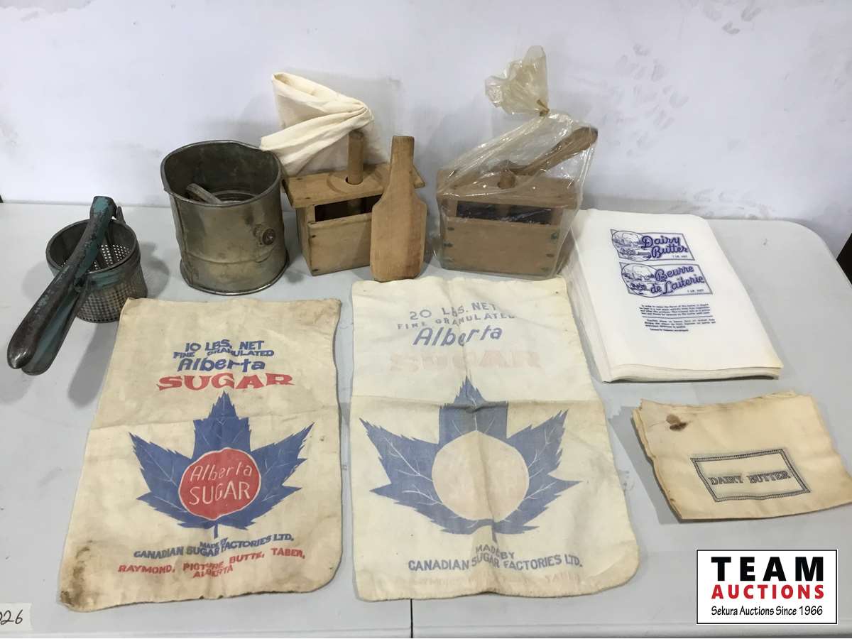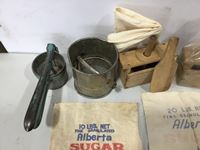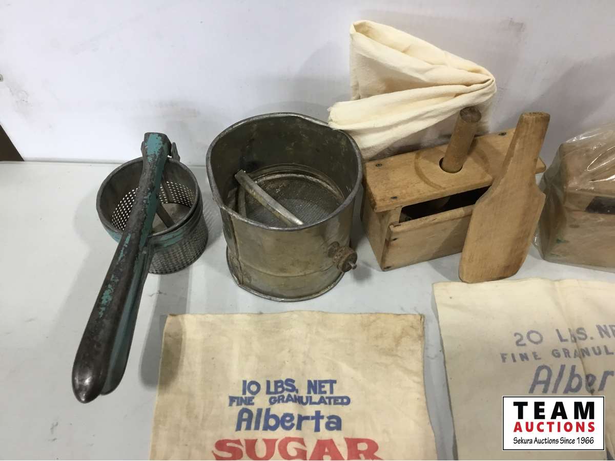 (2) Butter presses, (2) sugar bags, Qty of butter wrapers, hand juicer, flour sifter