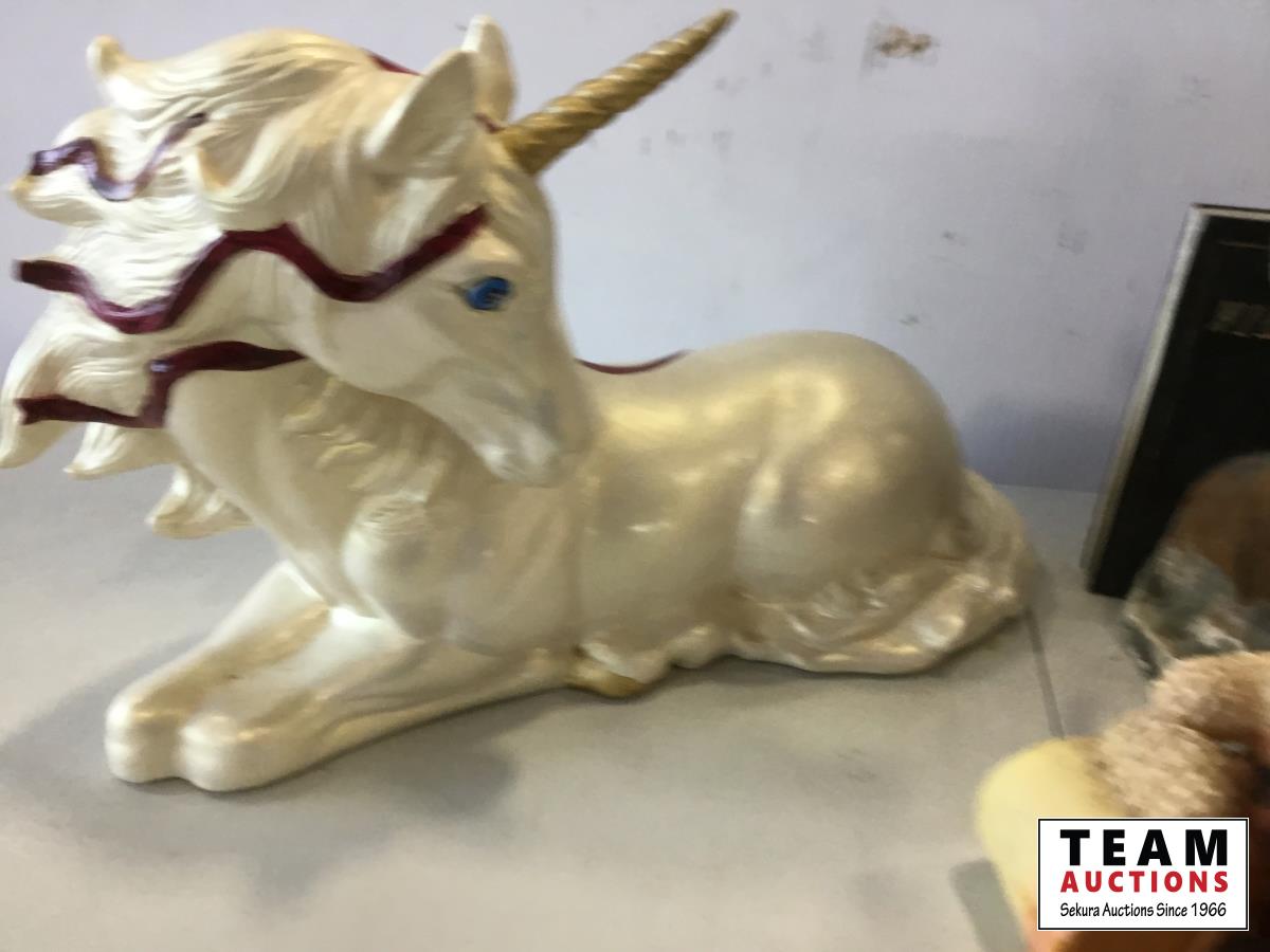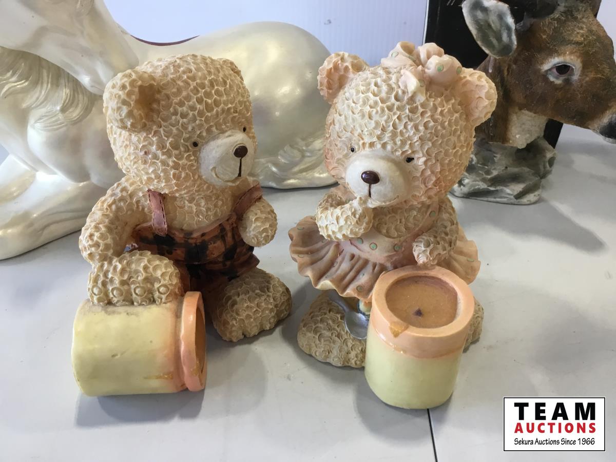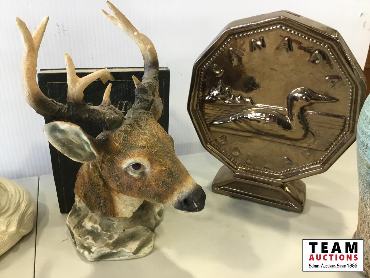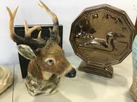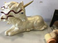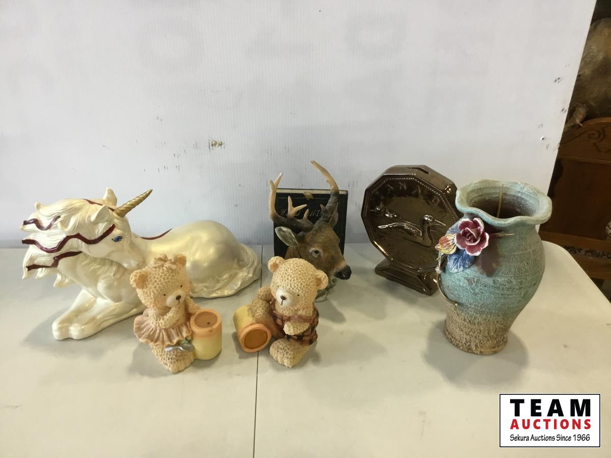 vase, bear ornaments, unicorn ornament, loonie on stand, deer head wall hanger