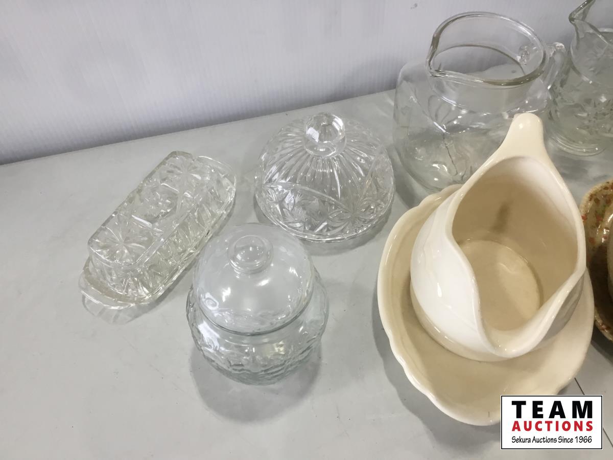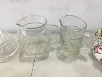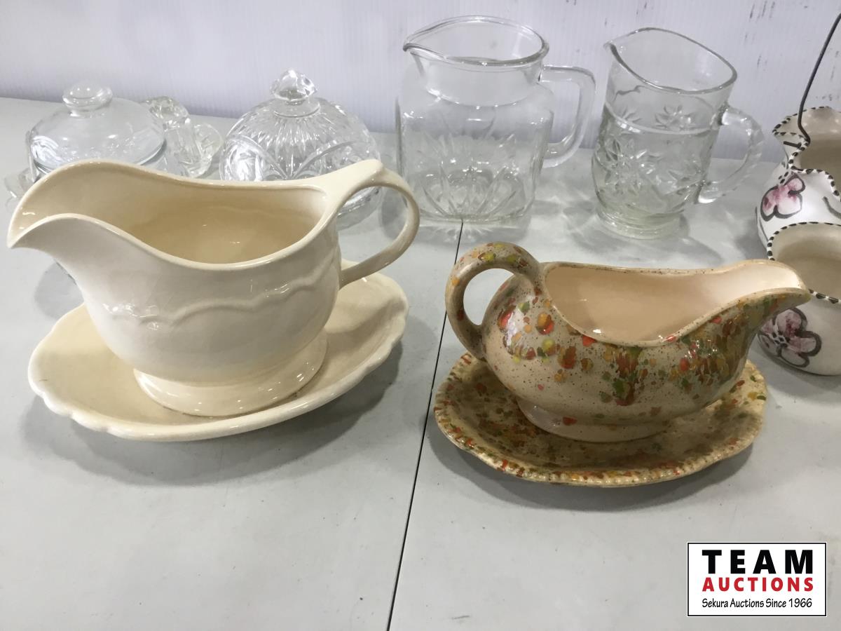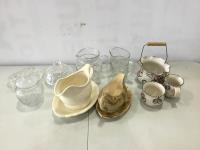 gravy boats, butter dish, pitchers, covered glass dishes, china pot, cups
