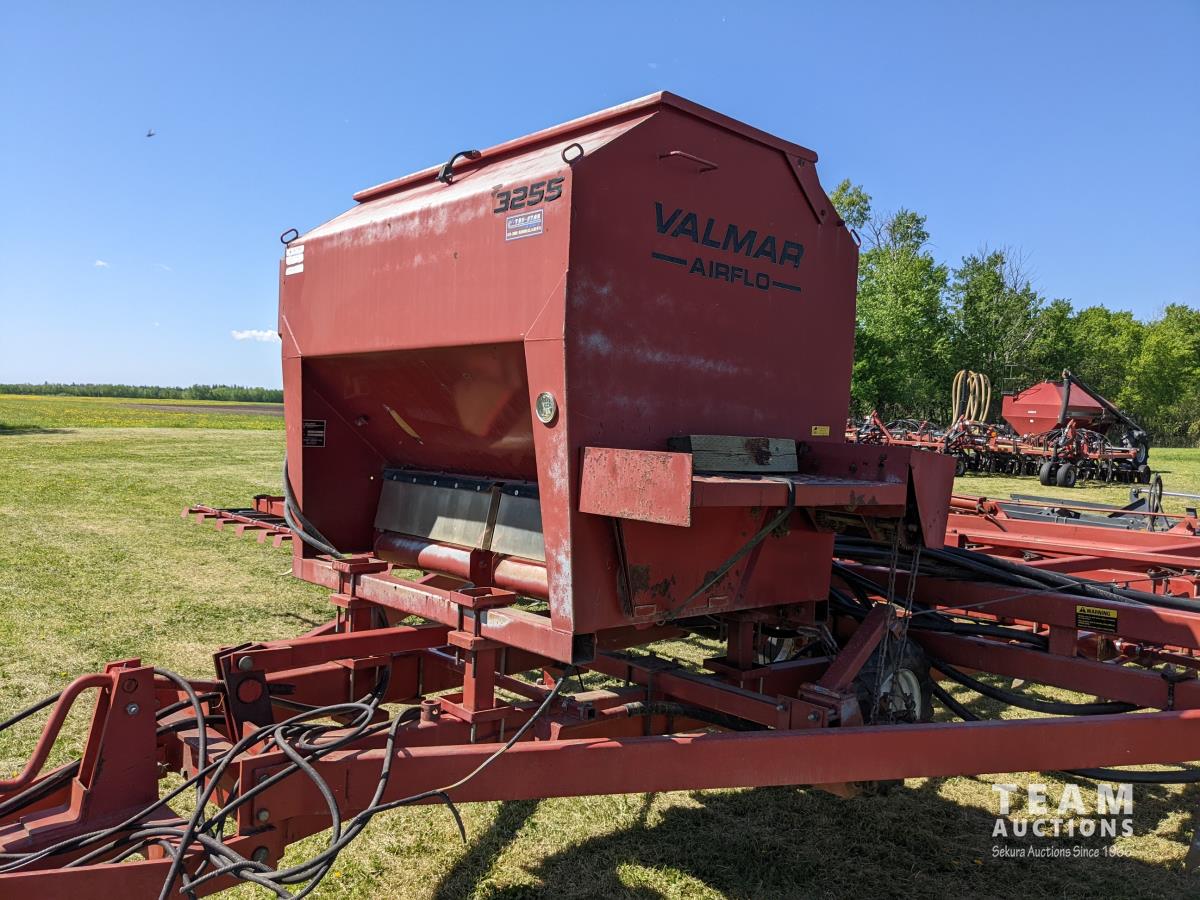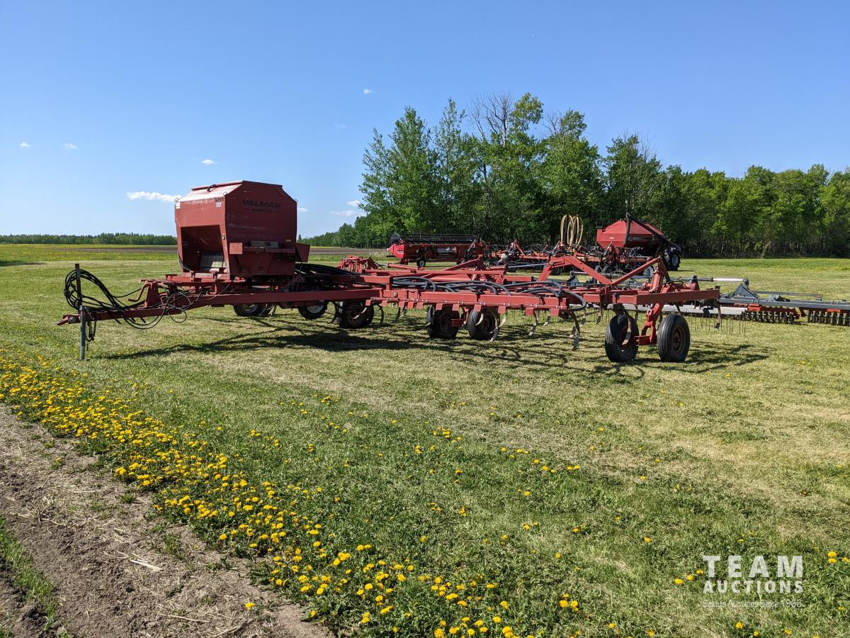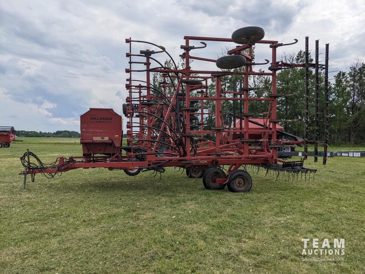 6.5 inch spacing, new spikes, 3 bar mounted harrows, walking axles on main frame and wings, Valmar 3255 Air Flo applicator, coarse and fine feed rolls