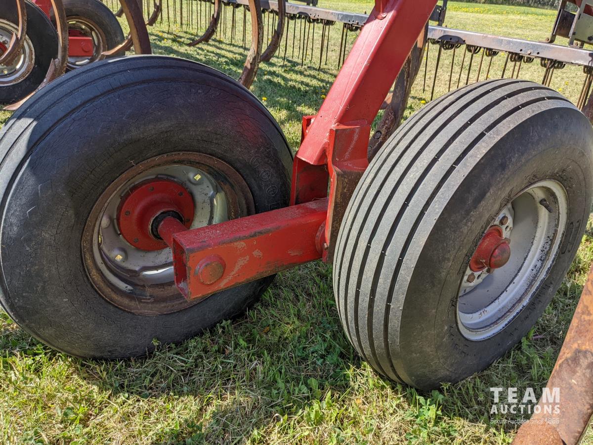 12 inch spacing, spikes, 3 bar mounted harrows, walking axles on main frame and wings, 7.60-15 tires on wings, 9.5-14 tires on main frame