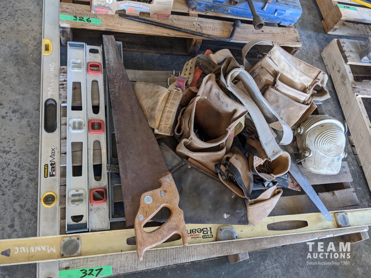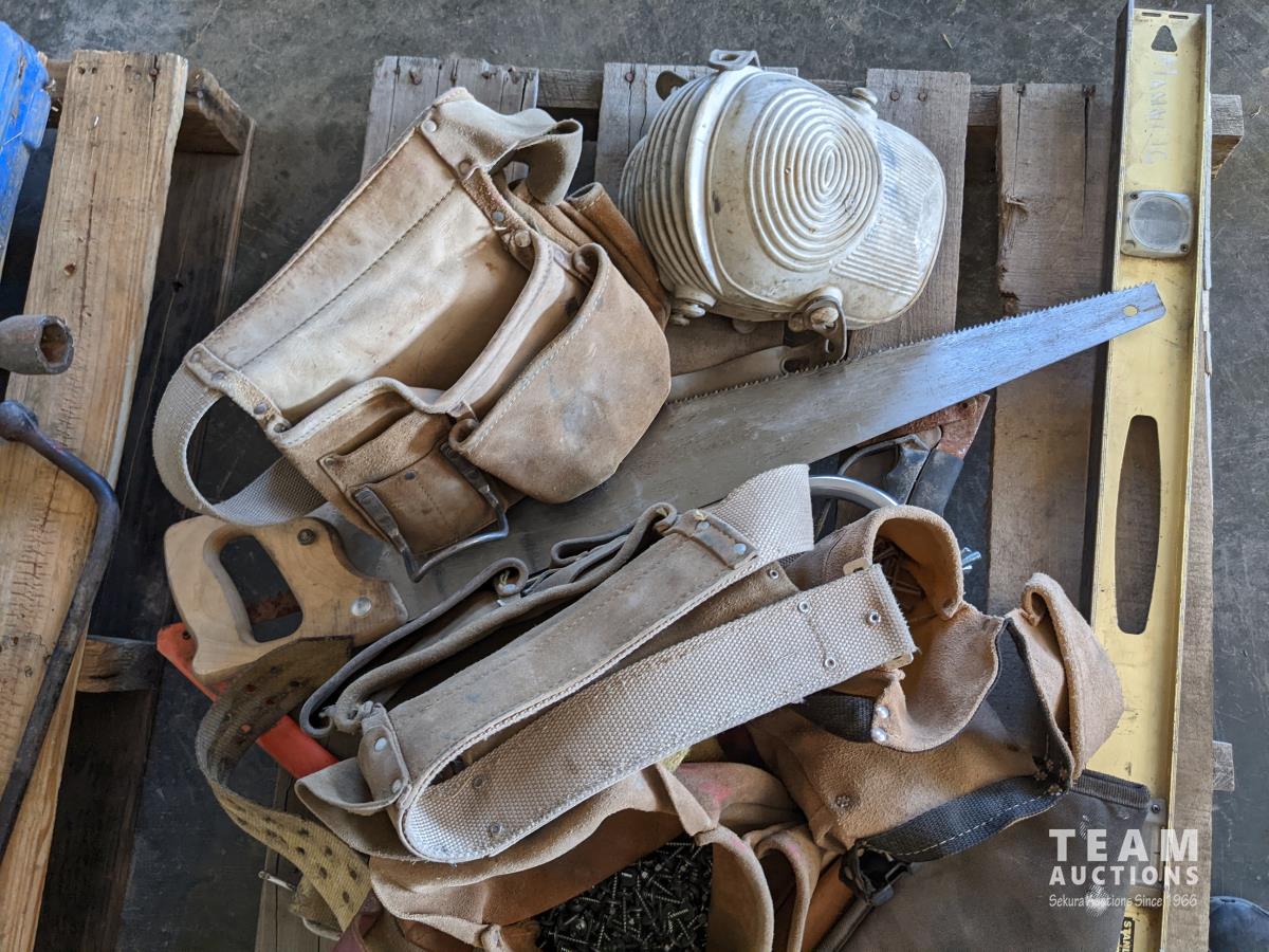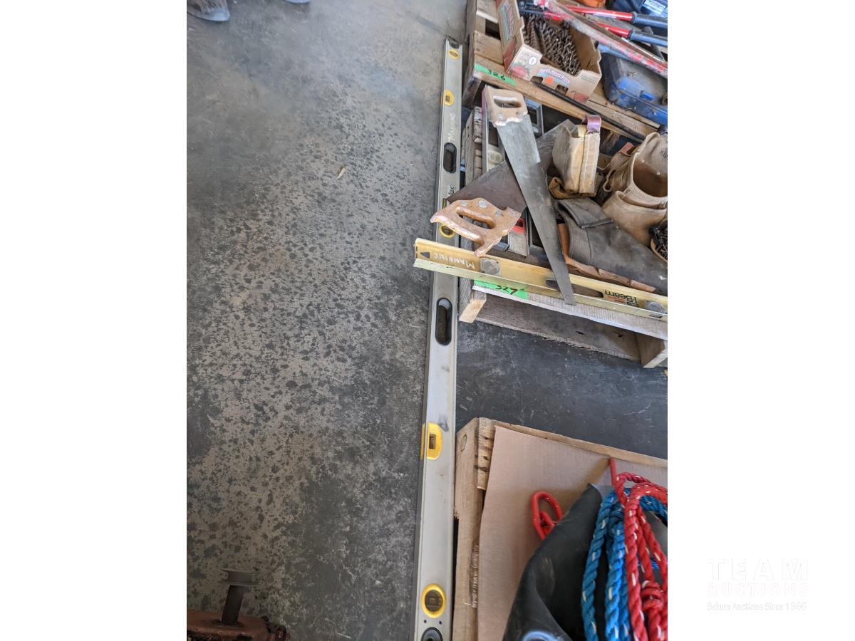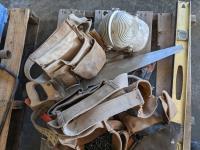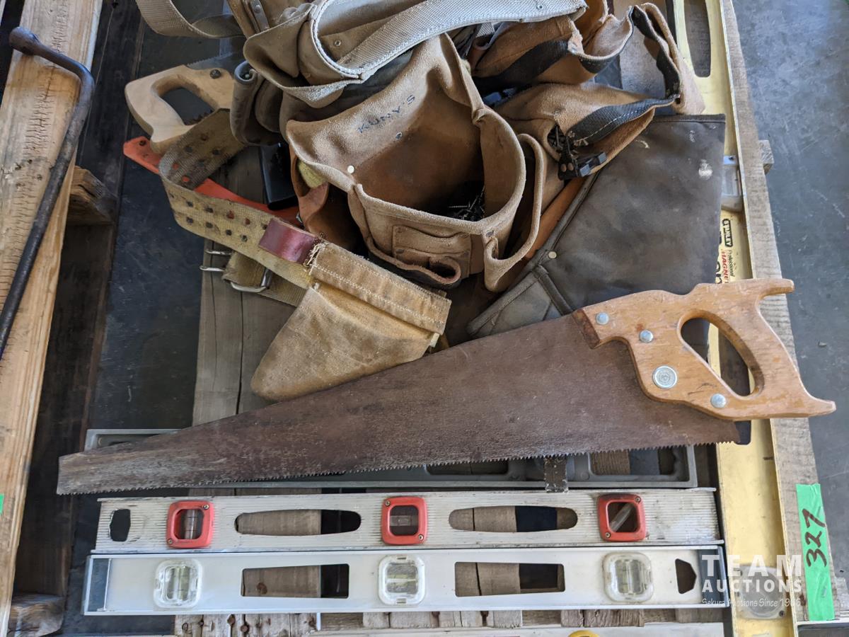 4 ft & 6 ft level, (3) 2 ft levels, (2) hand saws, (1) cross cut saw, assorted tool belts, (2) holsters for drills, knee pads