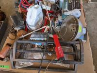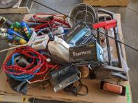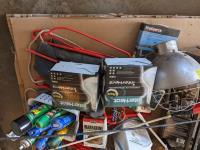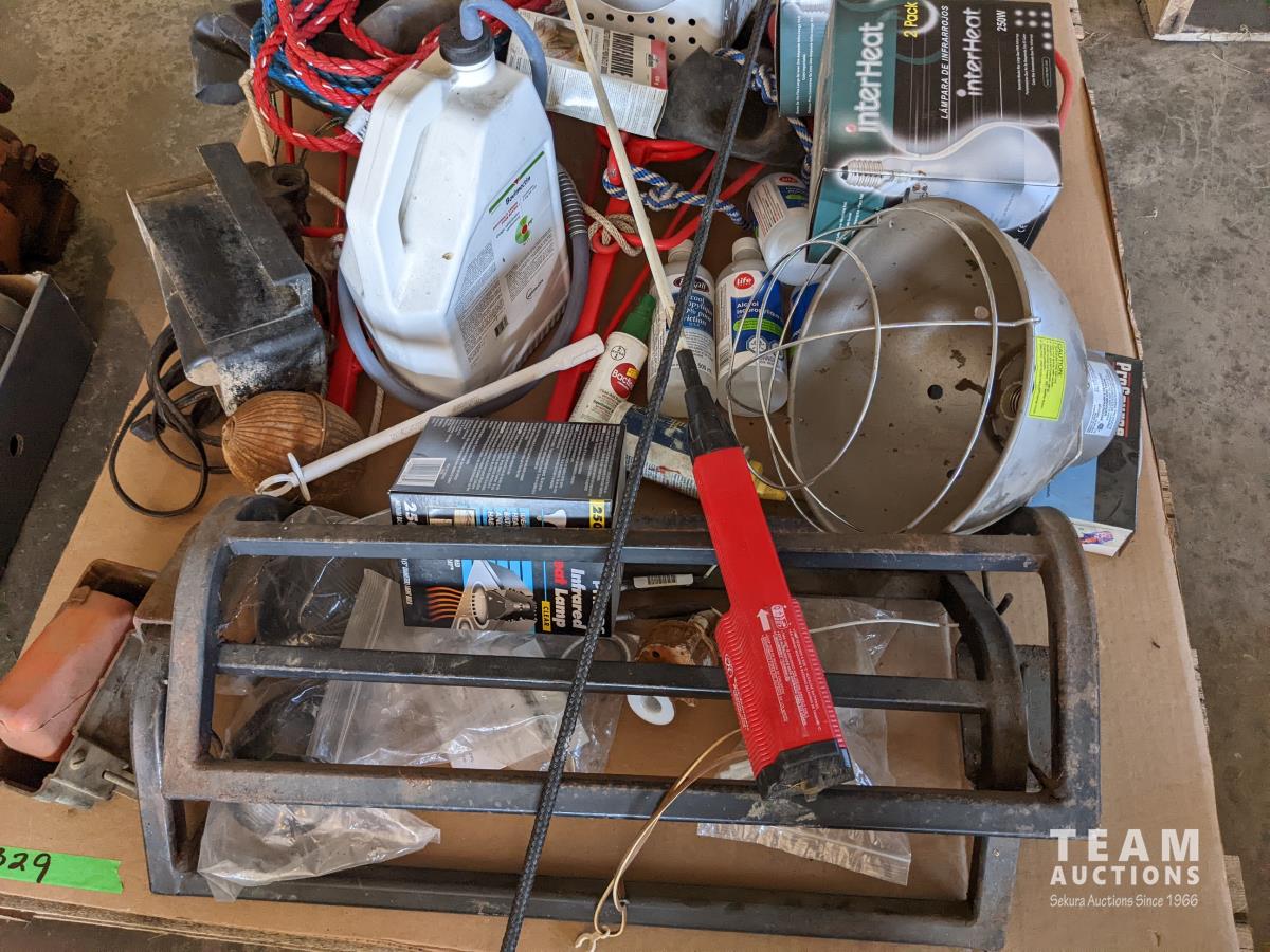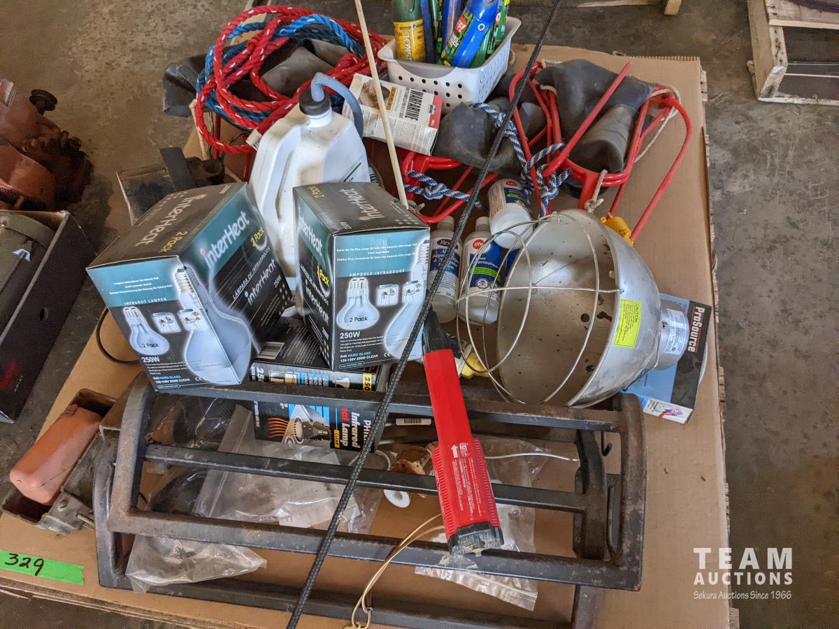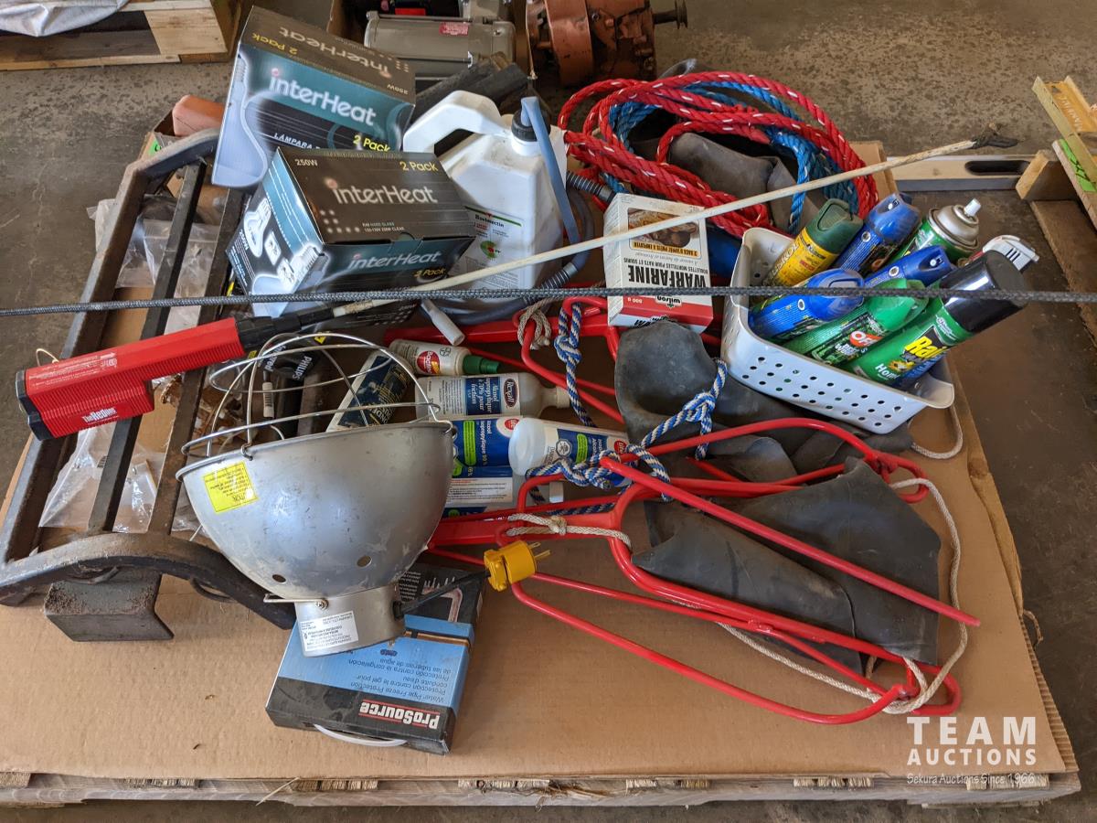 (2) Cow halters, cattle prod, whip, assorted bug spray, (3) bottles of isopropylene, shop light (3) Nord forks, (3) heat lamps, (2) saddle racks, stock waterer parts includes, floats, valve assembly & thermostat