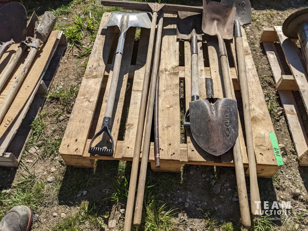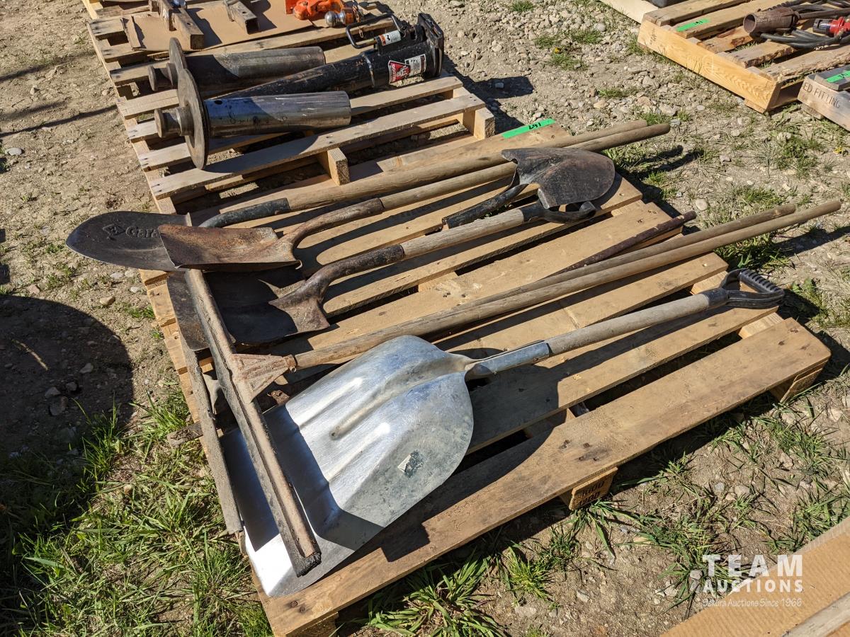 140 Assorted Shovels, Pry Bar & Squeege