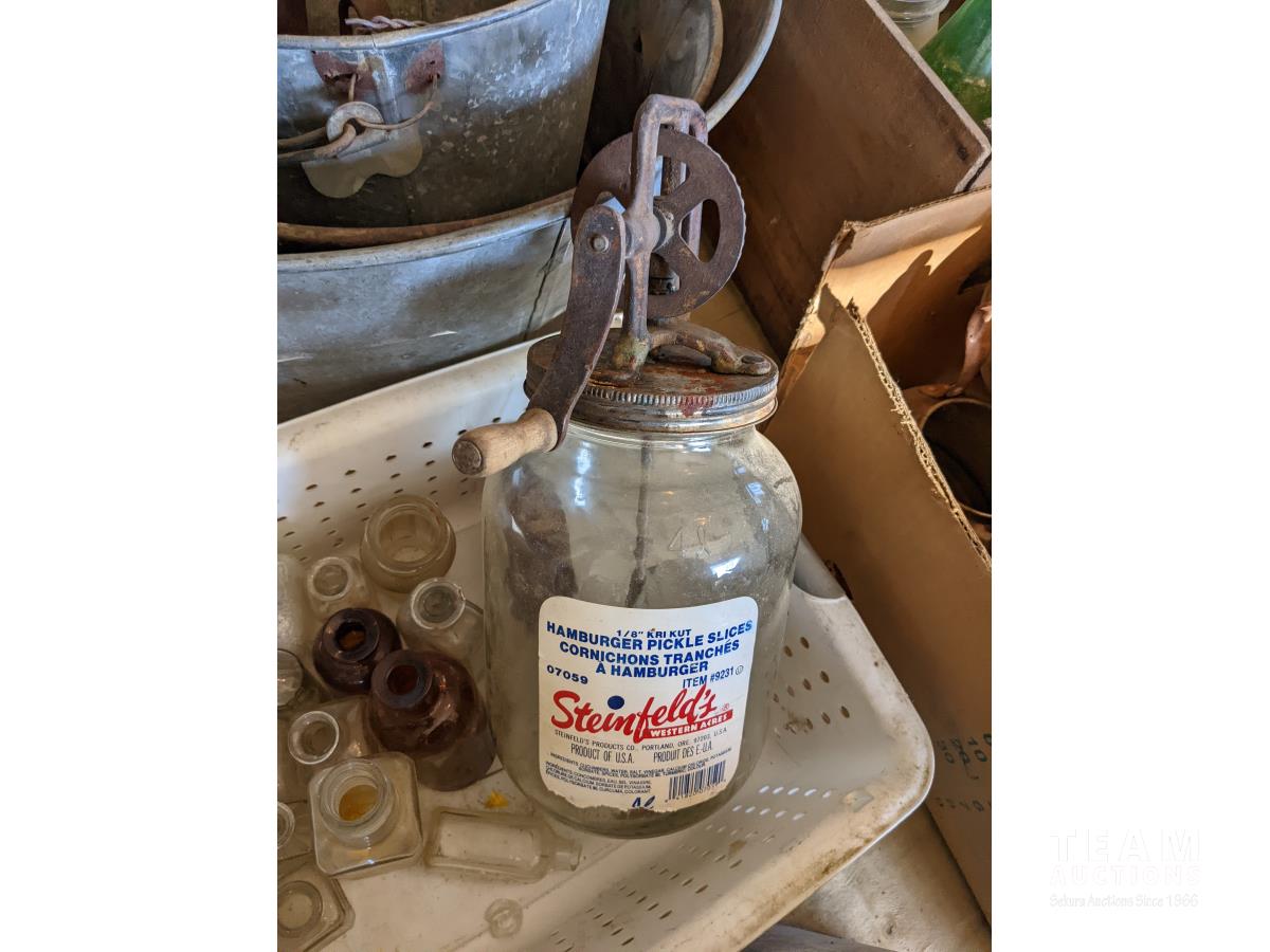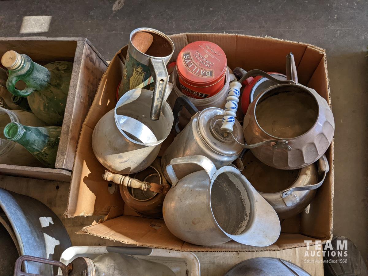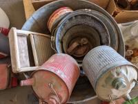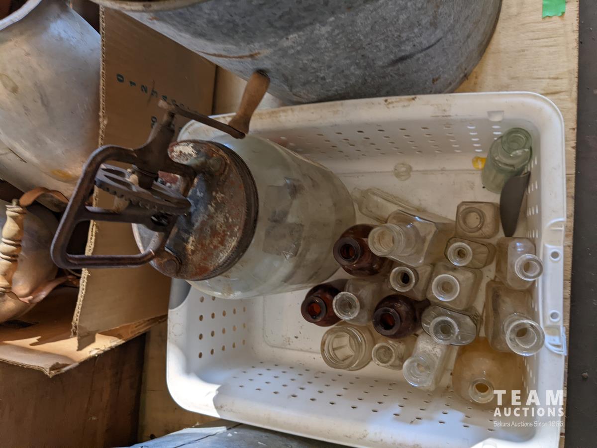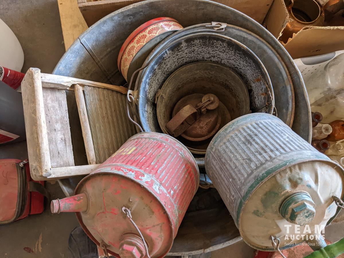 Tea pots, coffee pots, milk jugs, medicine bottles, metal gas cans, wash tub, glass wash board, hand crank butter churn