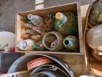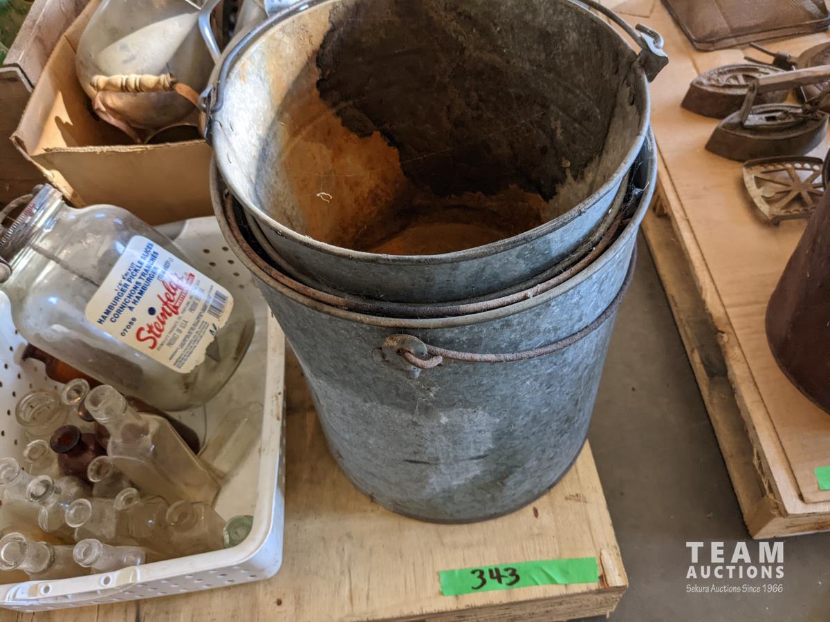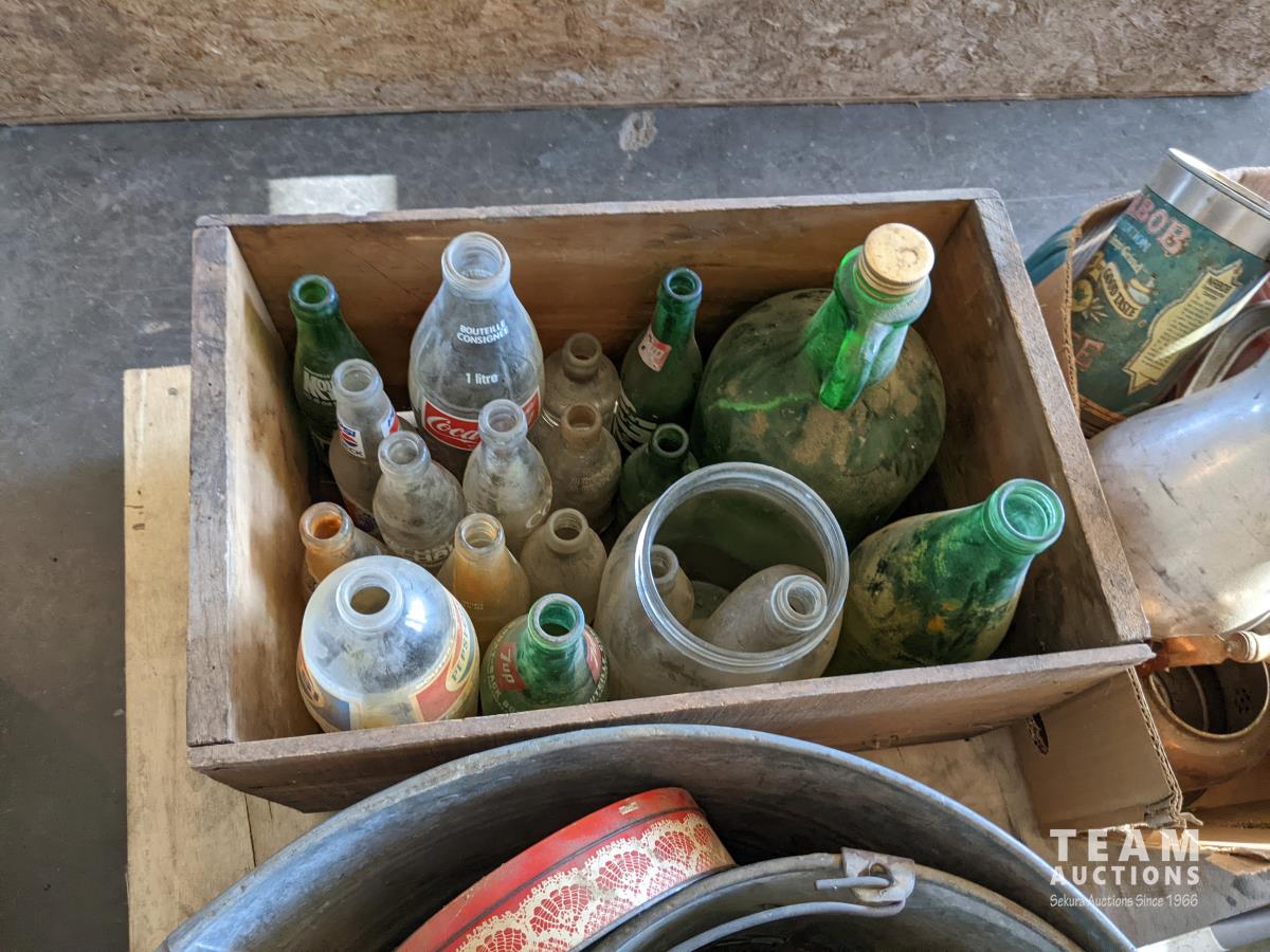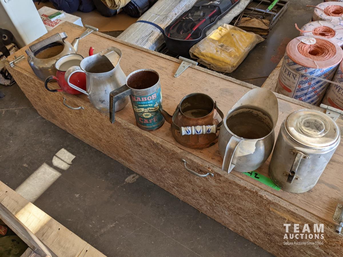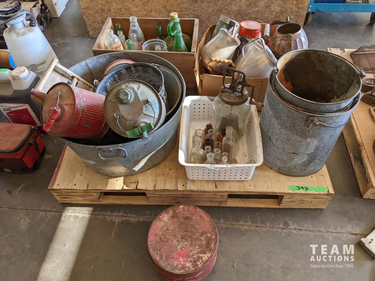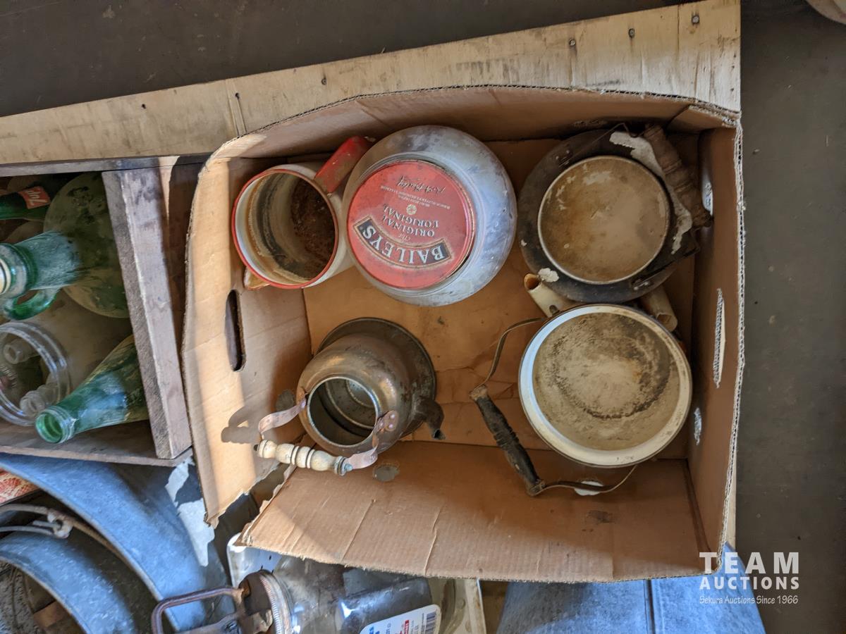 Tea pots, coffee pots, milk jugs, medicine bottles, metal gas cans, wash tub, glass wash board, hand crank butter churn