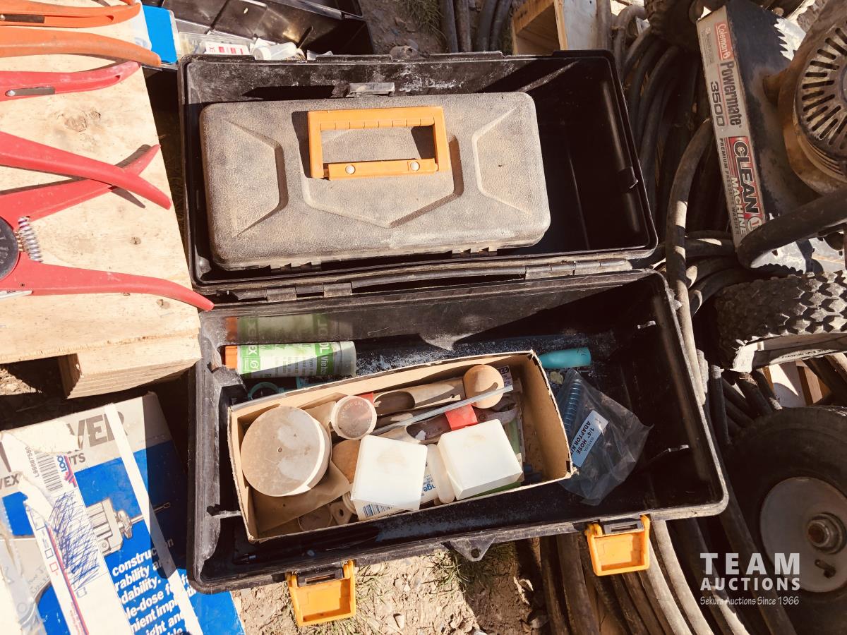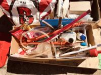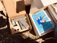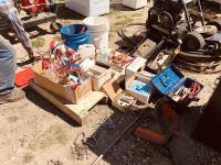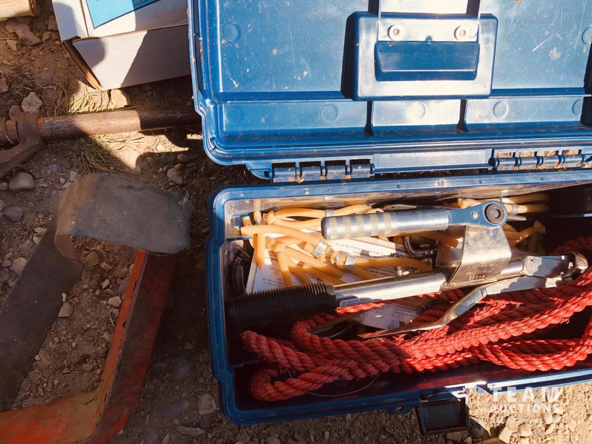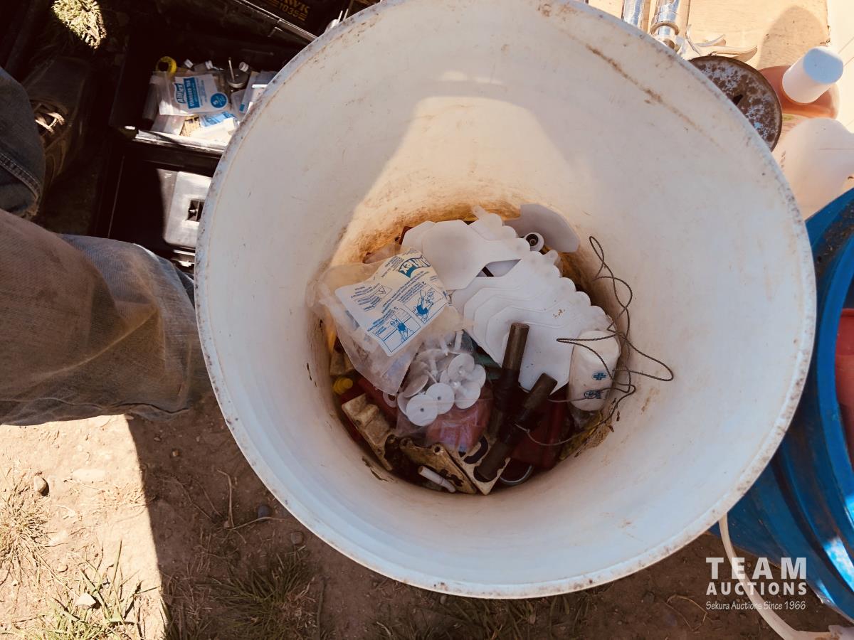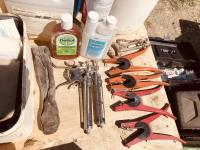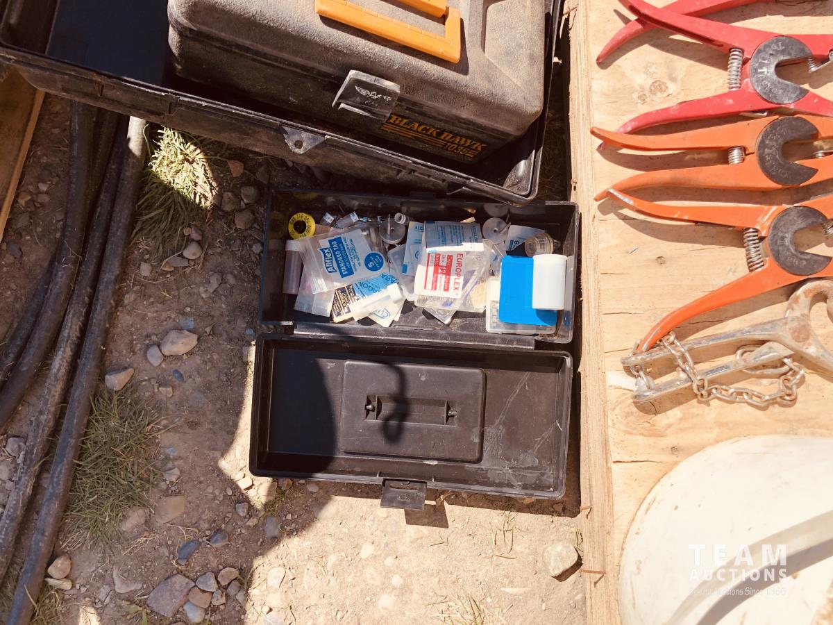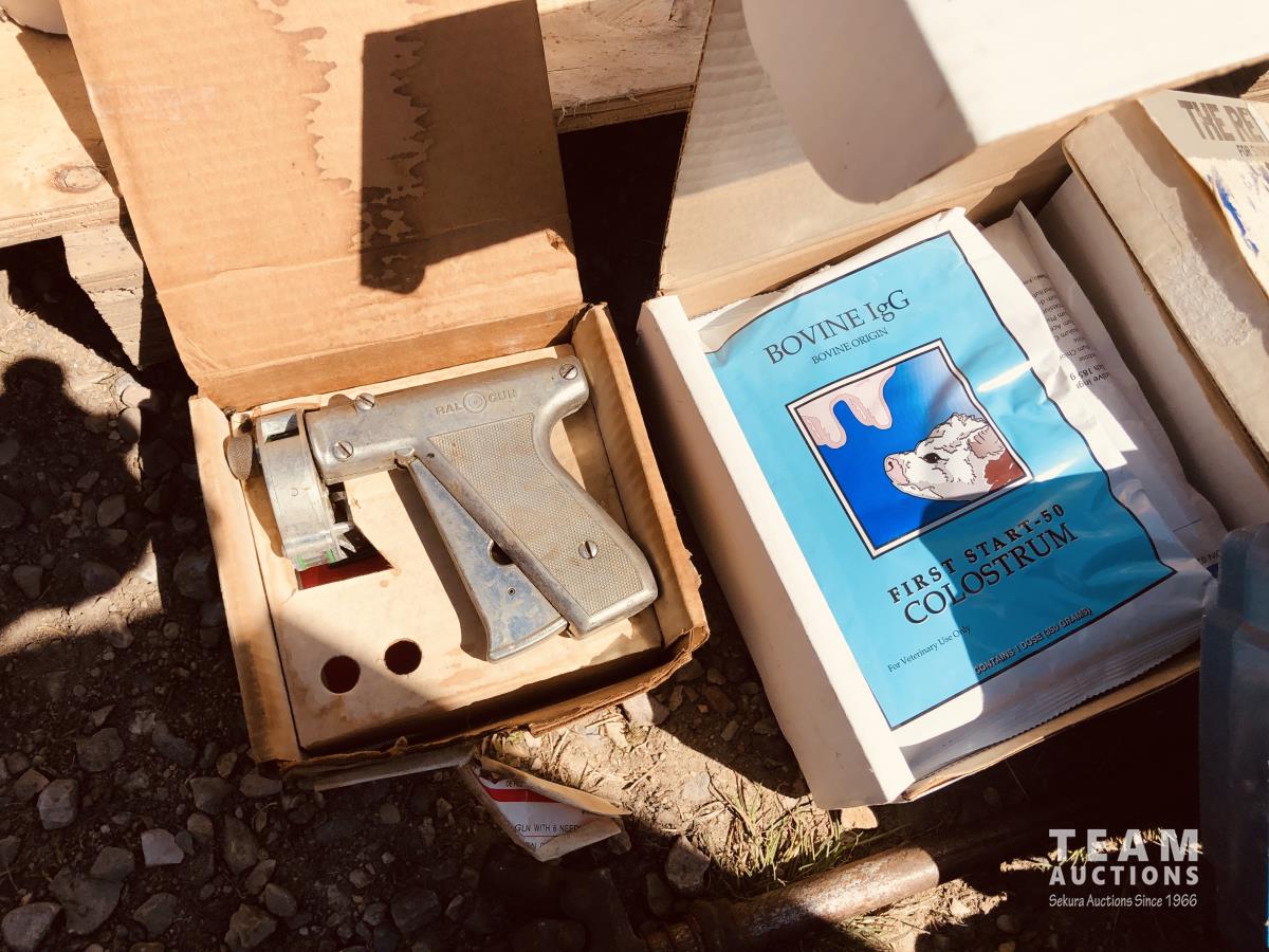 calf puller, taggers, syringes, needles, horse first aid kit, miscellaneous