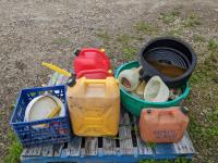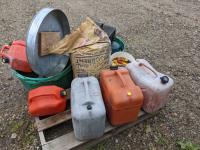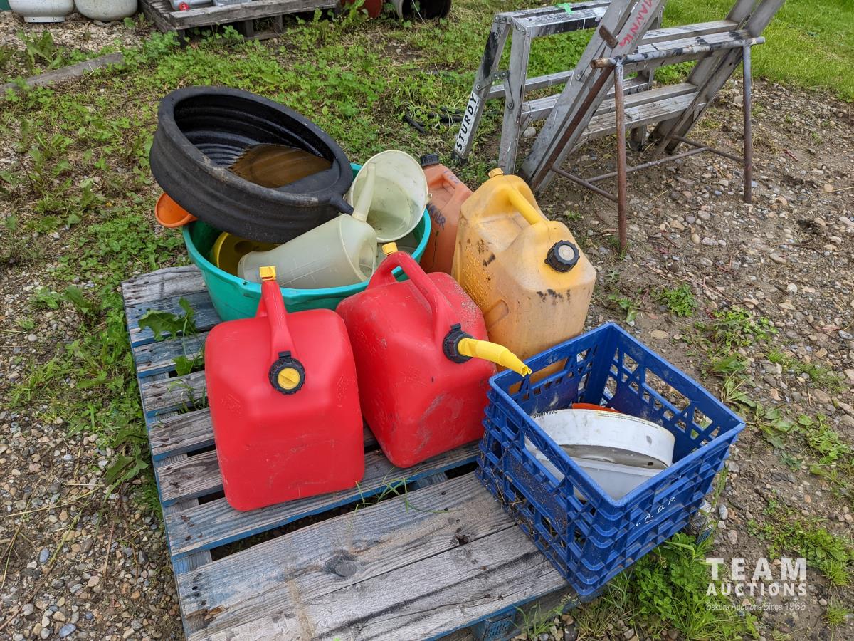 Sphag Sorb absorbent, oil drain pans, qty of Jerry cans, funnels, oil jugs, mineral tubs