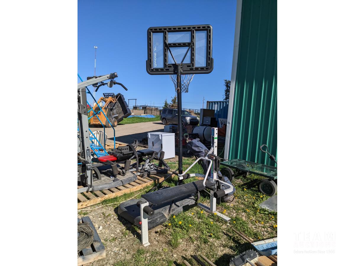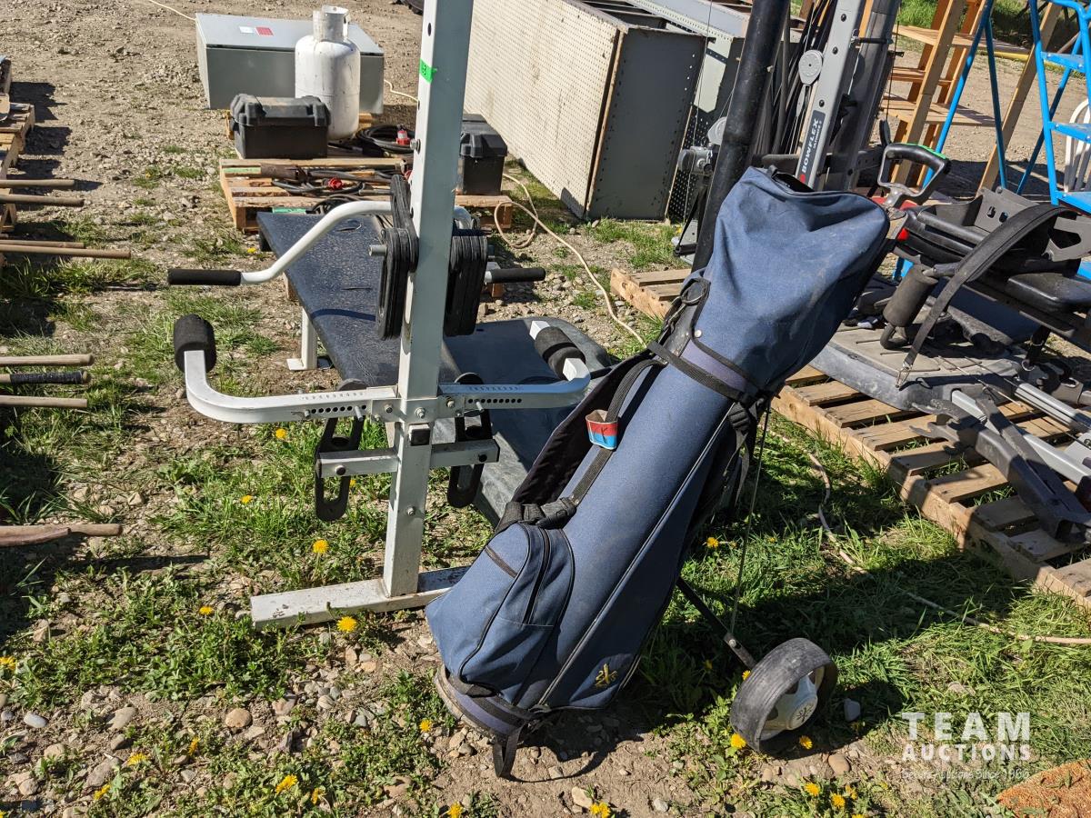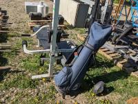 set of right hand golf clubs with pull cart, portable basket ball net, Power Flex 220 tension resistant bench