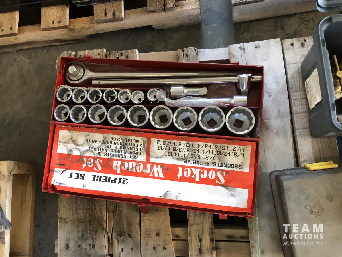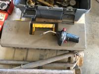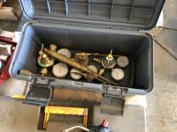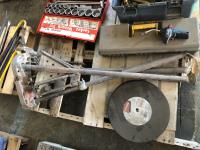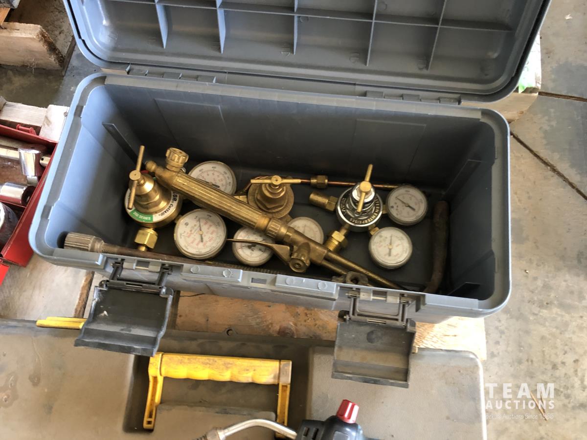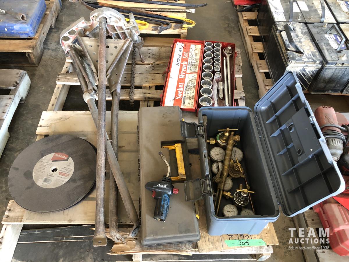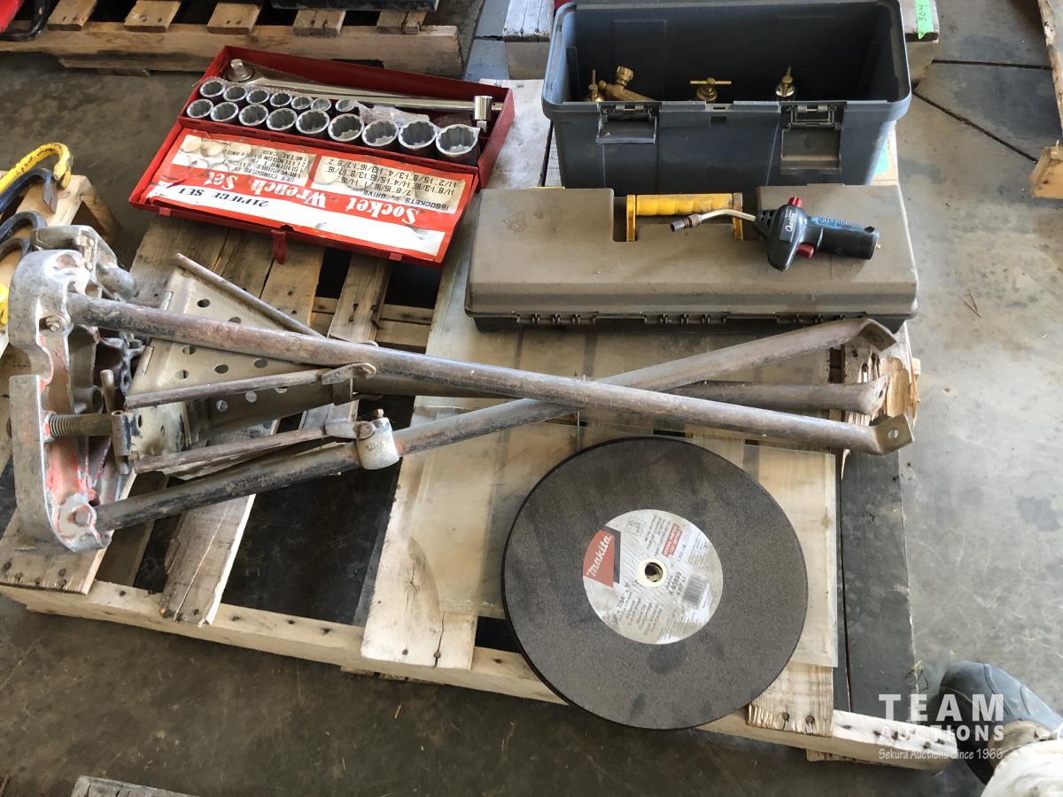 torch with gauges, (7) 14" chop saw blades, 3/4" socket set, pipe vise and stand, empty tool box