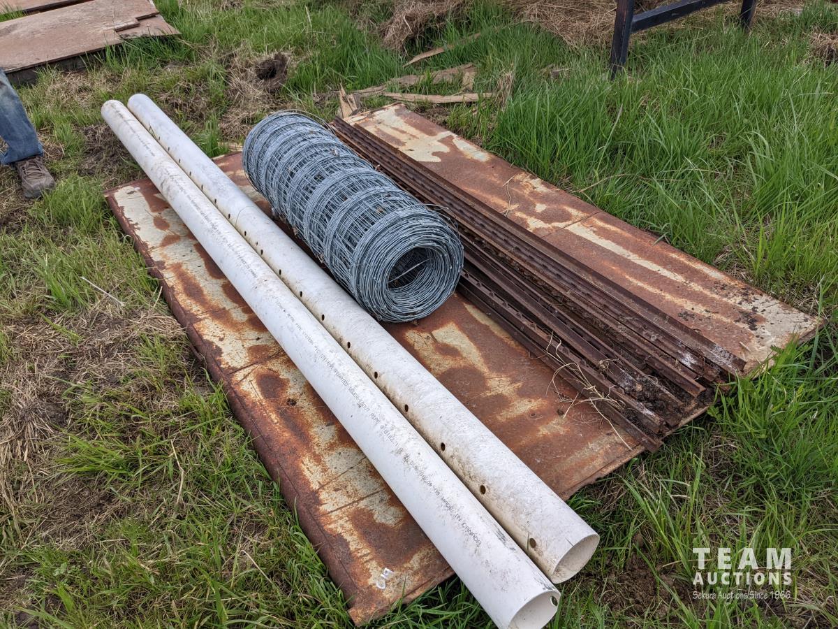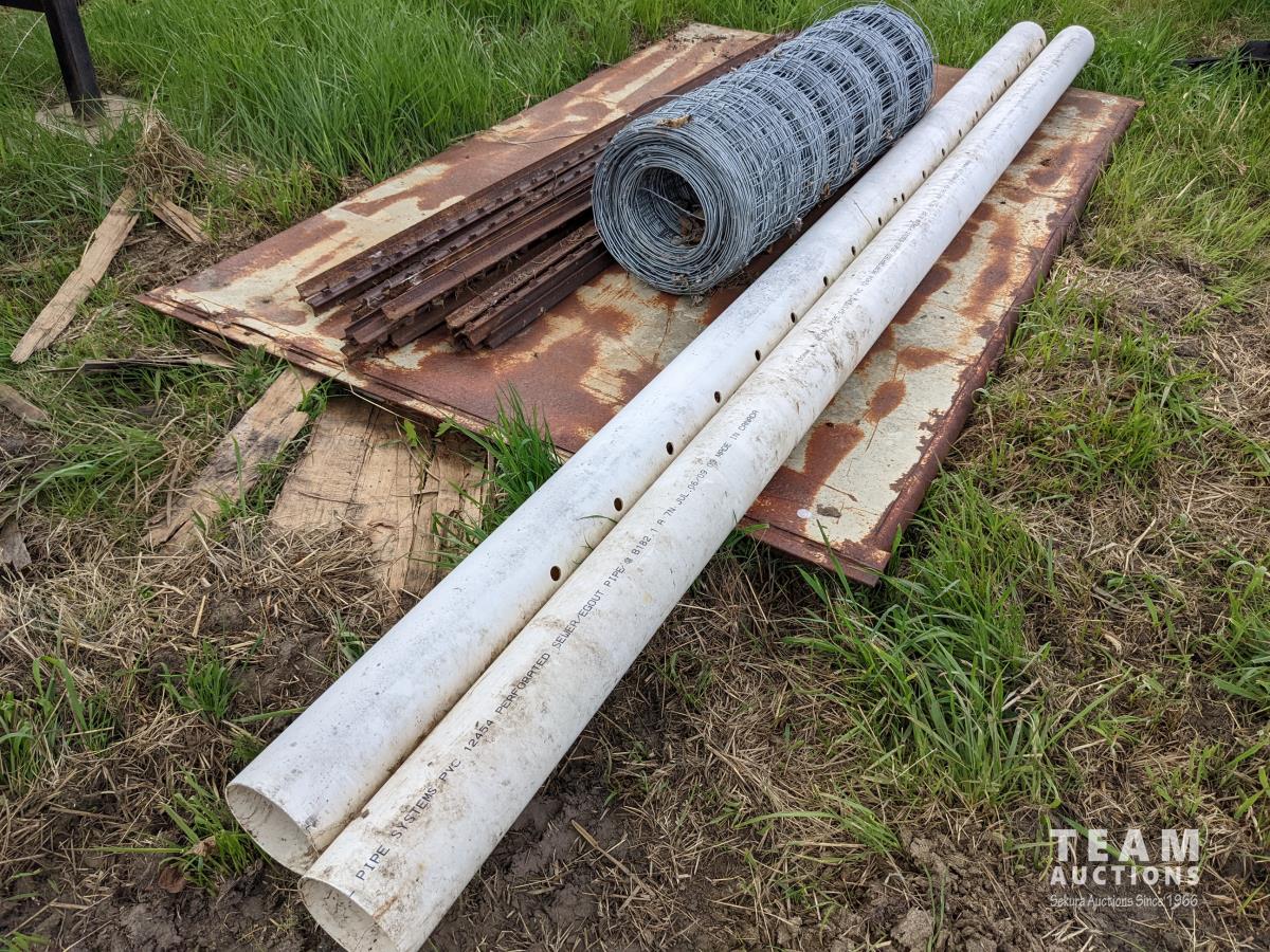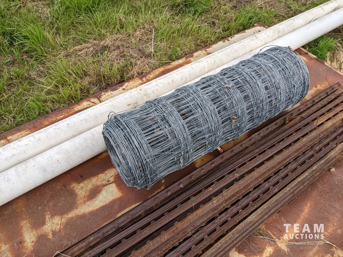 37 T Posts, Roll Page Wire, (2) 4 Inch Sewer Pipes, Large Metal Door