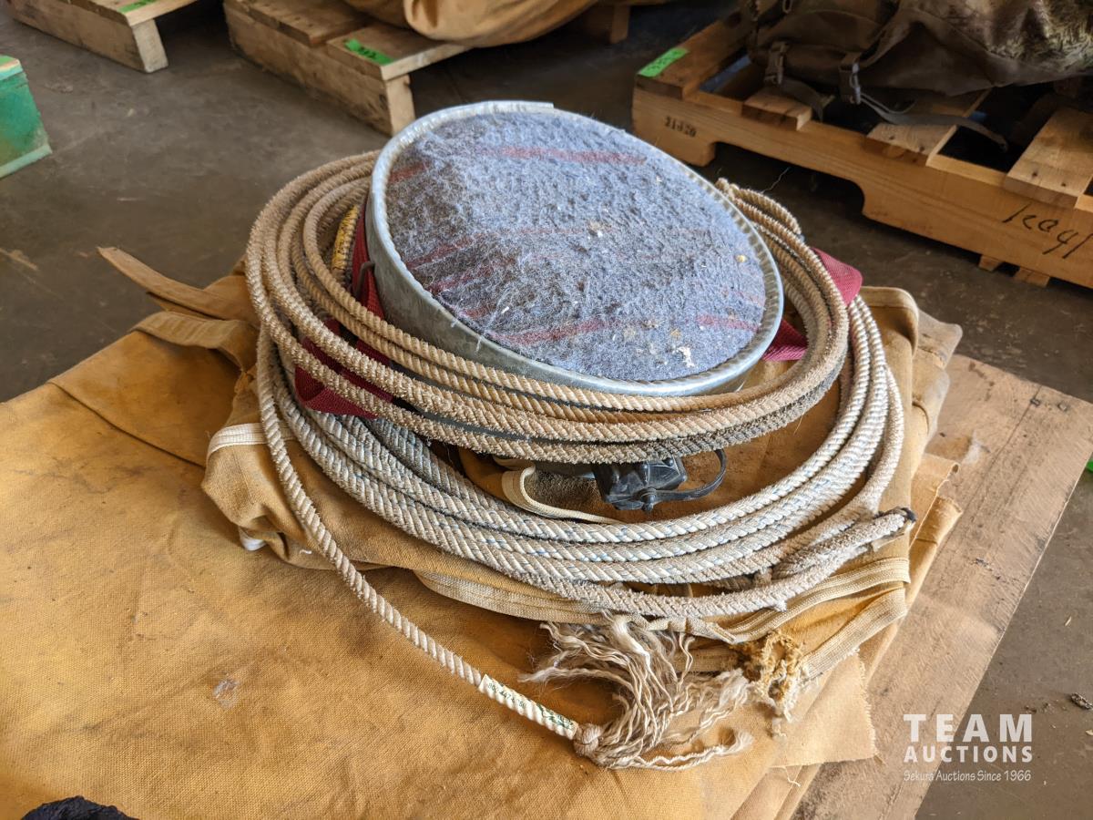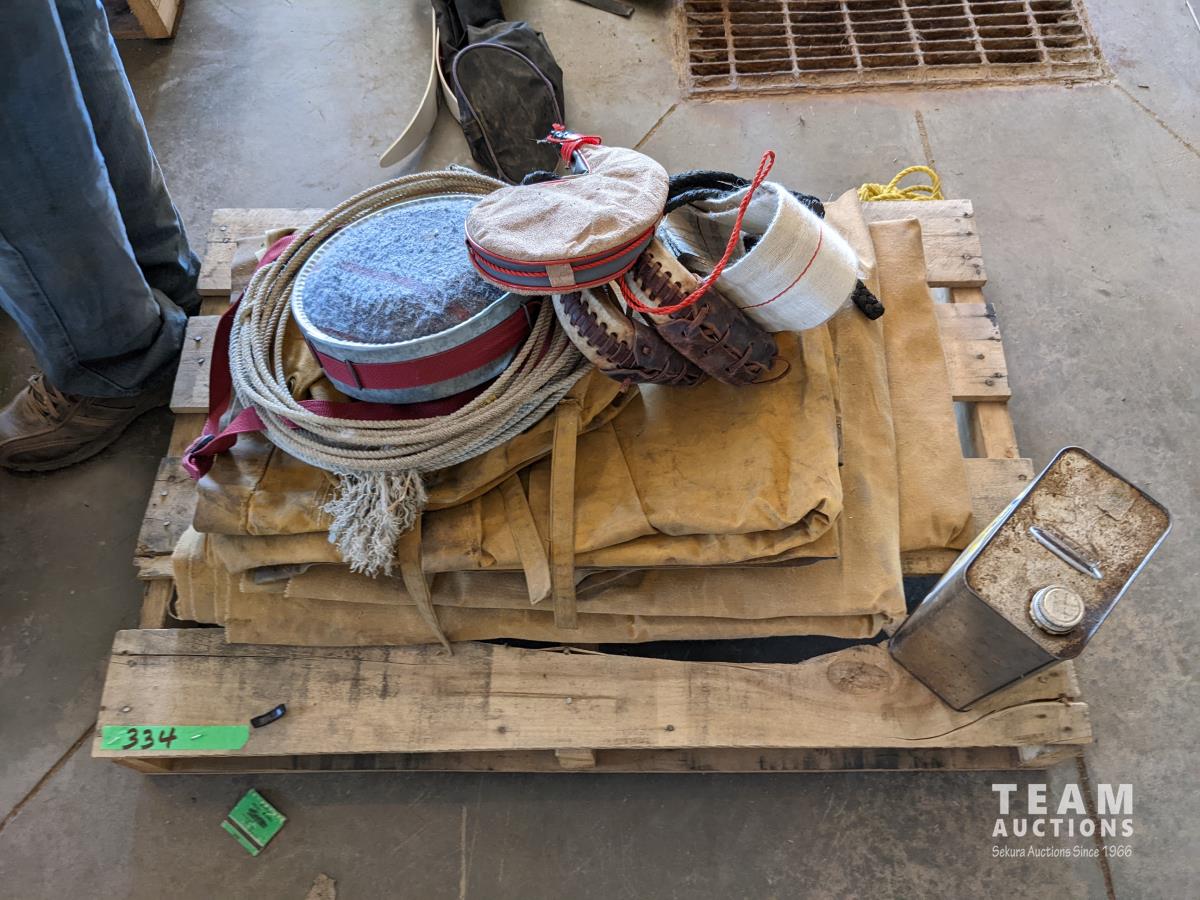 (4) Canvas tarps, canteen, wine skin, (2) lariat ropes, canvas saddle bags, over sized stirrups, part can of Neats foot oil