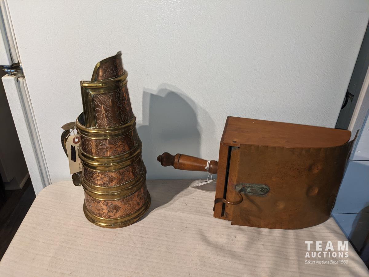 Coal shuttle, double handled cup, hammered dish, Mongolian tea pot, (4) pieces