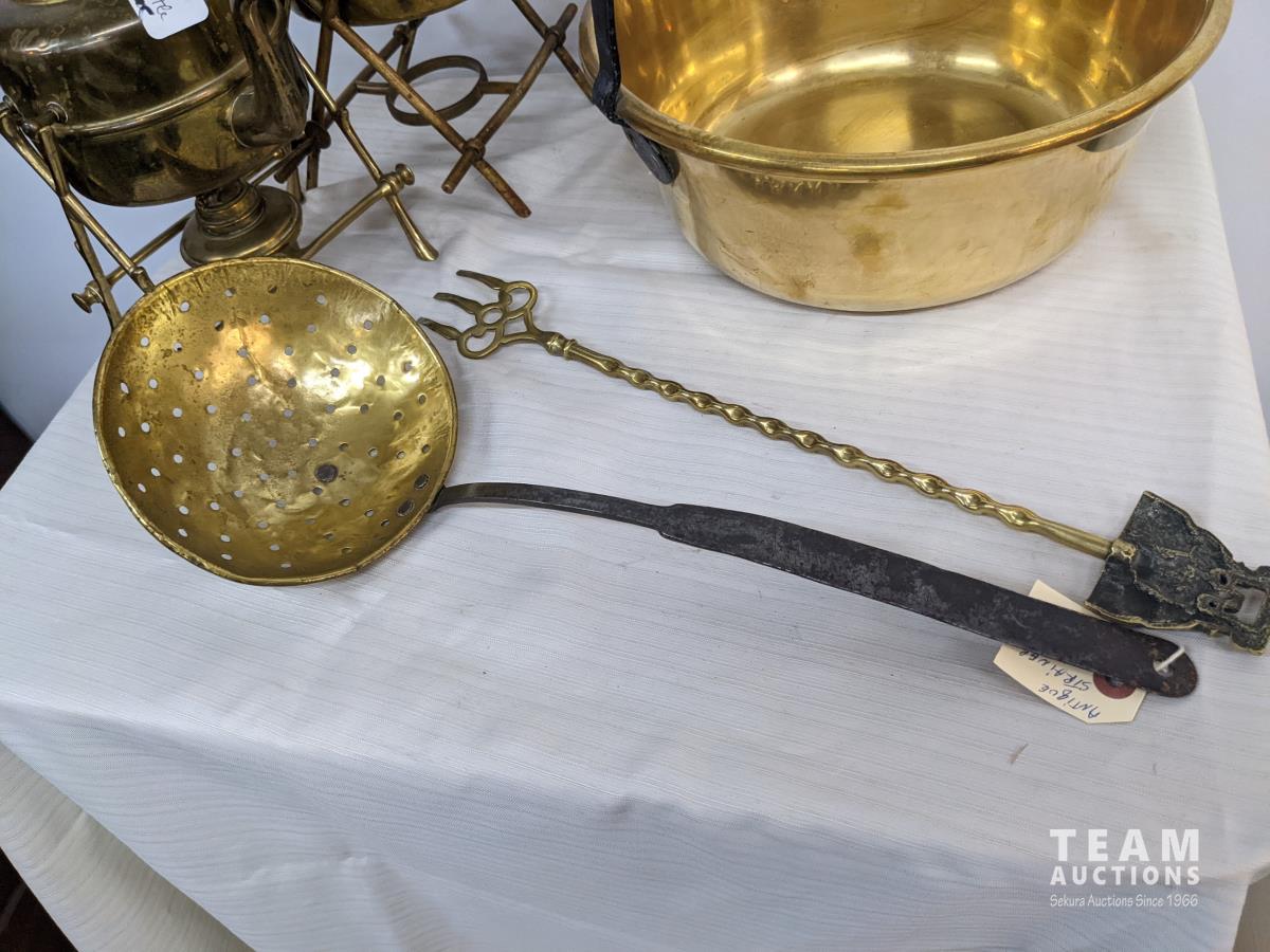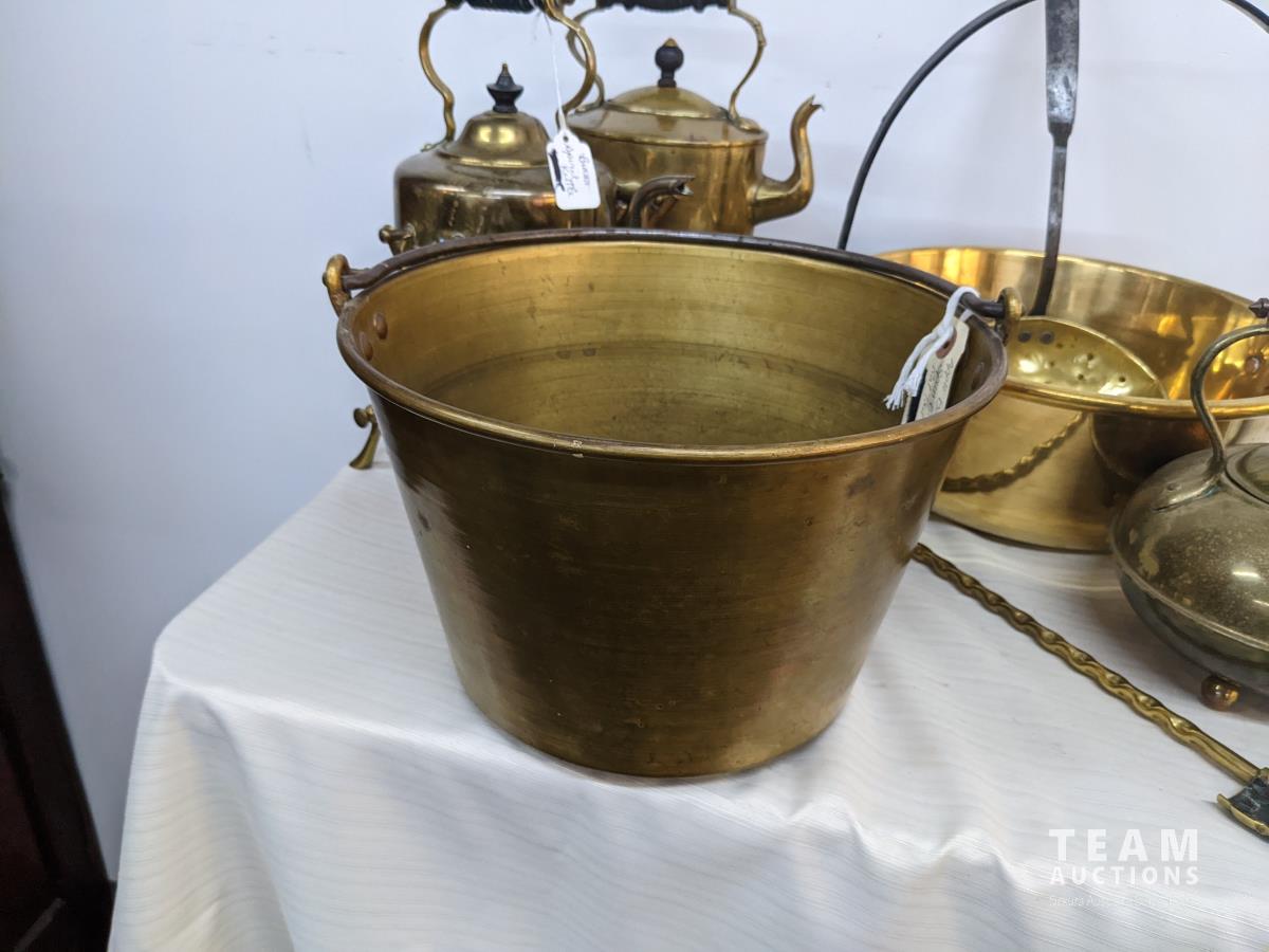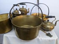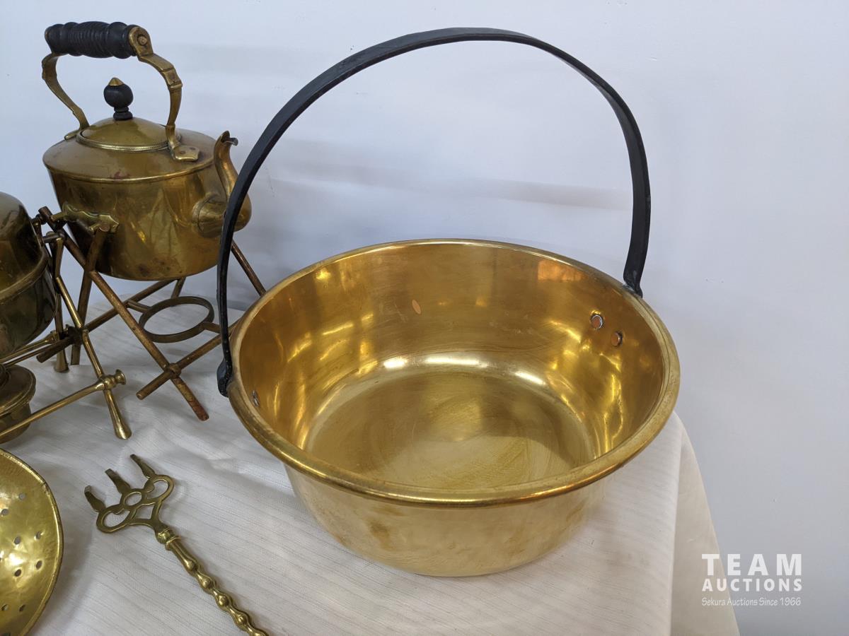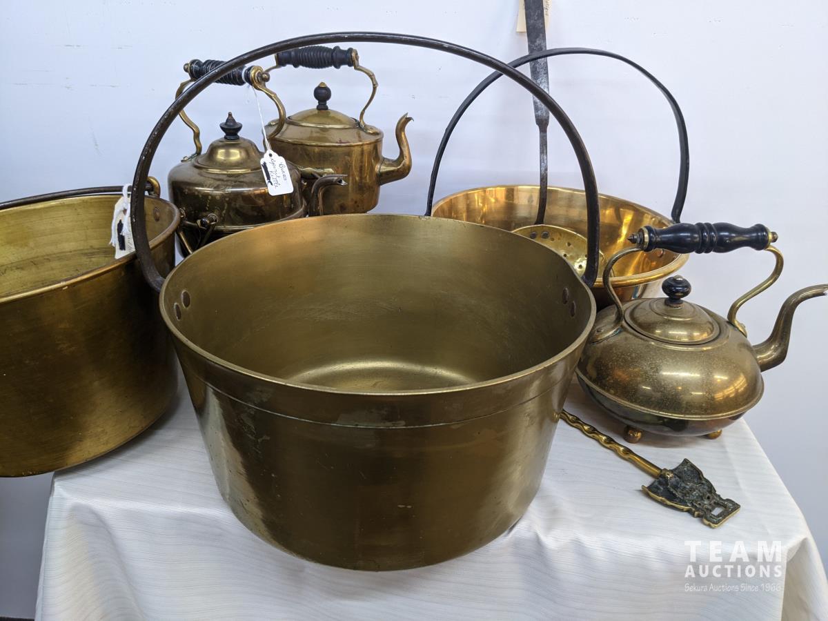 131 Large Brass Lot with Kitchen Jelly Pans, & Kettles