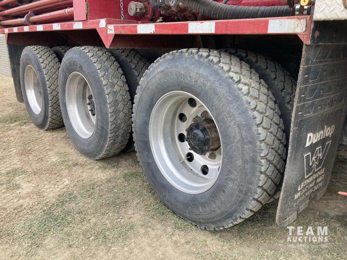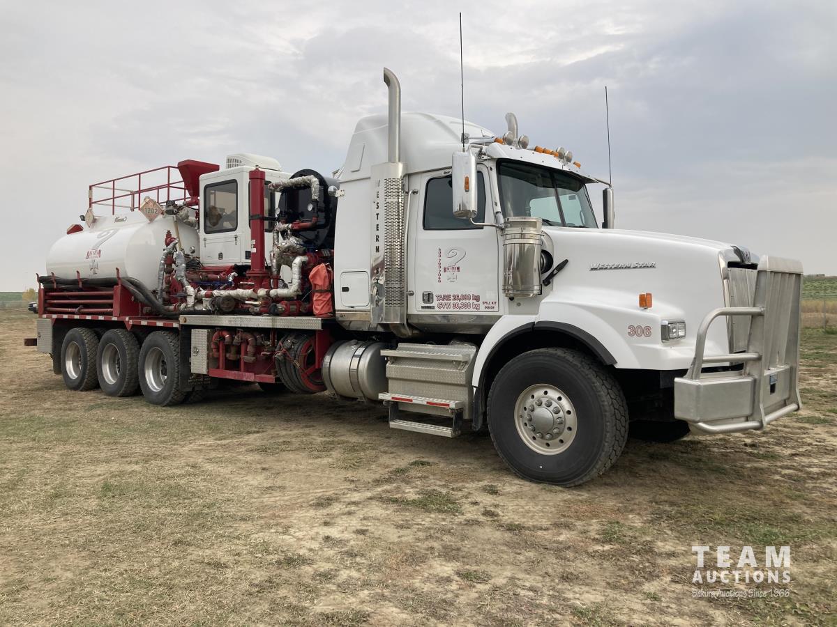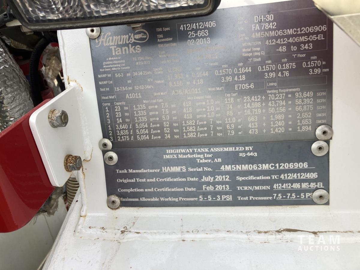 Detroit DD15, 14.8 L, 560 HP, diesel, engine brake, Allison 4700 OFS automatic transmission, Webasto heater, Meritor MFS20133A 20000 lb front, Meritor RZ166RSRS 66000 lb rears, 4.89 ratio, 305 WB, airliner air ride suspension, IMEX rig up, 2013 Hamm 9450 litre 3 compartment TC412/406 Tank, 2013 CW Manufacturing burner, 2013 ITB operator station w/controls & gauges, Weir SPM TWS600S 3.5 inch 10000 PSI triplex pump, Durco Mark3 3X2 centrifugal pump, 3 inch T&E pump, Mobiled Tatech computer, hose reel, aluminum wheels, 36 inch sleeper, 445/65R22.5 front, 11R24.5 rear