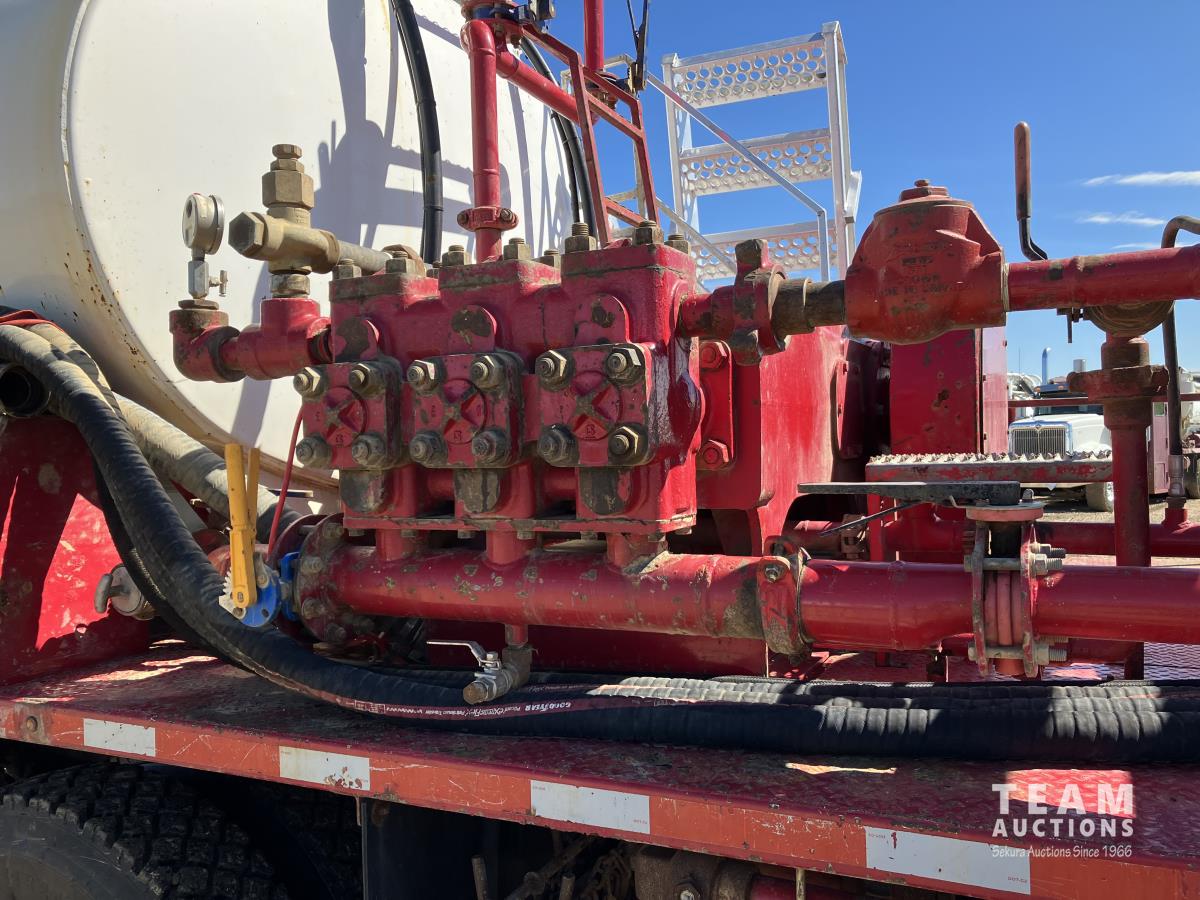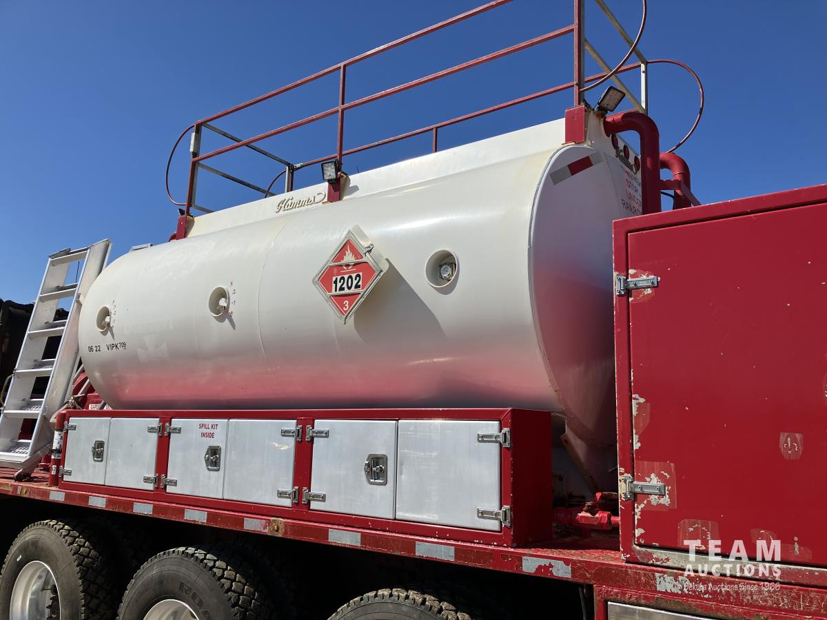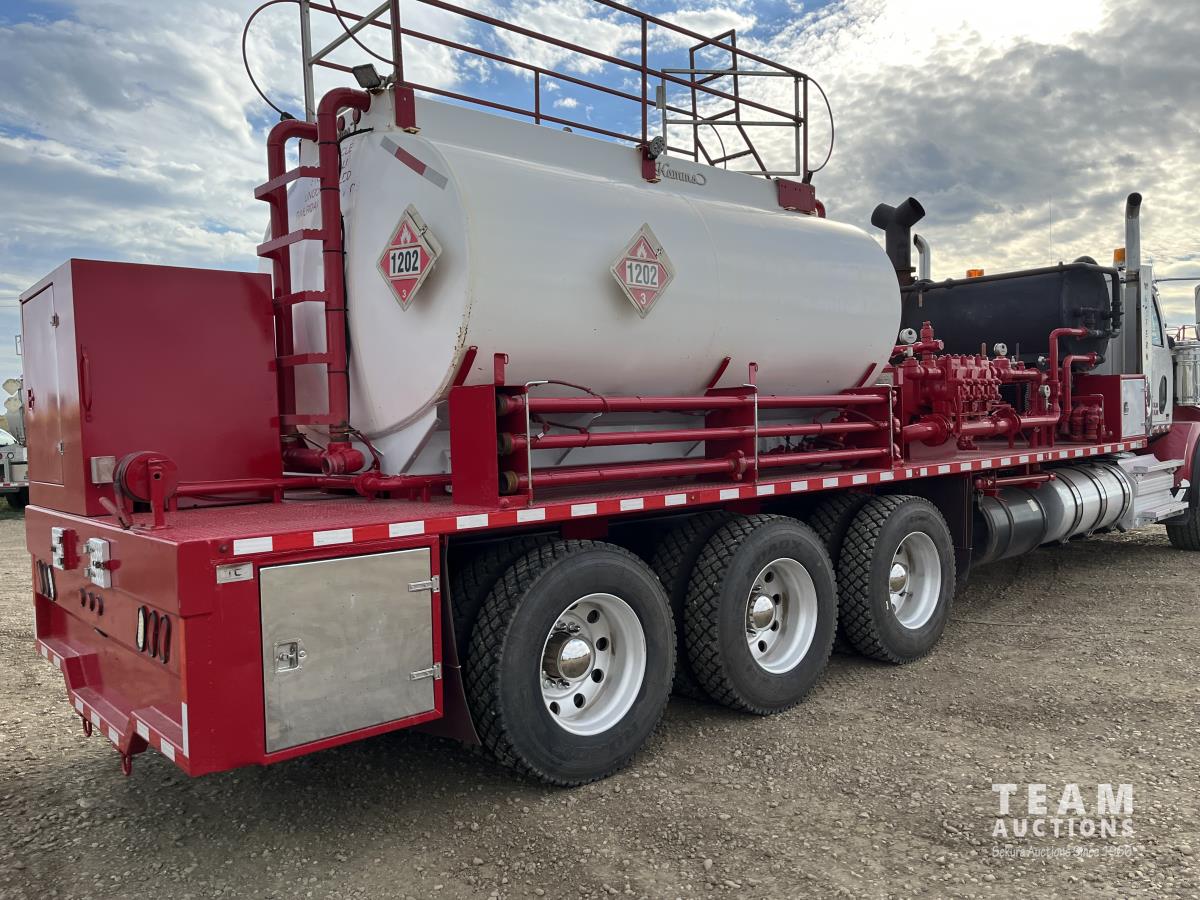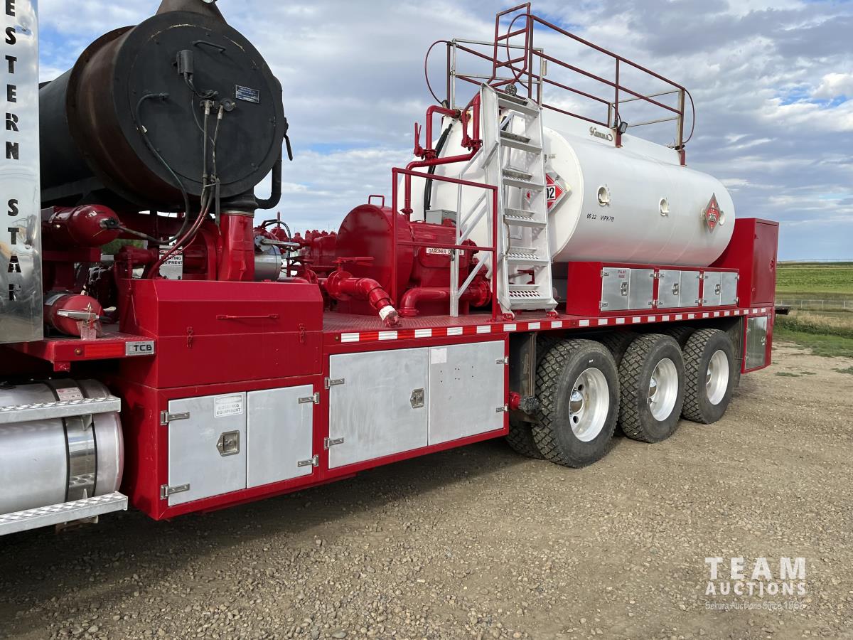 Detroit DD15, 14.8 560 HP diesel, Eaton Fuller 18 speed, triple differential lock w/ cross lock, 20,000 lb front, 53,250 lb rear, 300 inch WB, double frame, TCB rig up, Fabmaster burner, 2012 Hamms 10,350 litre 3 compartment tank, TC412 spec, Gardner Denver TEEF 3 inch triplex pump, Durco Mark 3 3X@ centrifugal pump, Panasonic CF-53 computer, external operator staion w/ controls & gauges, air ride suspension, aluminum wheels, 445/65R22.5 front, 11R24.5 rear