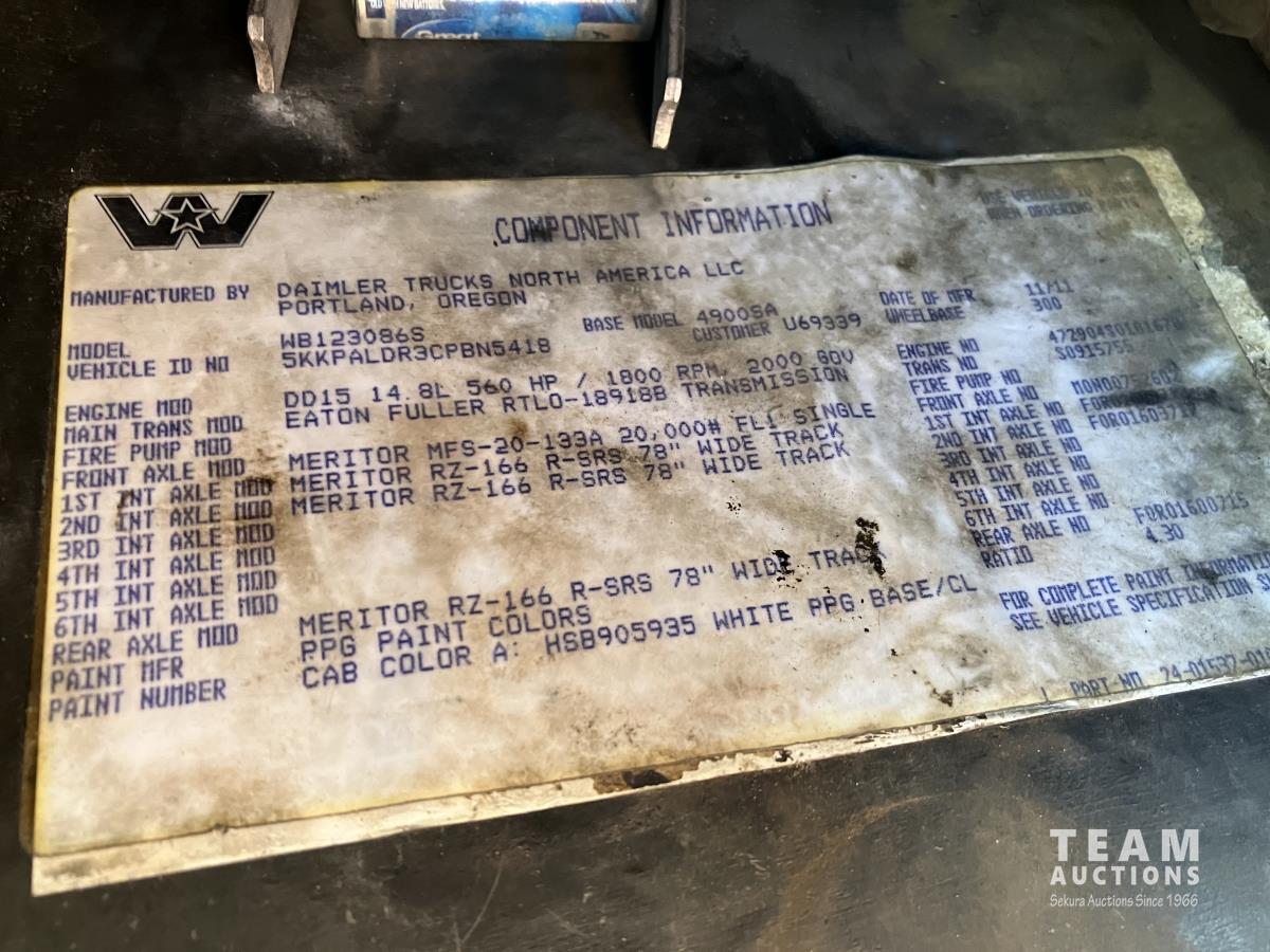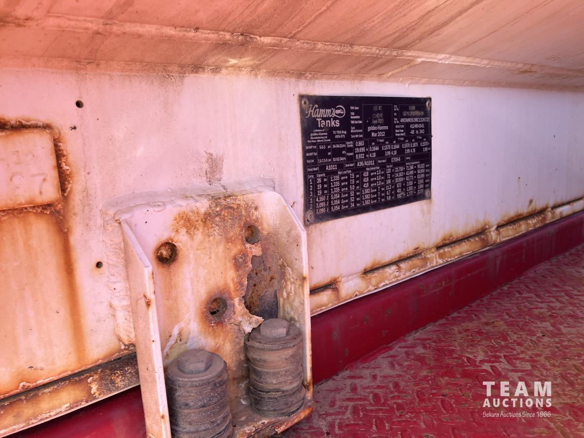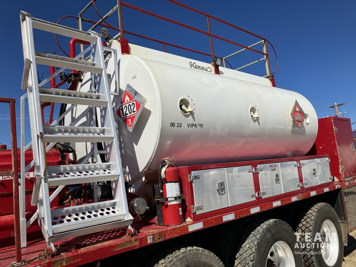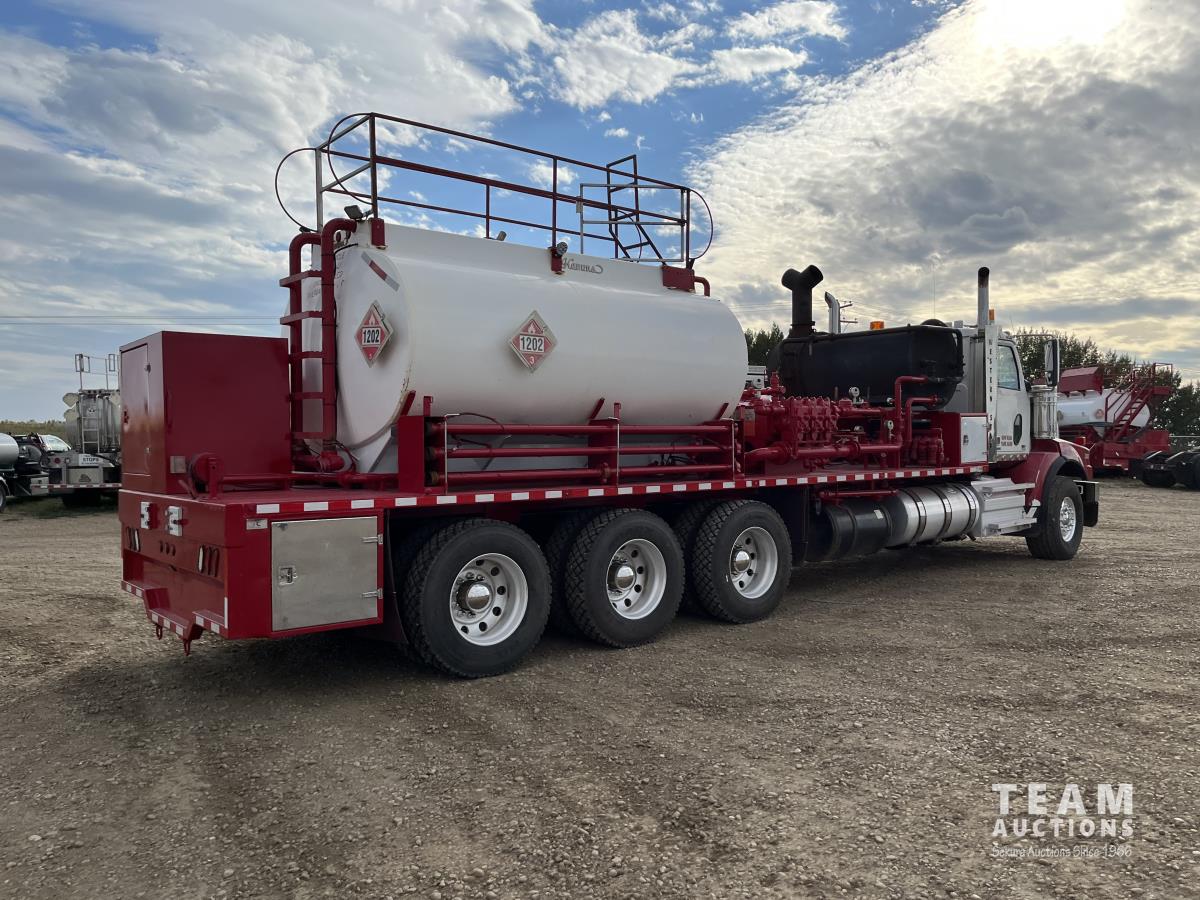 Detroit DD15, 14.8 560 HP diesel, Eaton Fuller 18 speed, triple differential lock w/ cross lock, 20,000 lb front, 53,250 lb rear, 300 inch WB, double frame, TCB rig up, Fabmaster burner, 2012 Hamms 10,350 litre 3 compartment tank, TC412 spec, Gardner Denver TEEF 3 inch triplex pump, Durco Mark 3 3X@ centrifugal pump, Panasonic CF-53 computer, external operator staion w/ controls & gauges, air ride suspension, aluminum wheels, 445/65R22.5 front, 11R24.5 rear