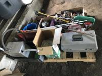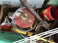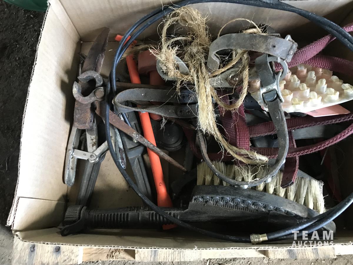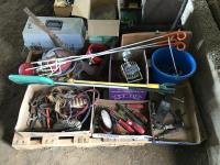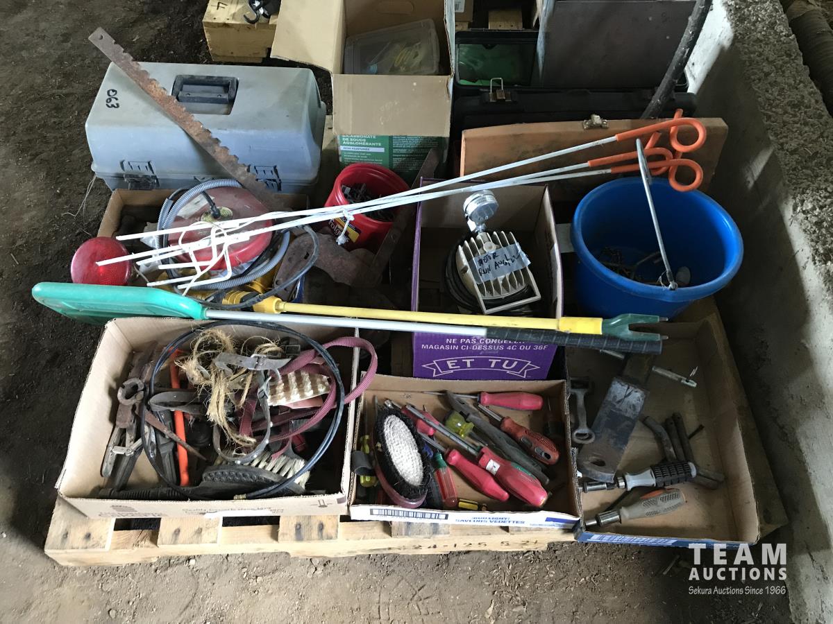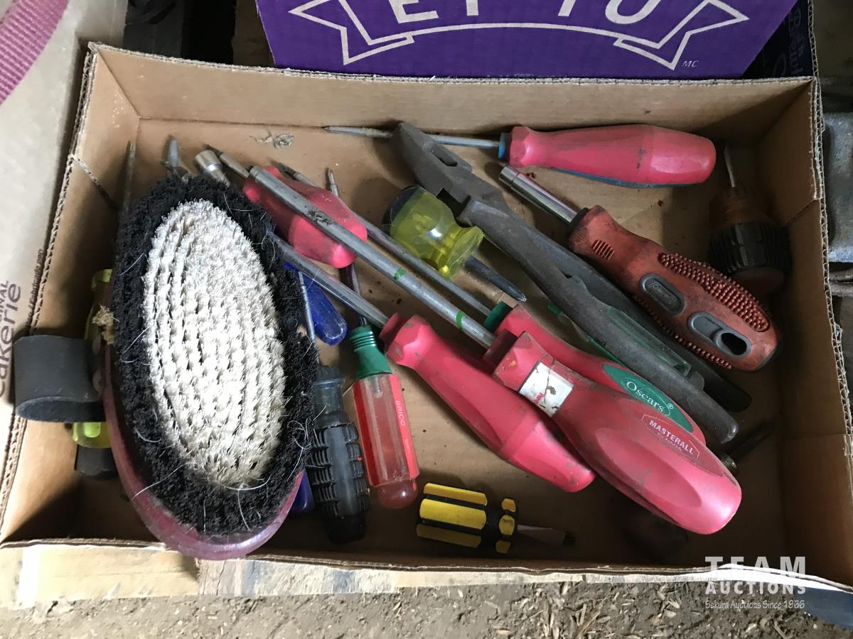 Wire stretcher, water tank heater, animal tac kit, shut off valve with float, electric fence post, air compressor, assortment of screw drivers