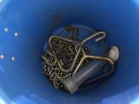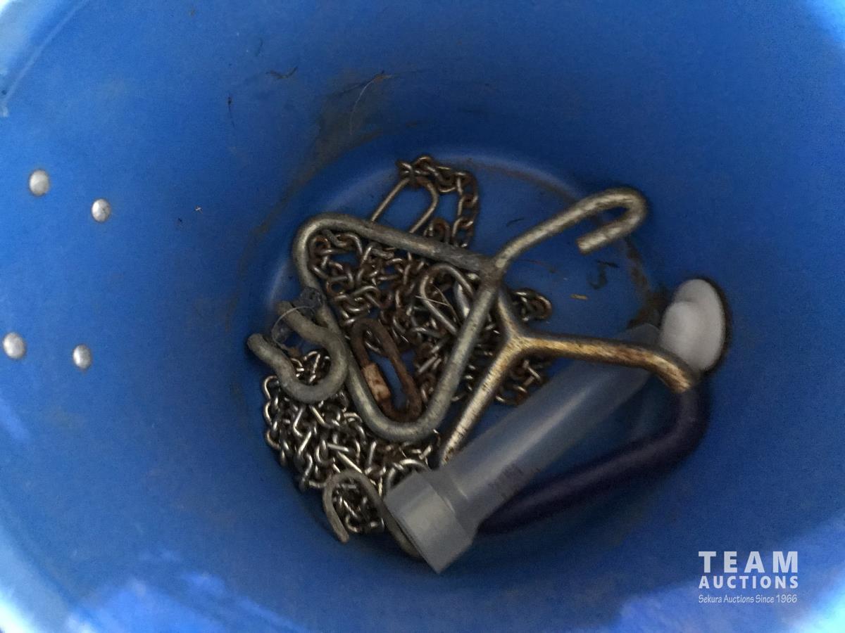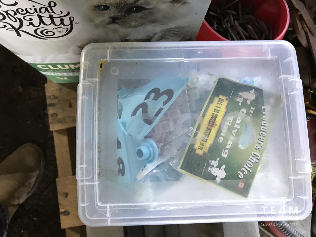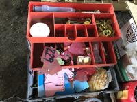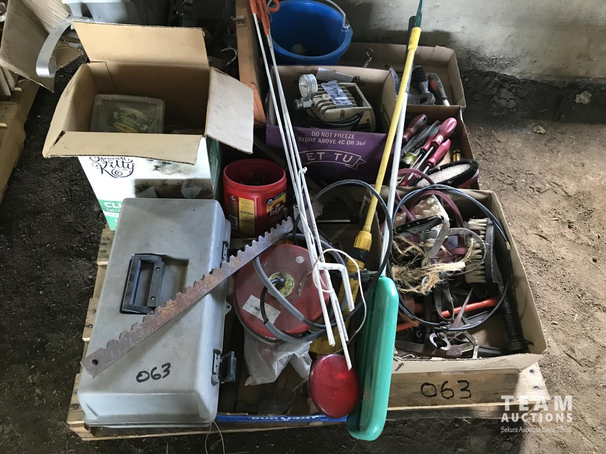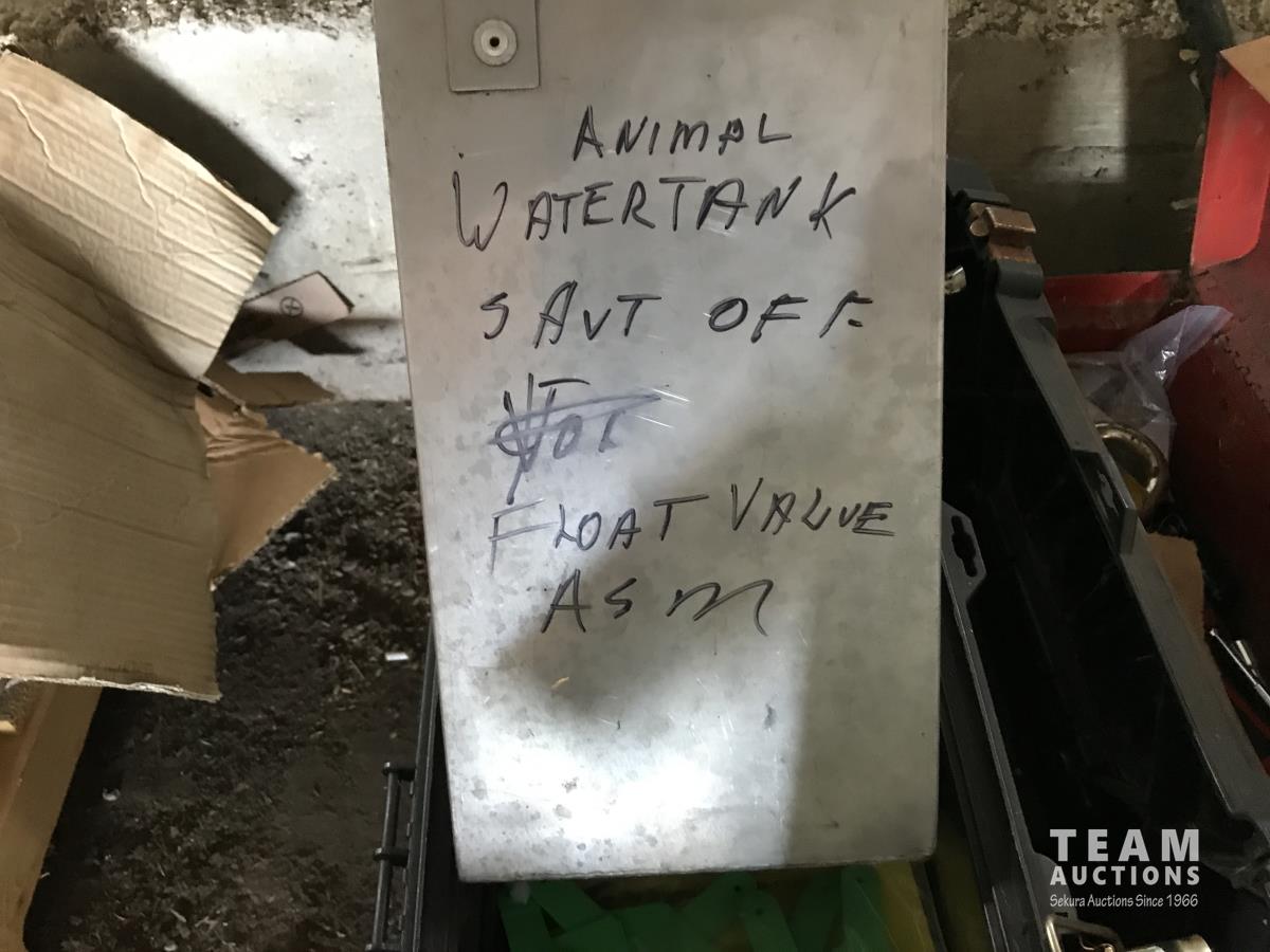 Wire stretcher, water tank heater, animal tac kit, shut off valve with float, electric fence post, air compressor, assortment of screw drivers