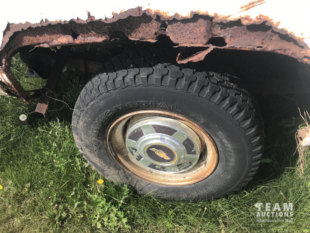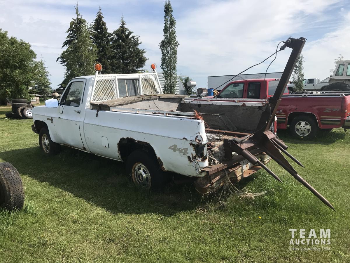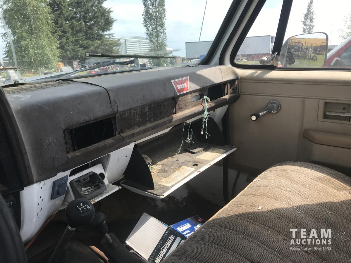 4 speed, bench seat, tool box, Warn winch, bale forks, headache rack, 235/85R16, hood does not open
