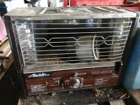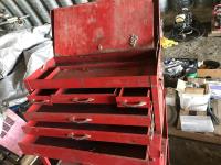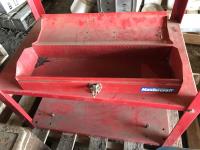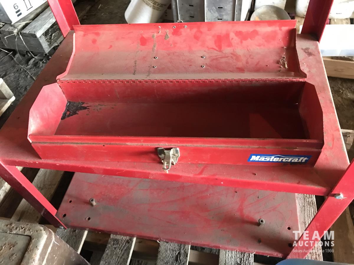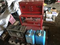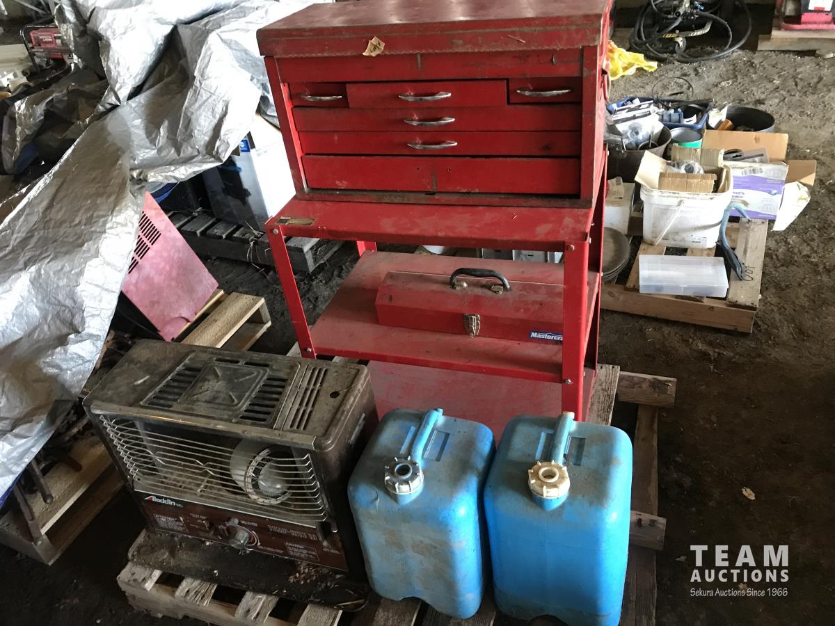 Tool box, (2) water jug's, 2 level metal shelf & space heater
