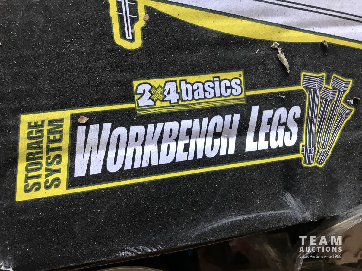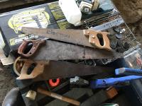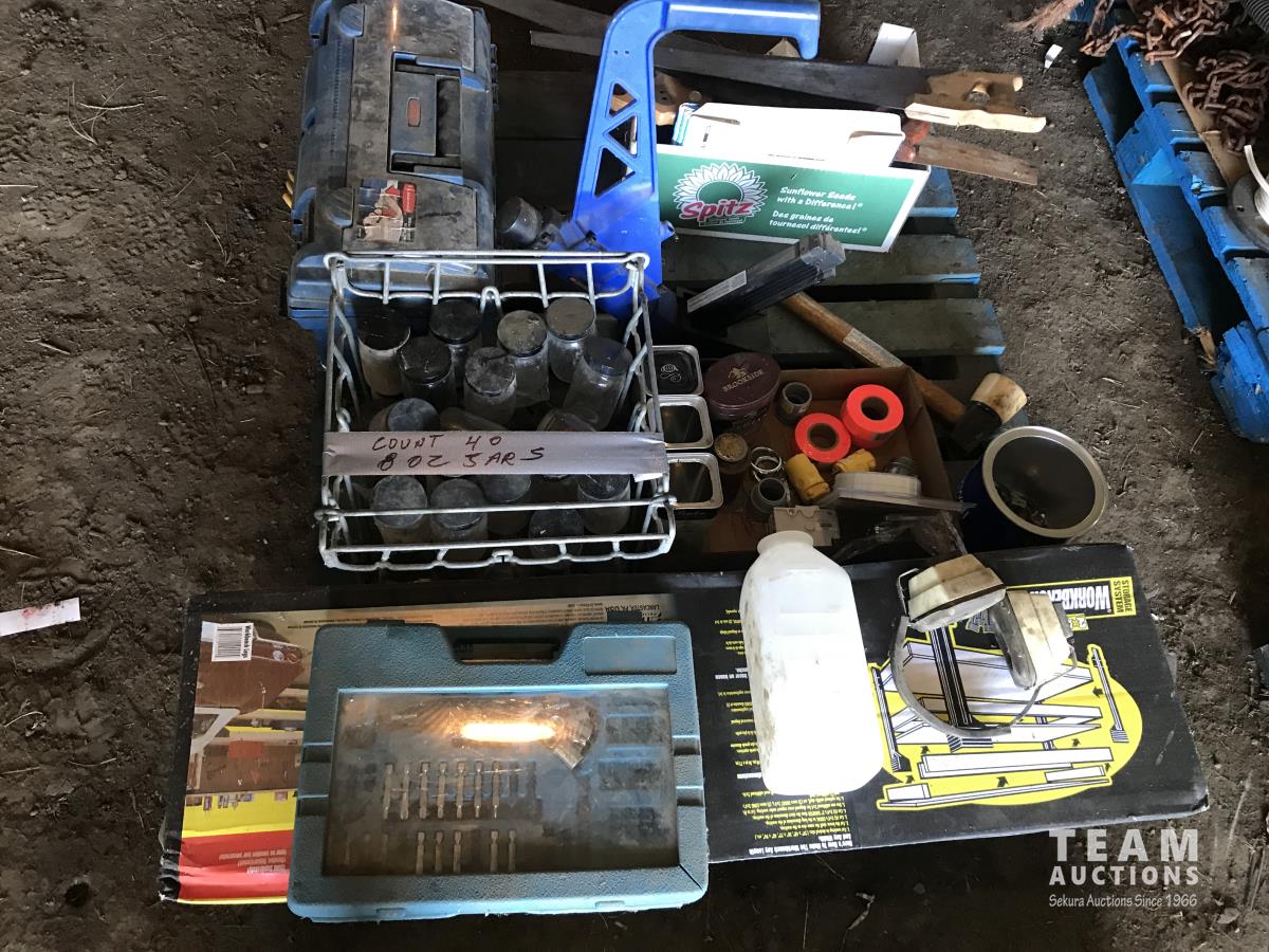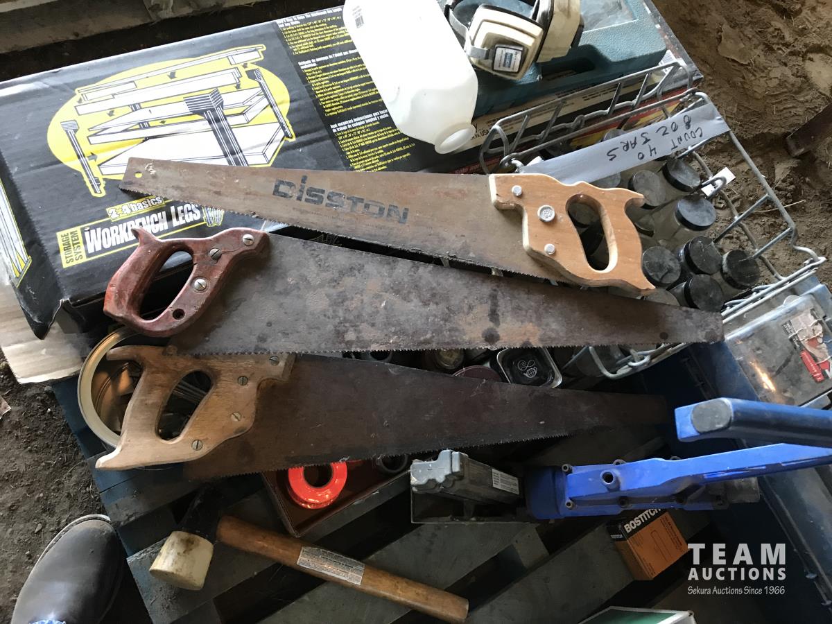 Work bench legs, tool box, assortment of sand paper, qty of glass jars & (3) hand saws