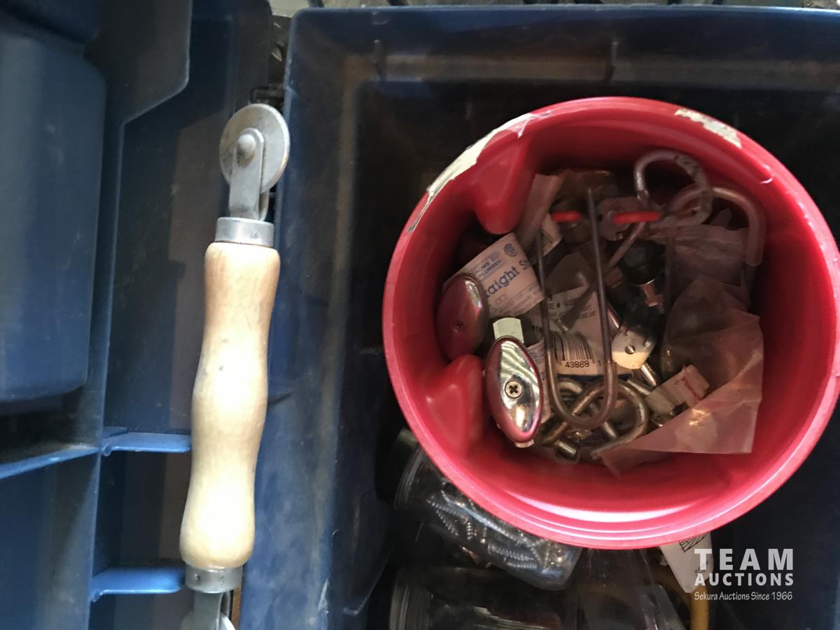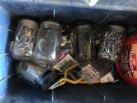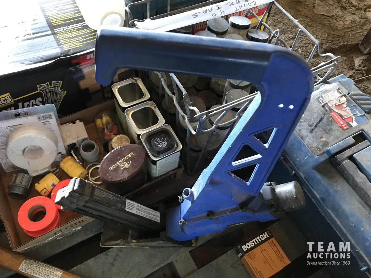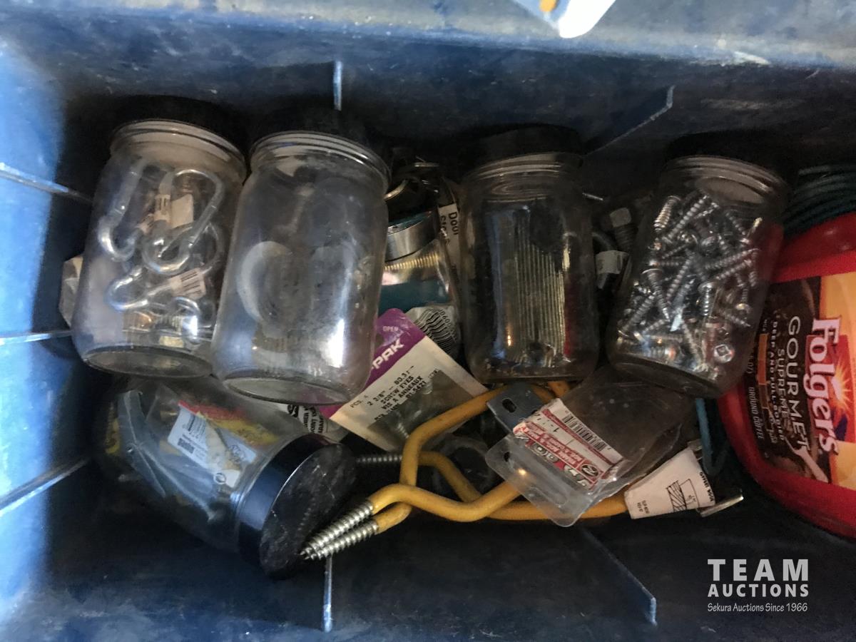 Work bench legs, tool box, assortment of sand paper, qty of glass jars & (3) hand saws