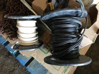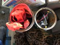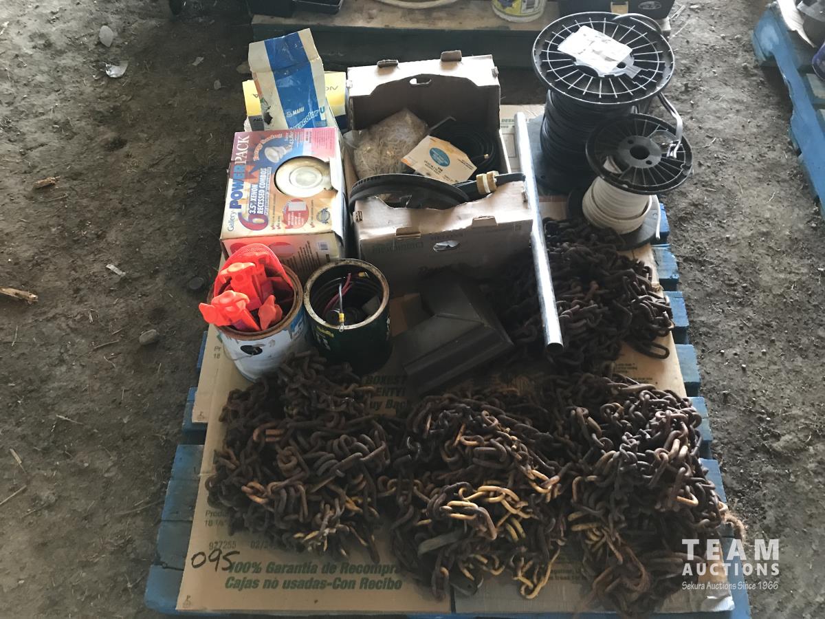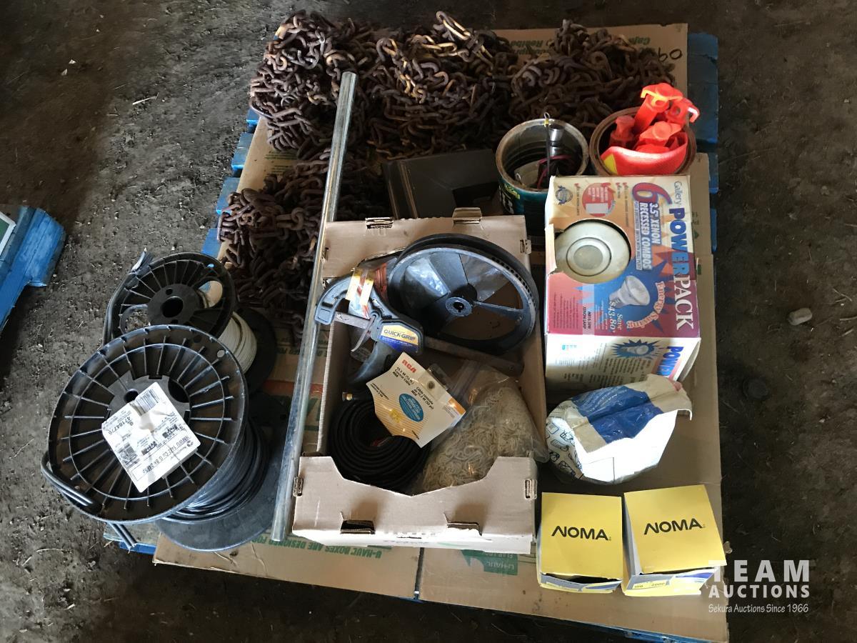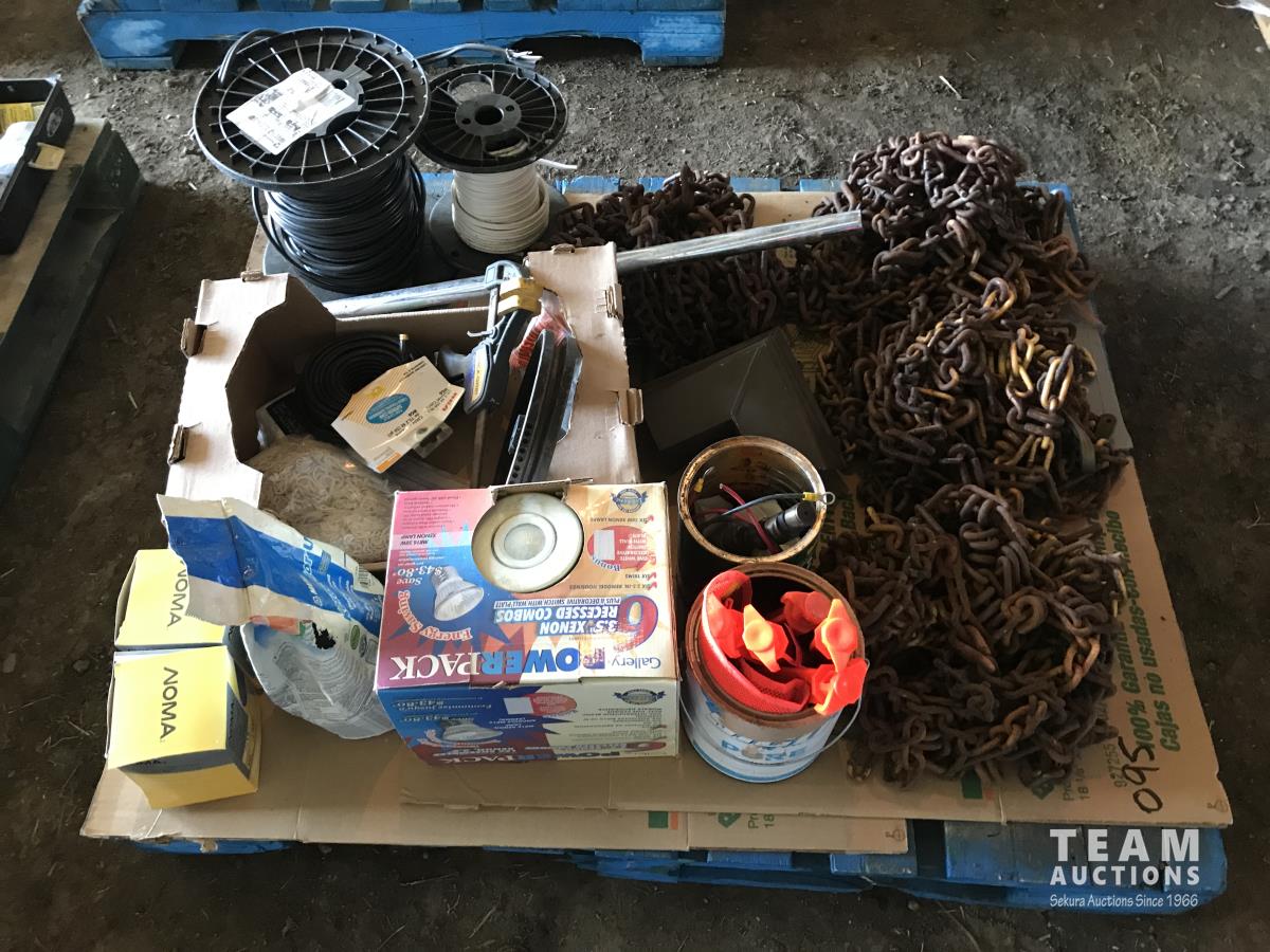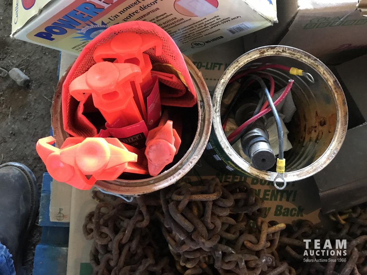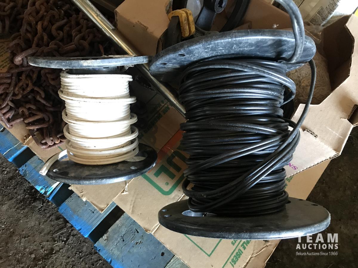 Qty of tire chains, (2) part rolls of electrical wire, clamps, poly ground stakes & assortment of lights