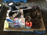 Qty of tire chains, (2) part rolls of electrical wire, clamps, poly ground stakes & assortment of lights