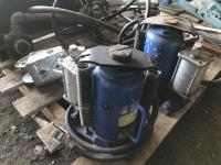 (2) 20 ton pneumatic bottle jack's, hand winch, drill, wrench set, assorted tools & drill press stand