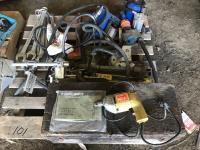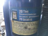 (2) 20 ton pneumatic bottle jack's, hand winch, drill, wrench set, assorted tools & drill press stand