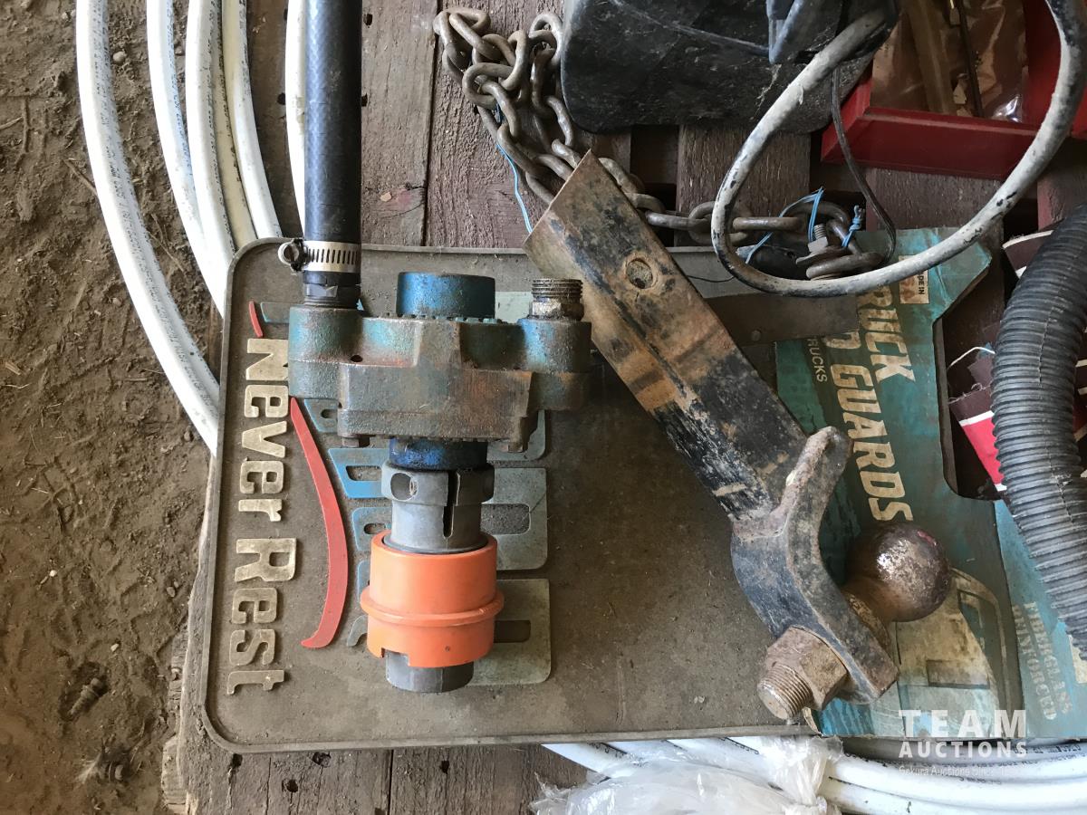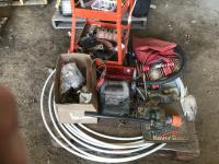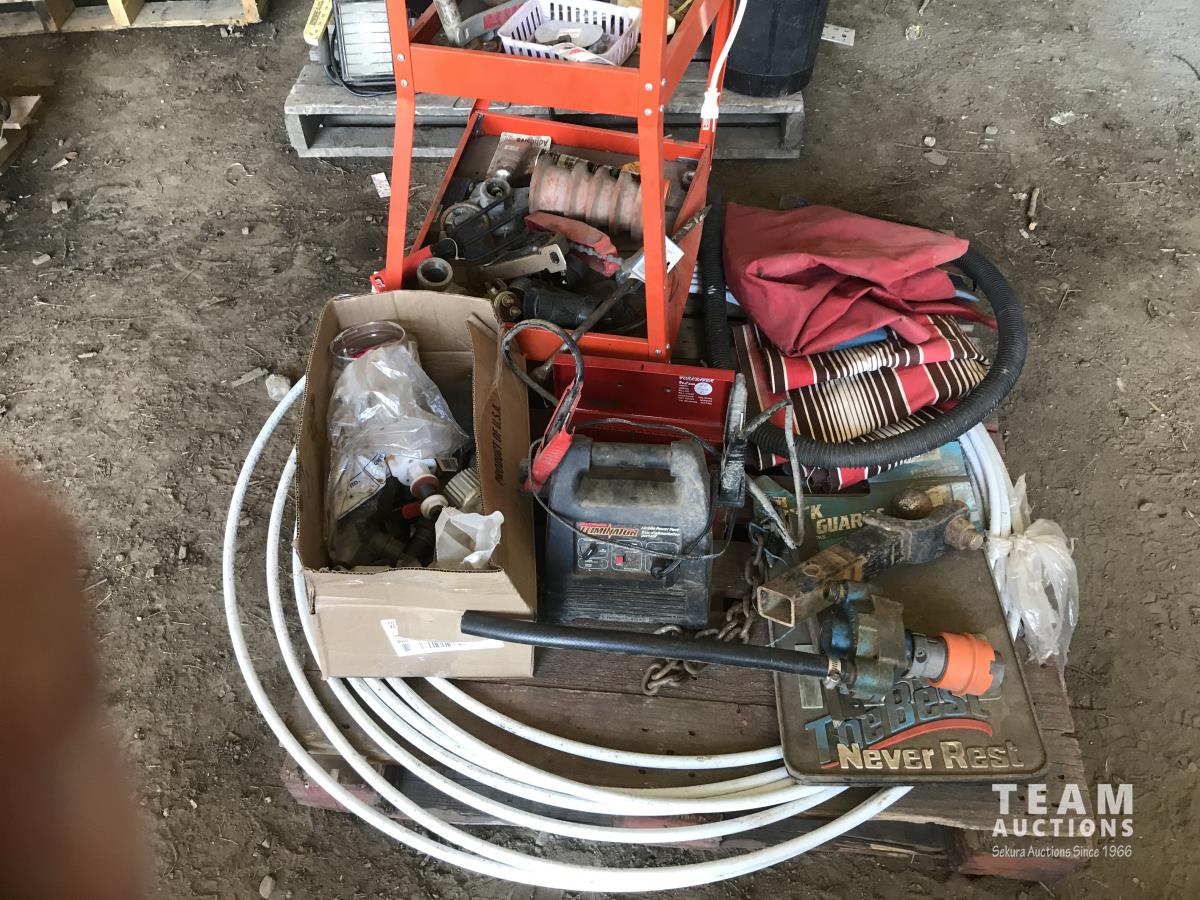 Motomaster mobile power pack. length of poly tubing, ball hitch & assorted items