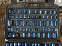 Drill accessor kit, assortment of pinch bars, Stanley 142 piece socket set, 16.8V Craftsman drill kit, bow saw, hatchet, miscellaneous