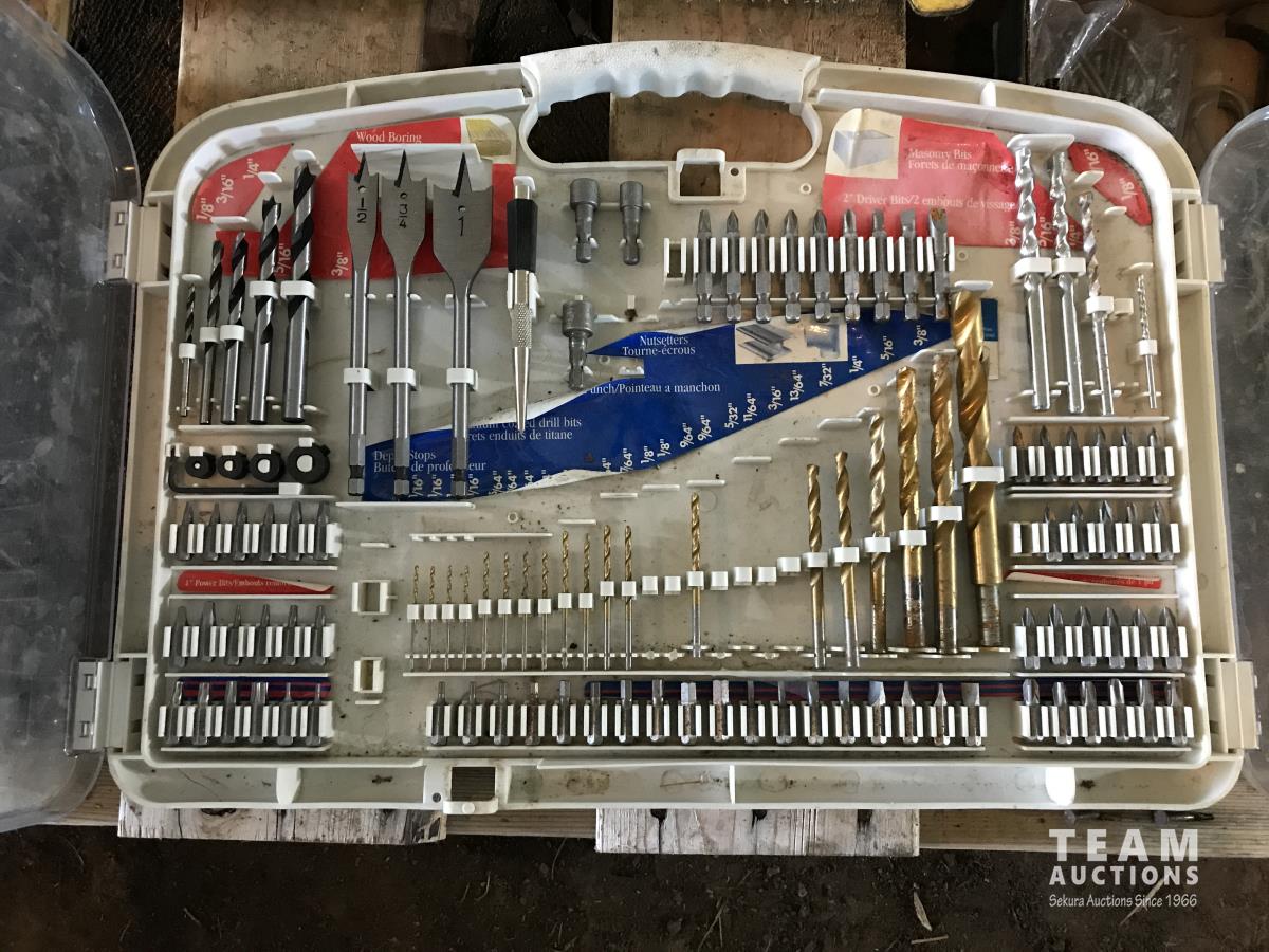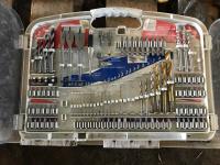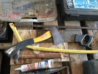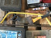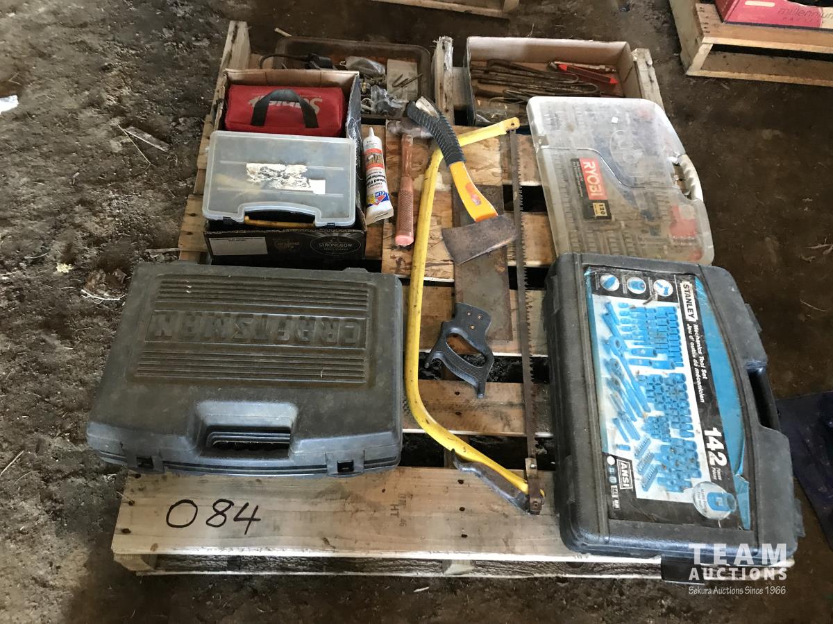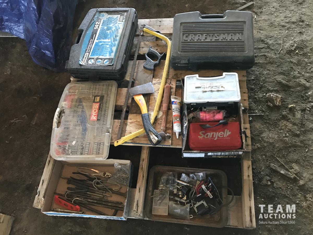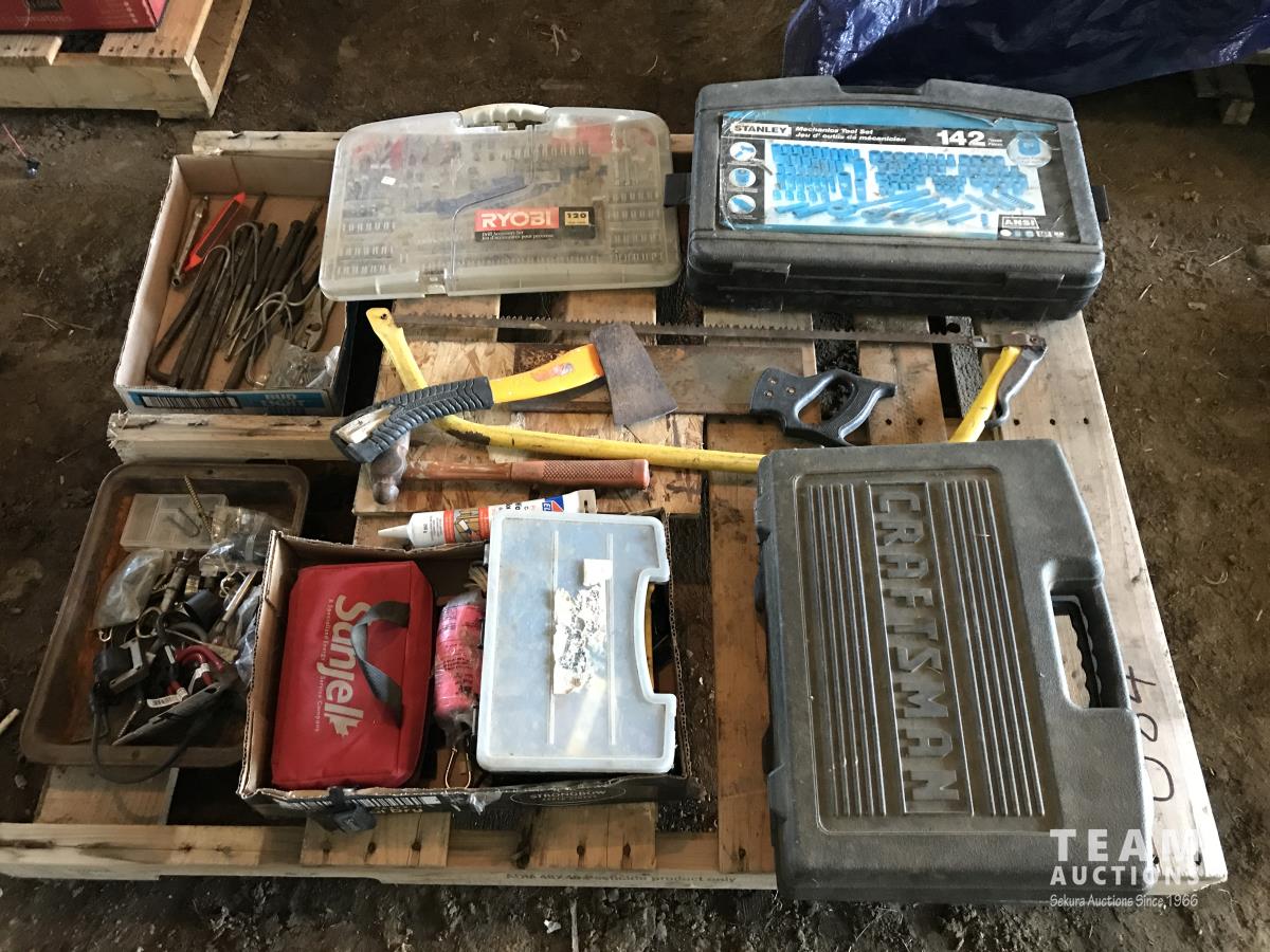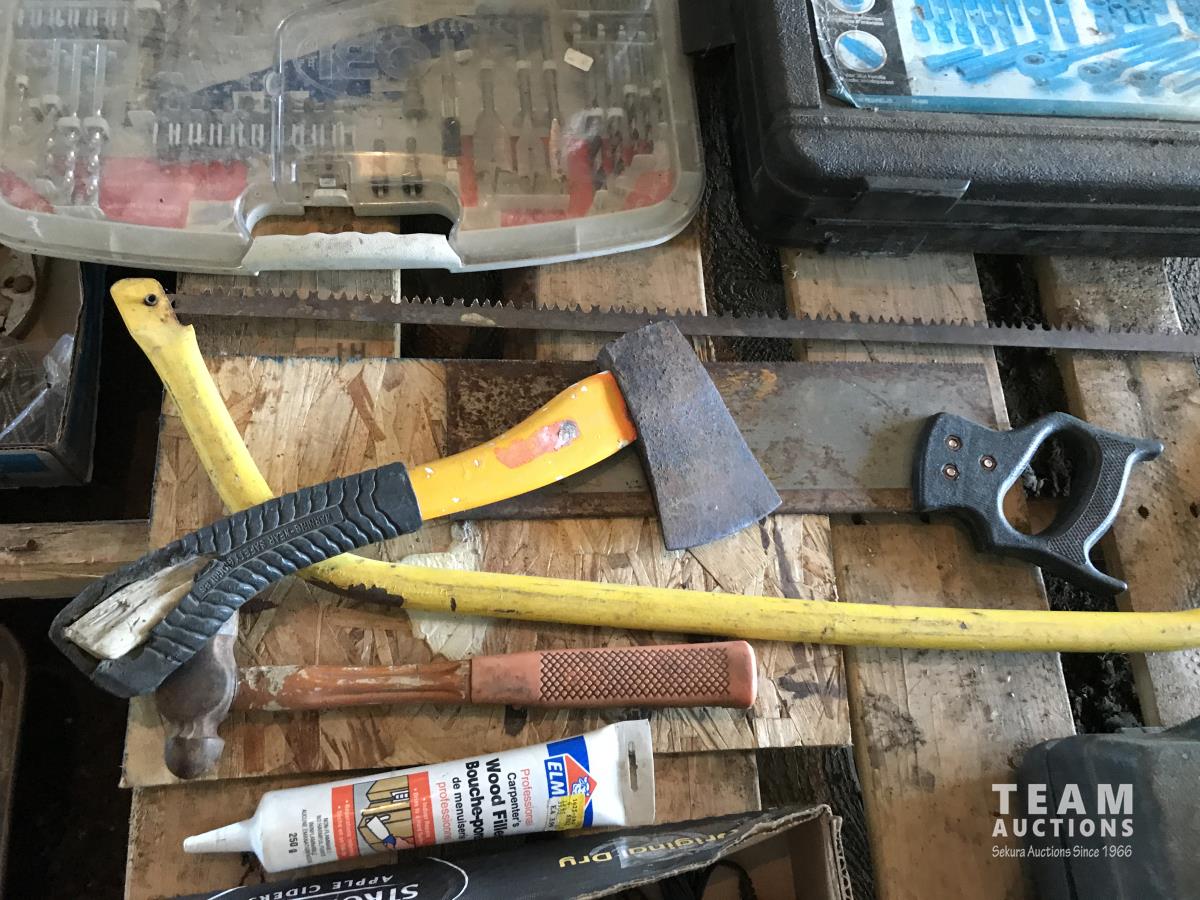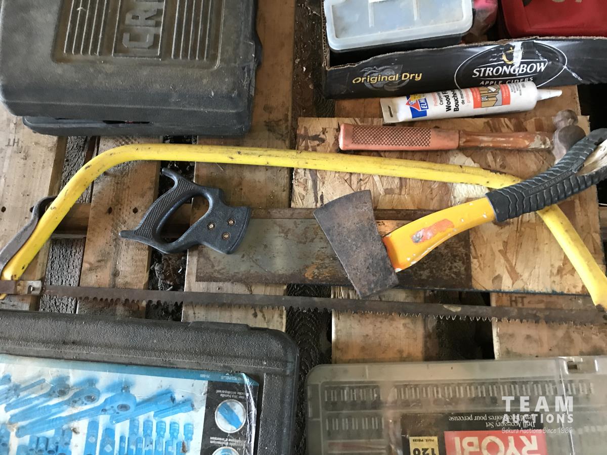 Drill accessor kit, assortment of pinch bars, Stanley 142 piece socket set, 16.8V Craftsman drill kit, bow saw, hatchet, miscellaneous