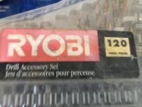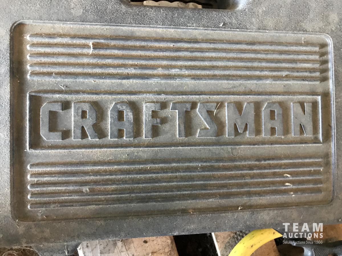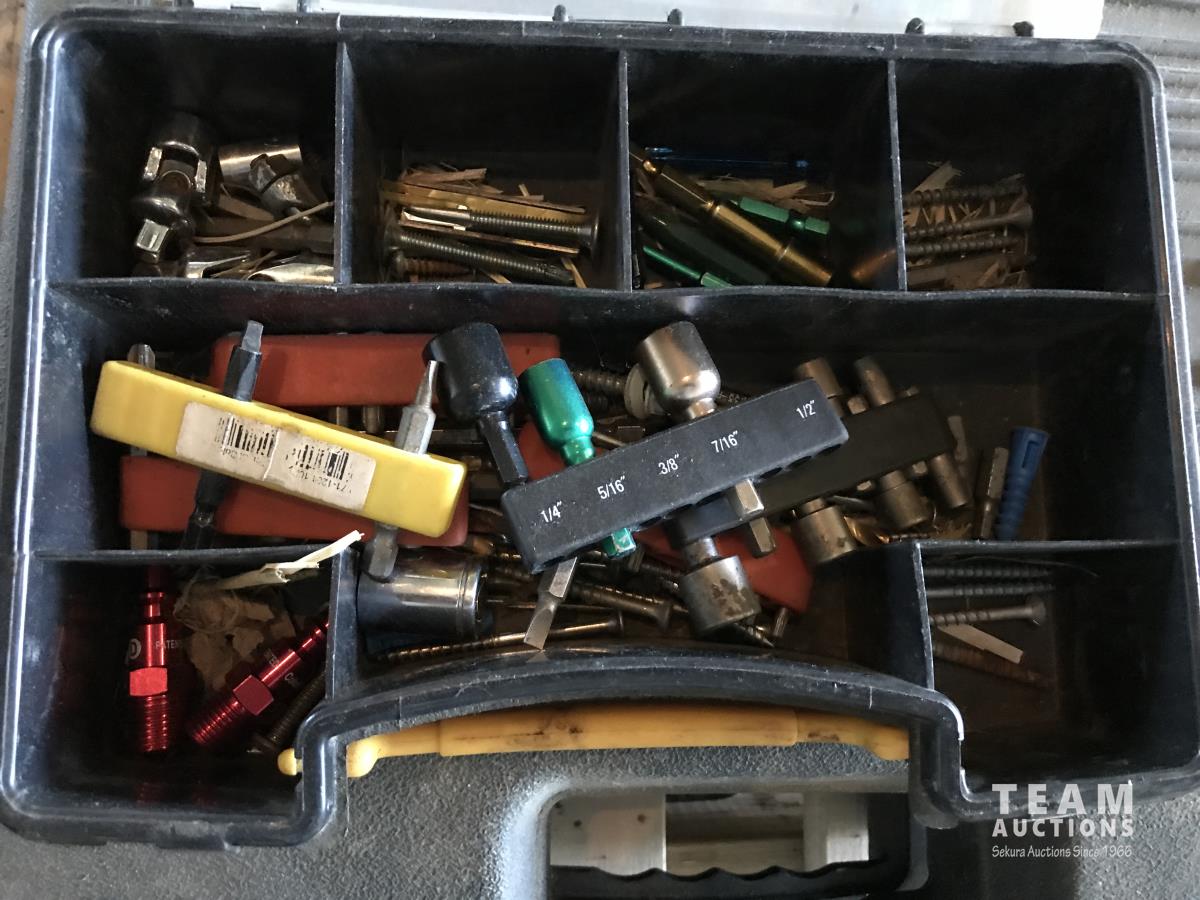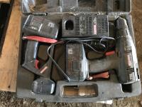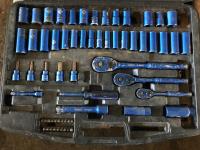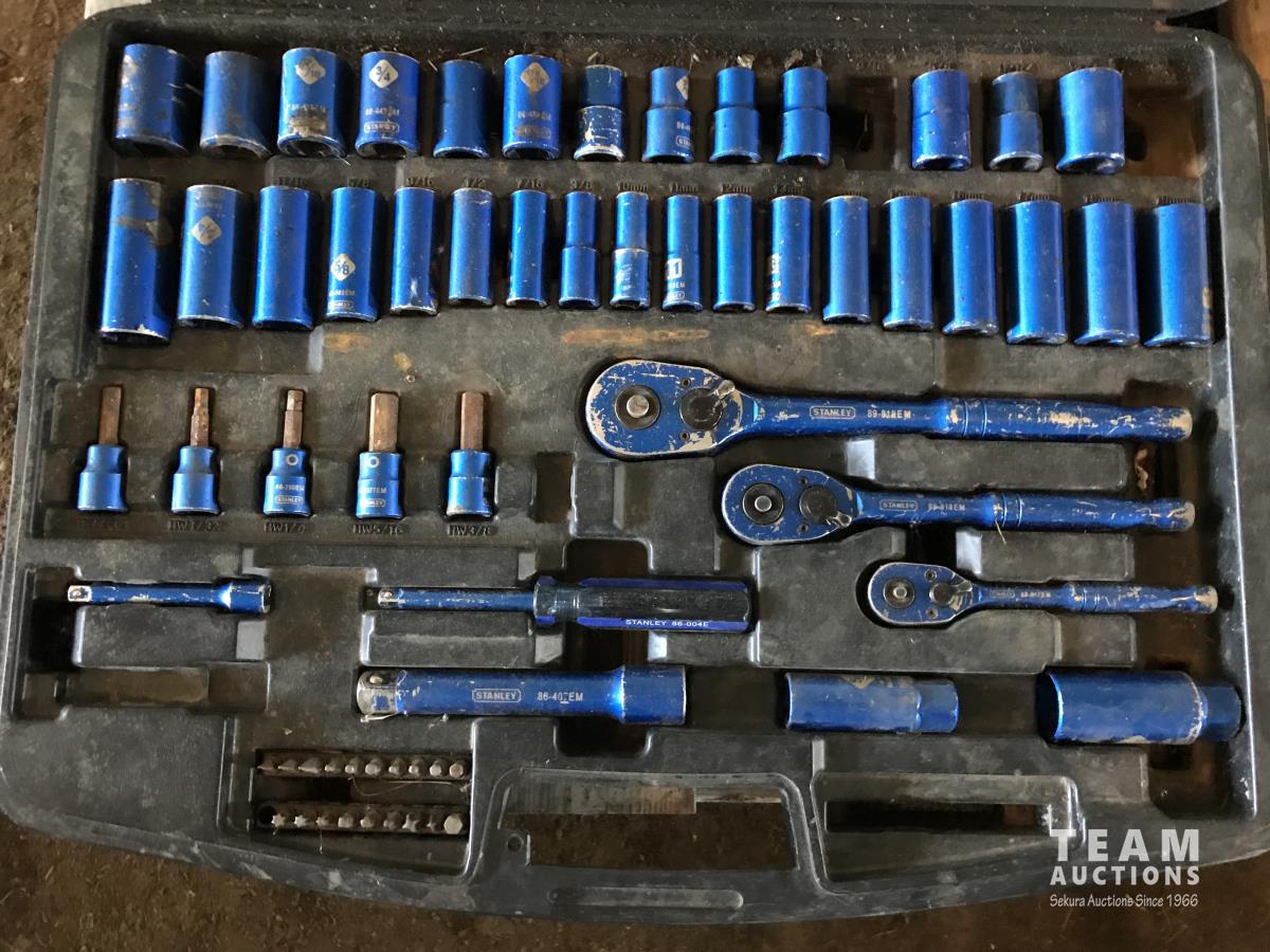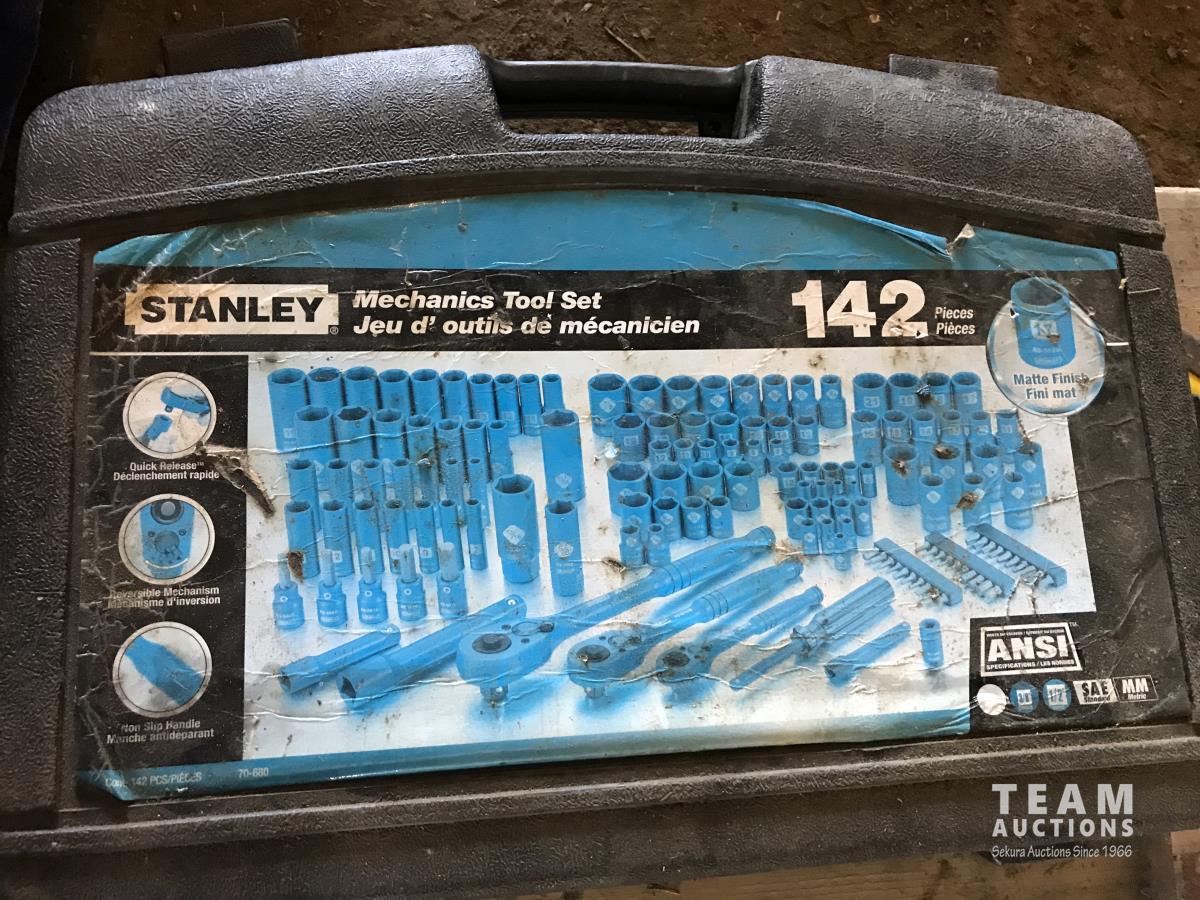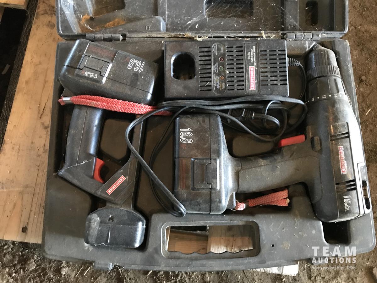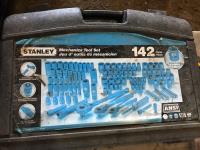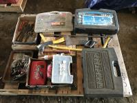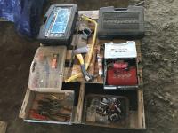 Drill accessor kit, assortment of pinch bars, Stanley 142 piece socket set, 16.8V Craftsman drill kit, bow saw, hatchet, miscellaneous