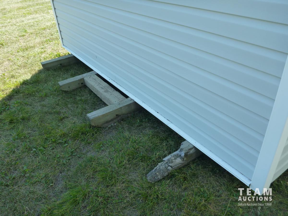 Man door, vinyl siding, k asphalt roof, on (4) pressure treated skids, 6 ft work bemch, 8 ft wooden shelving