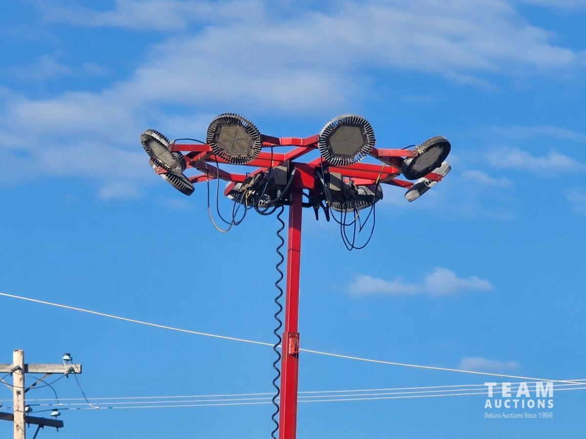 (2) 7,000 lb axles, 80 inch wide, torflex suspension, (8) lights, 235/80R16 tires on aluminum rims, 45 ft height, (8) LED lumen 26,000 watt lights, lights over a 400 ft circle, operates with 220 watt single phase power