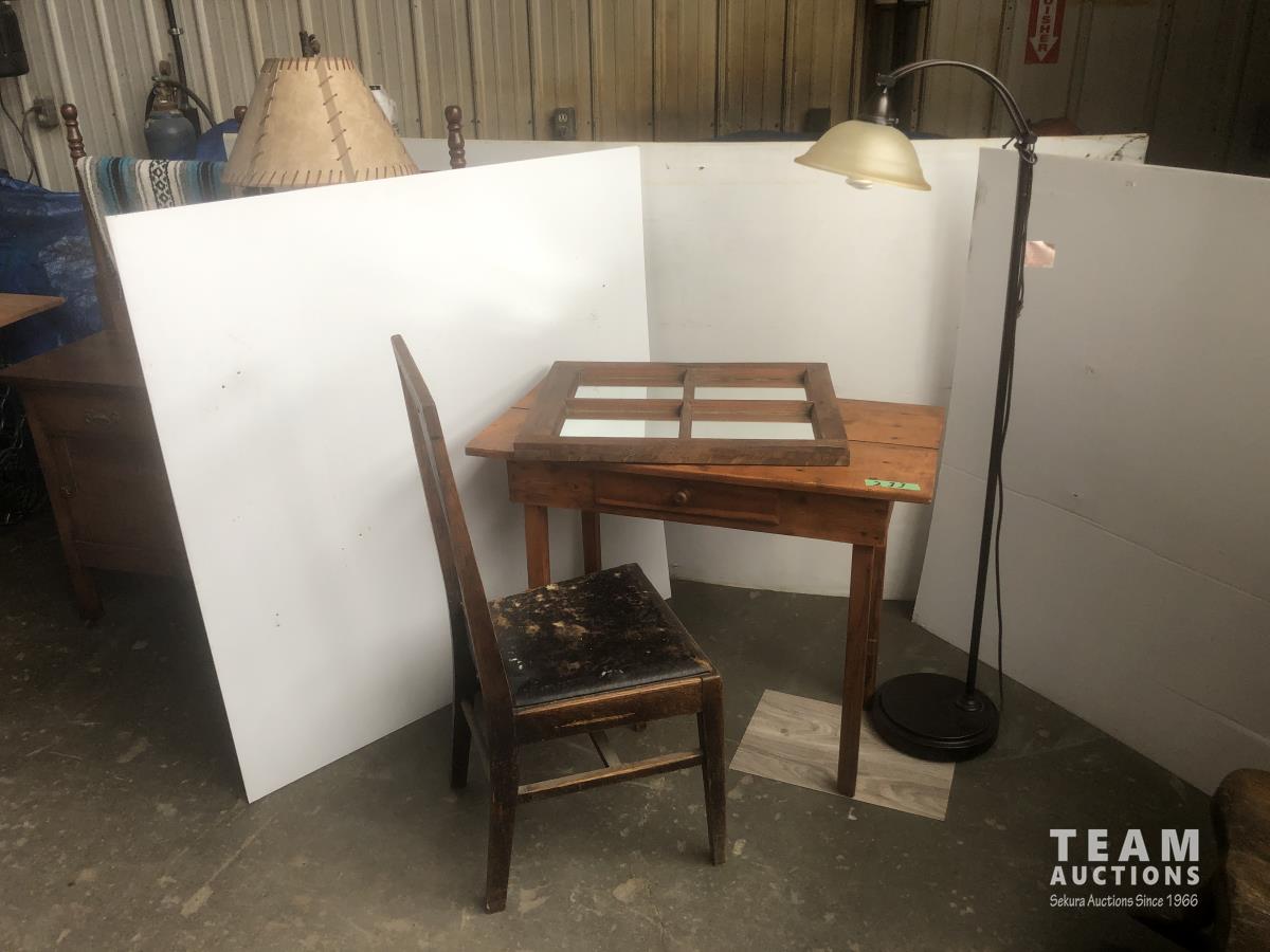 107 Antique Desk, Chair, Mirror & Floor Lamp