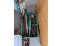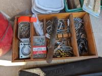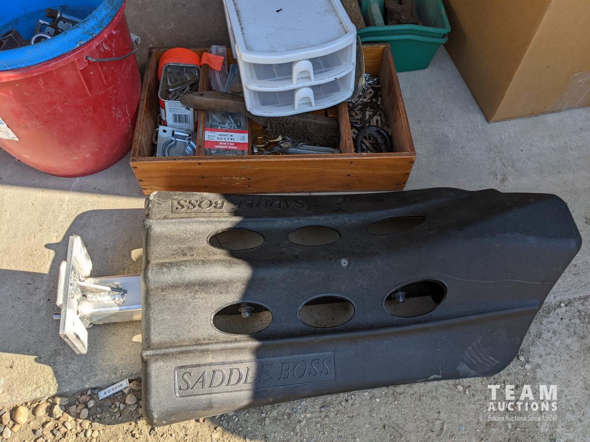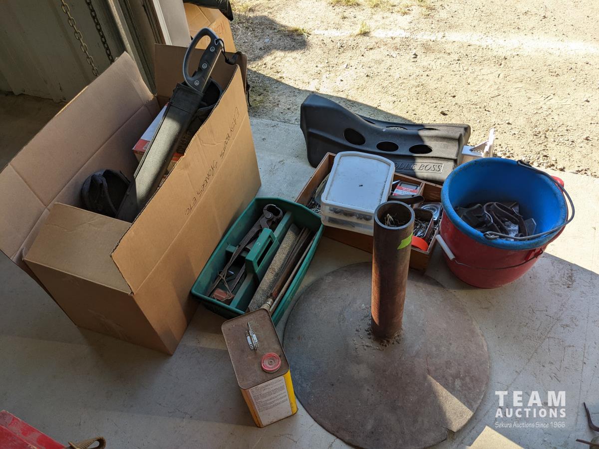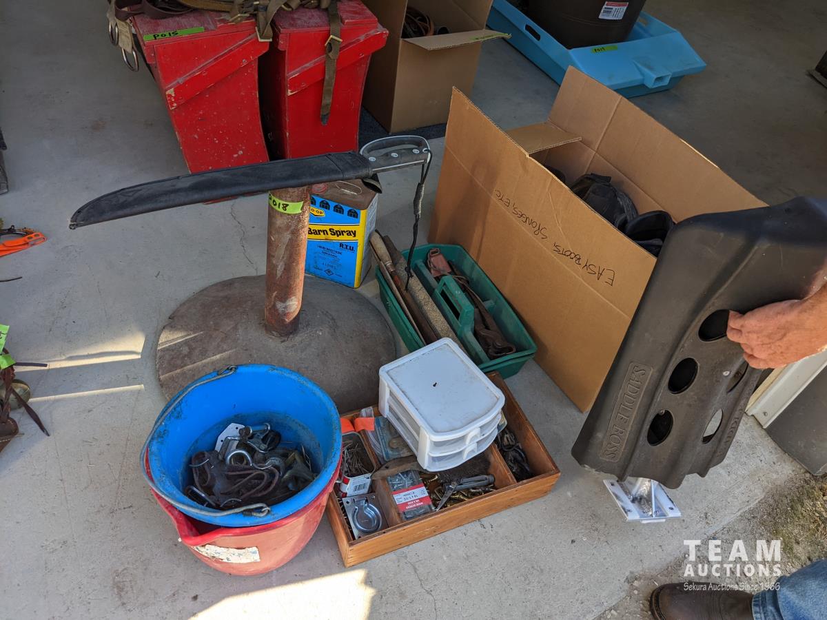 (9) Easy boots of various sizes, hoof stand, (2) poly pails, (2) Unused size 80 horse blankets, survival knife, saddle rack, barn spray
