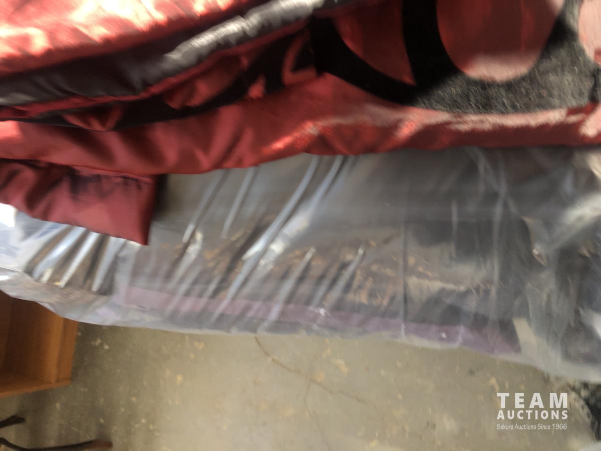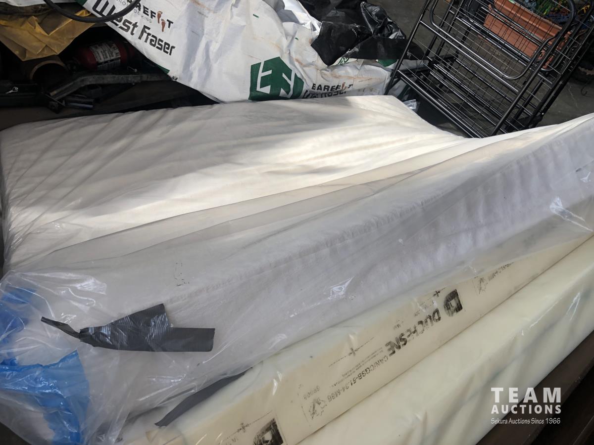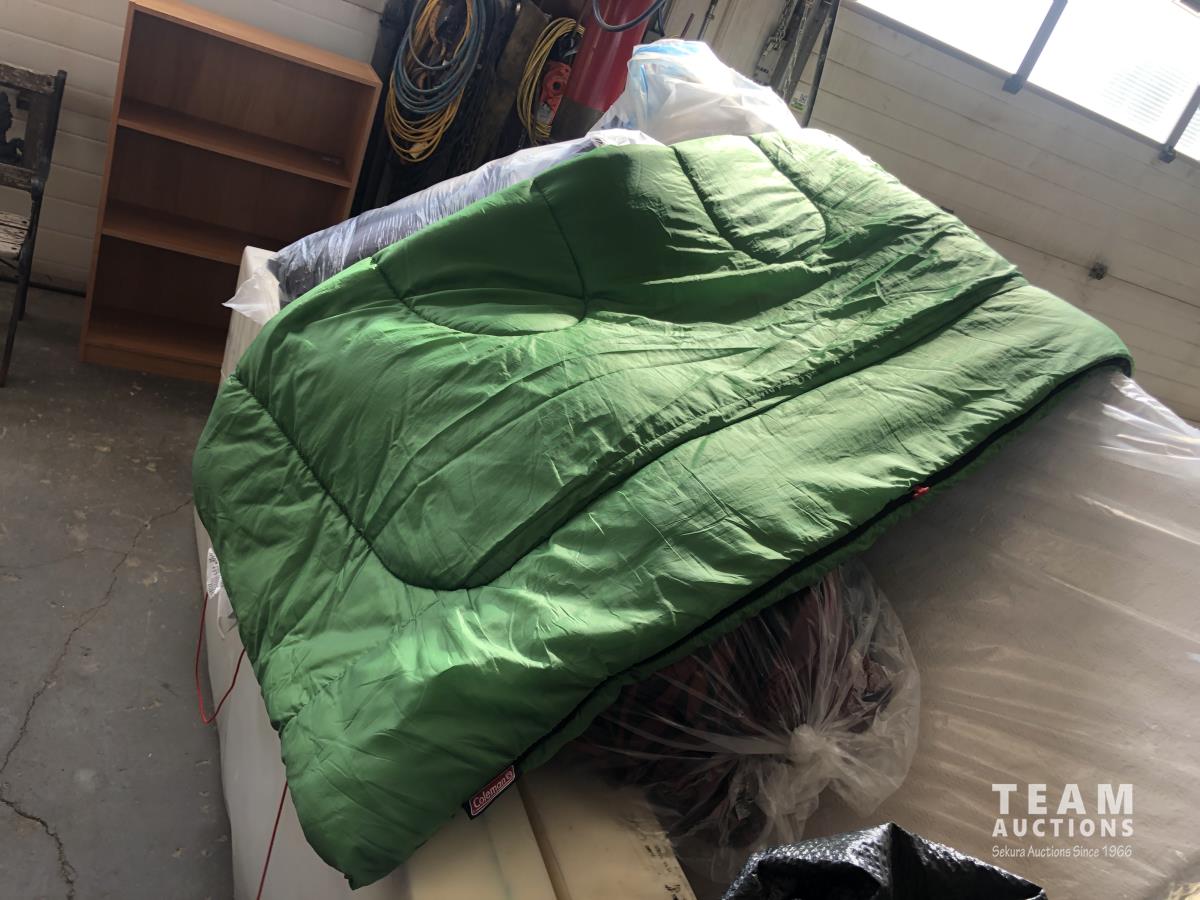 (2) folding cots w/ foam mattress, (3) bags of assorted bedding, sleeping bags & queen mattress