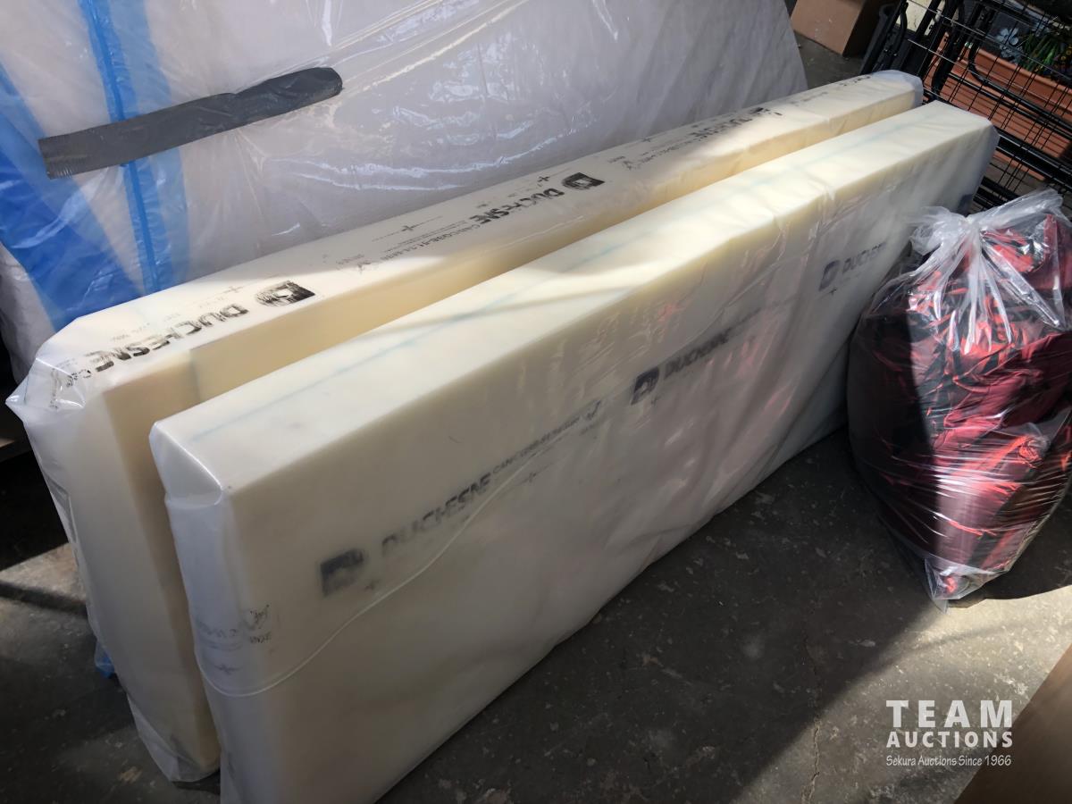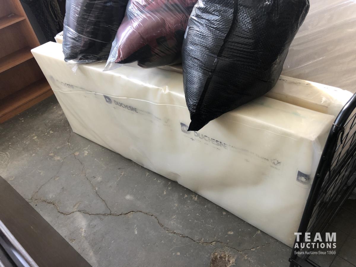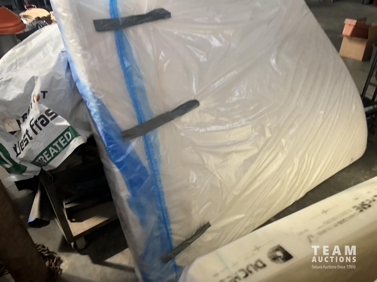 (2) folding cots w/ foam mattress, (3) bags of assorted bedding, sleeping bags & queen mattress