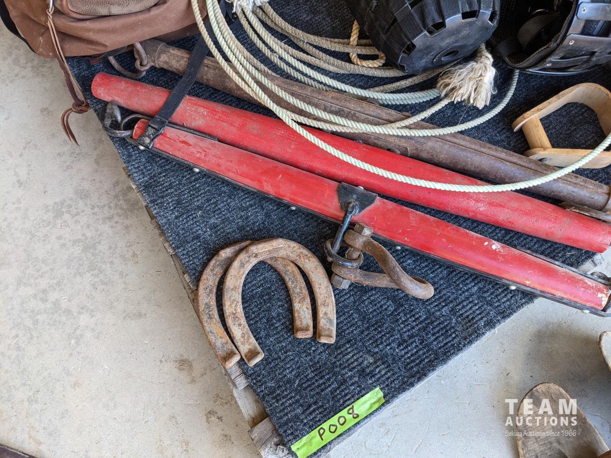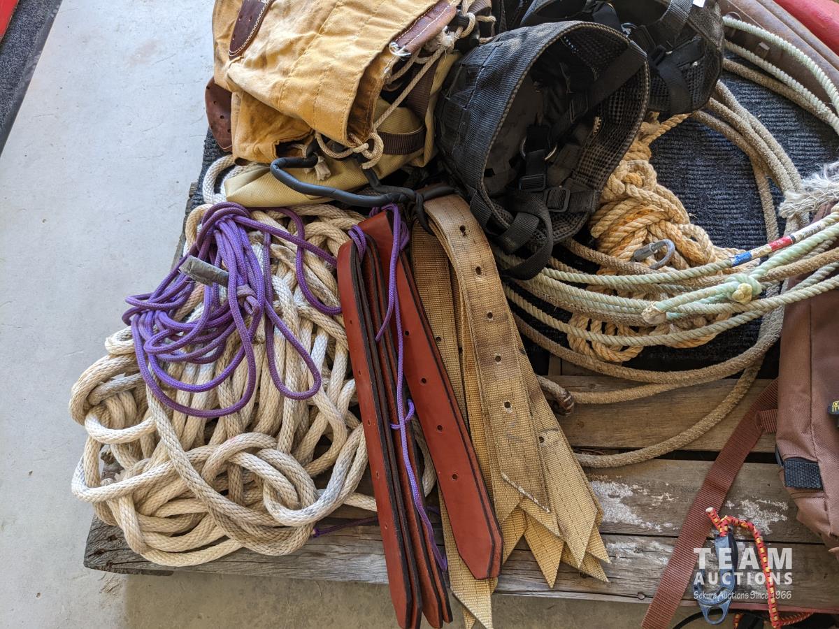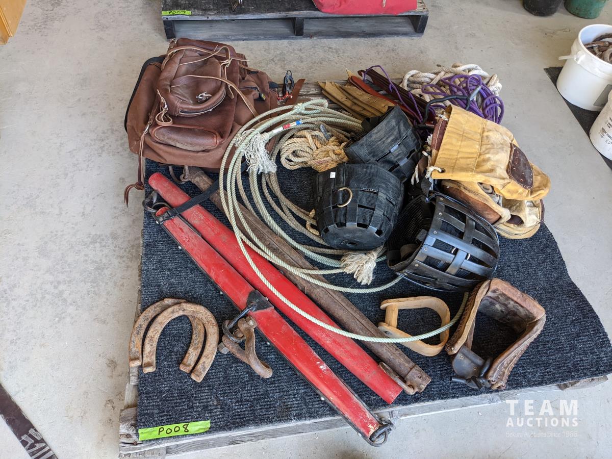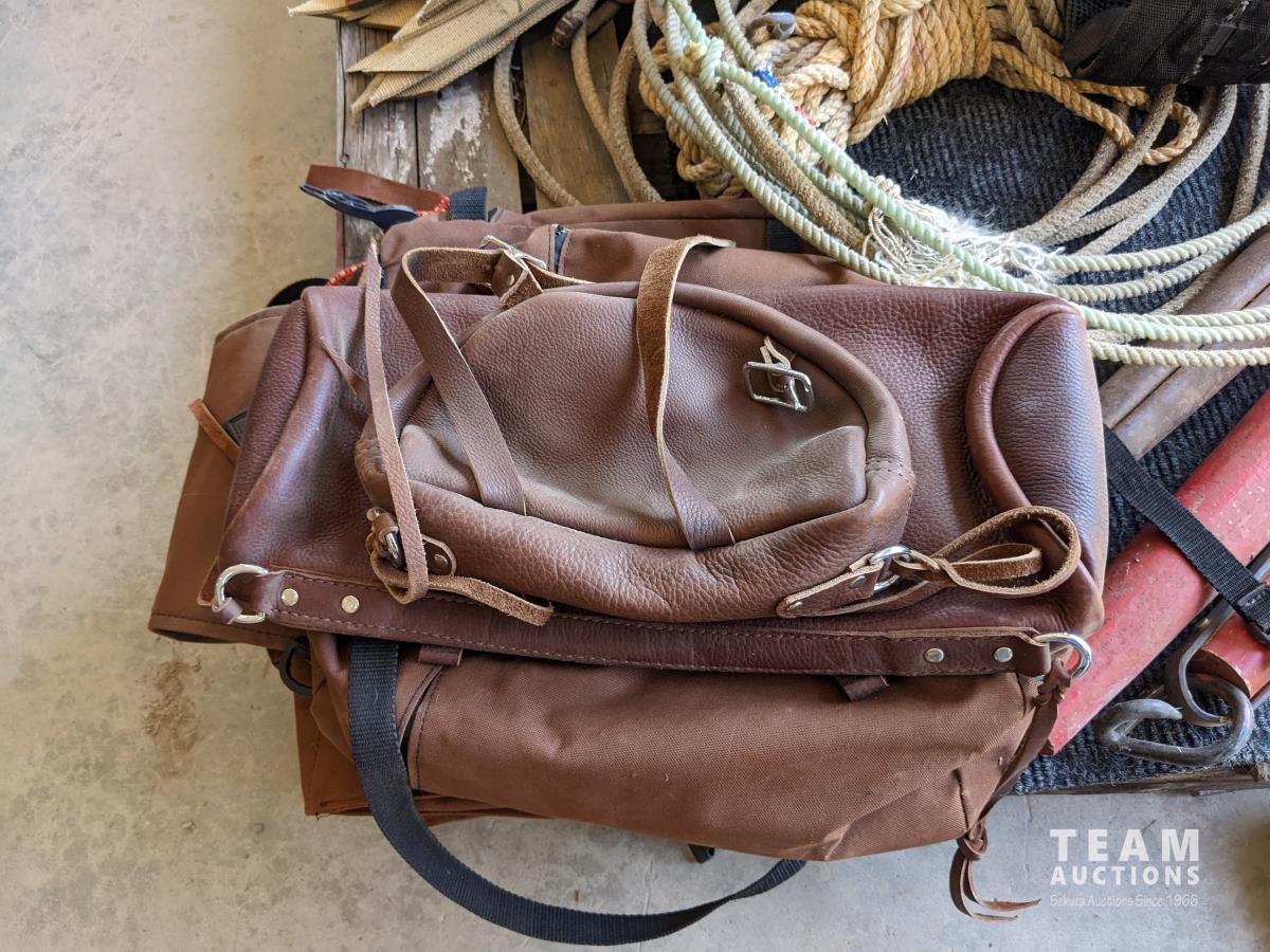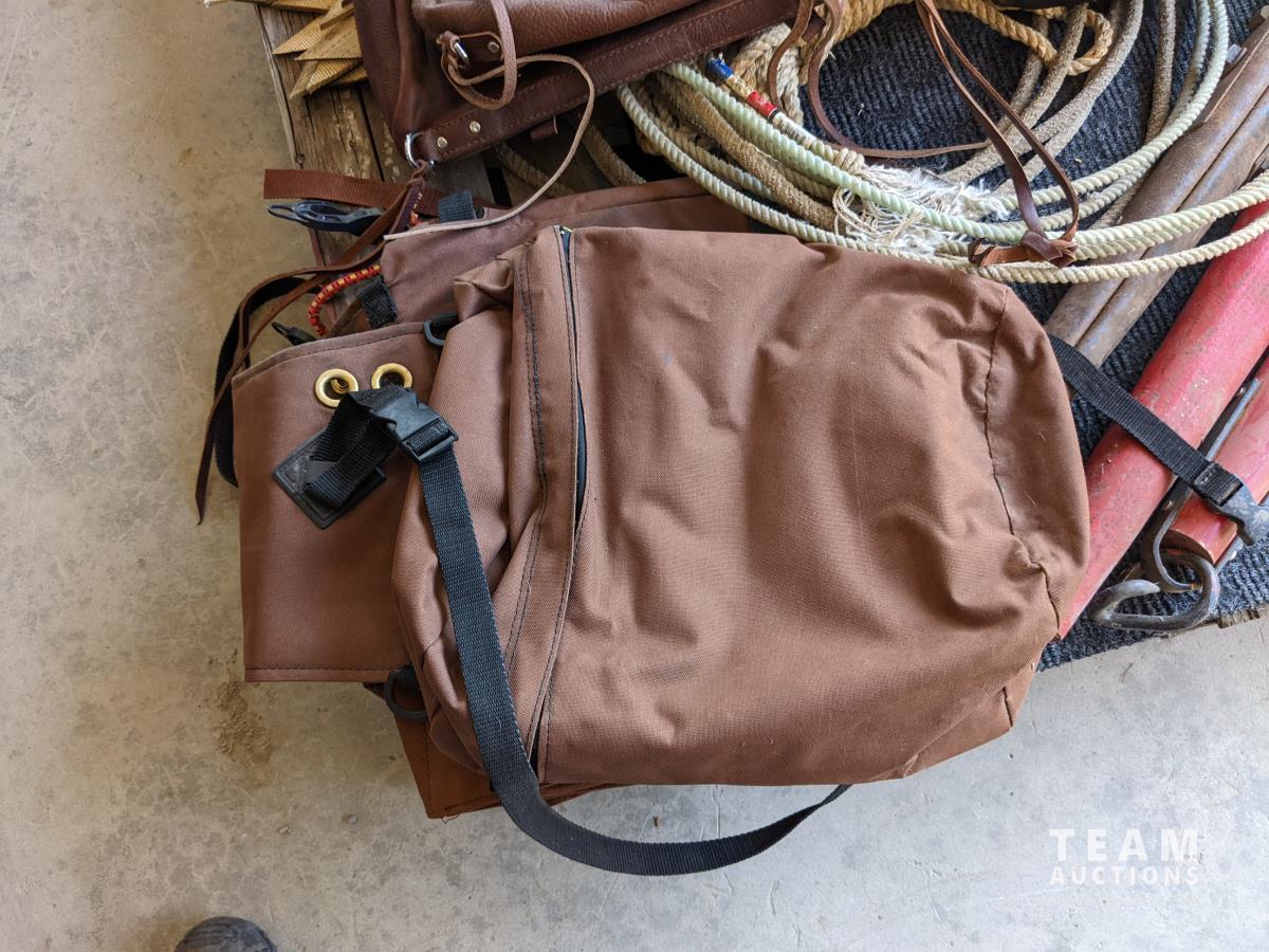 (2) Nylon saddle bags, (2) leather bags, (3) yokes, (4) horse muzzles, (5) feed bags, rope, (2) lariats, (2) horse shoess, (4) cinch straps
