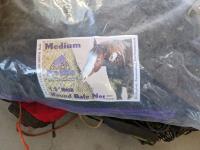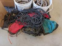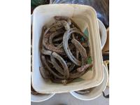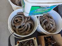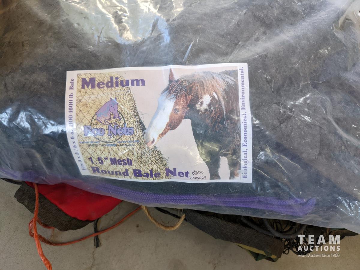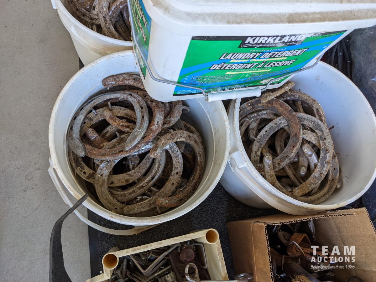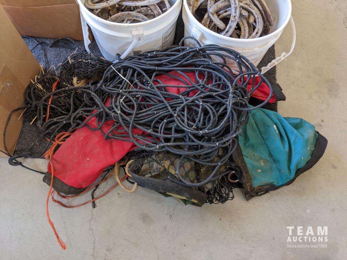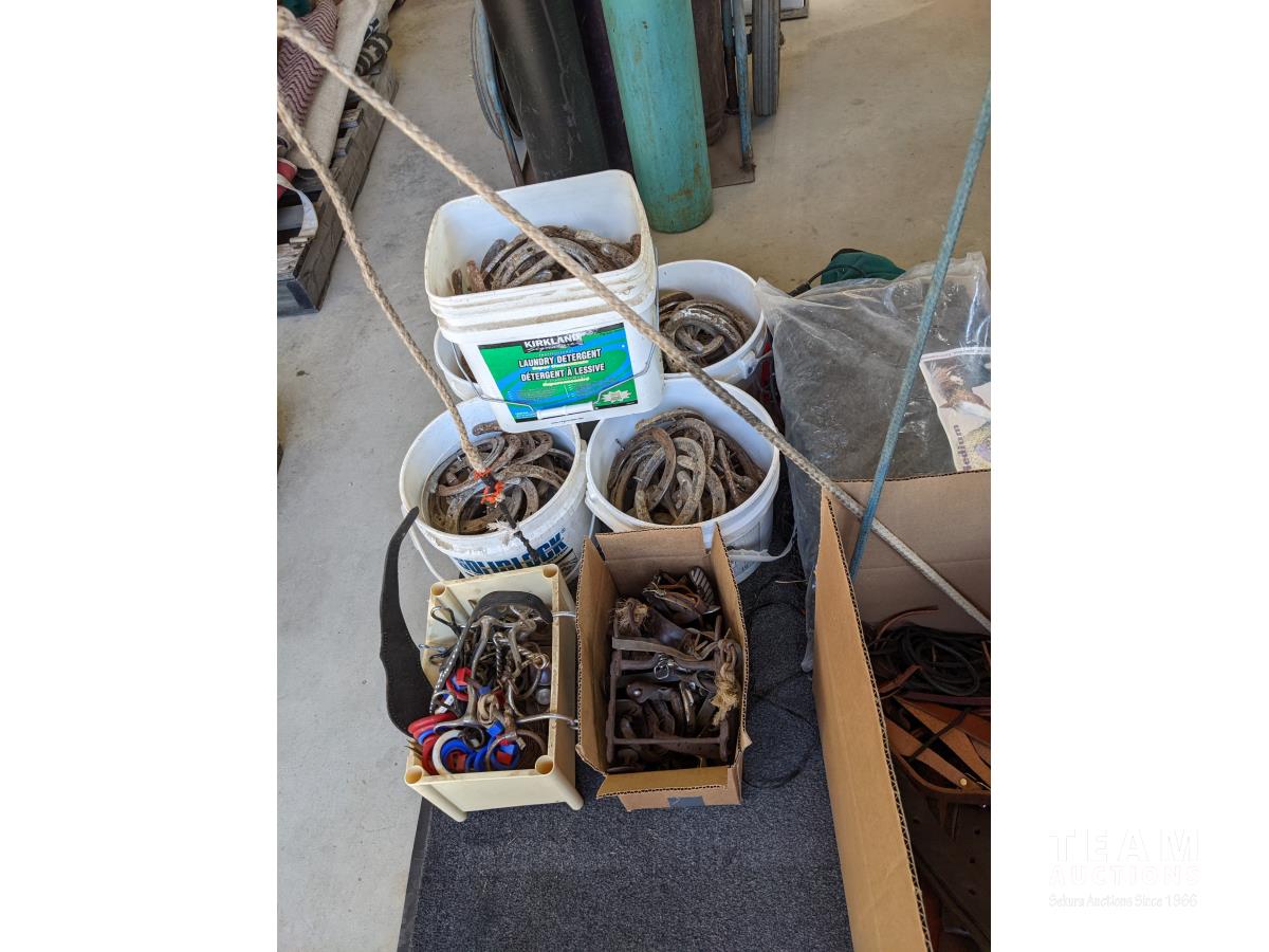 box of leather, used horse shoes, round bay hay net, square bale hay nets, buckles, spurs, bits, (2) whips