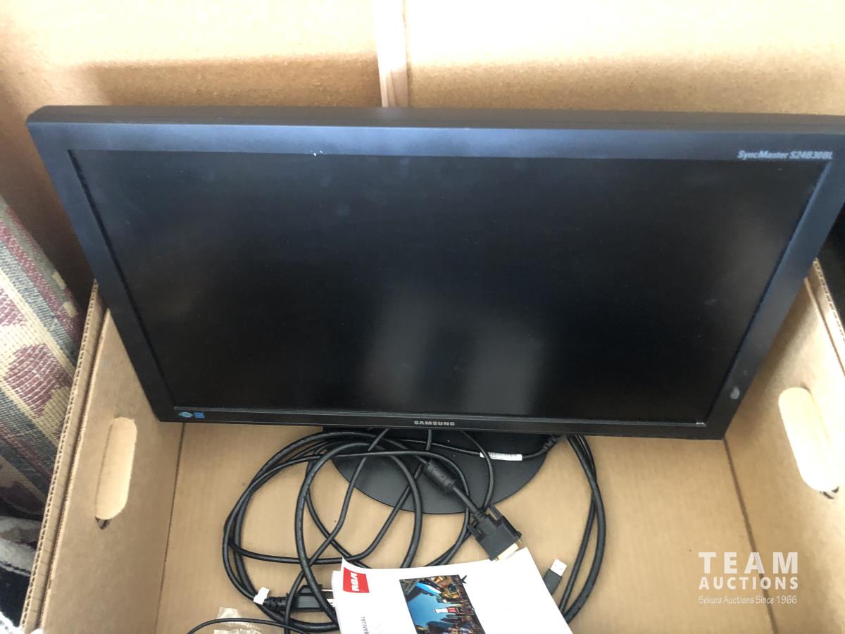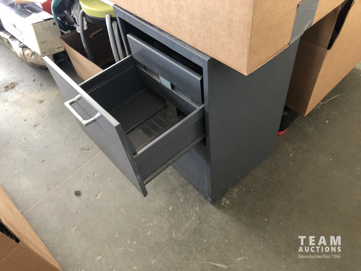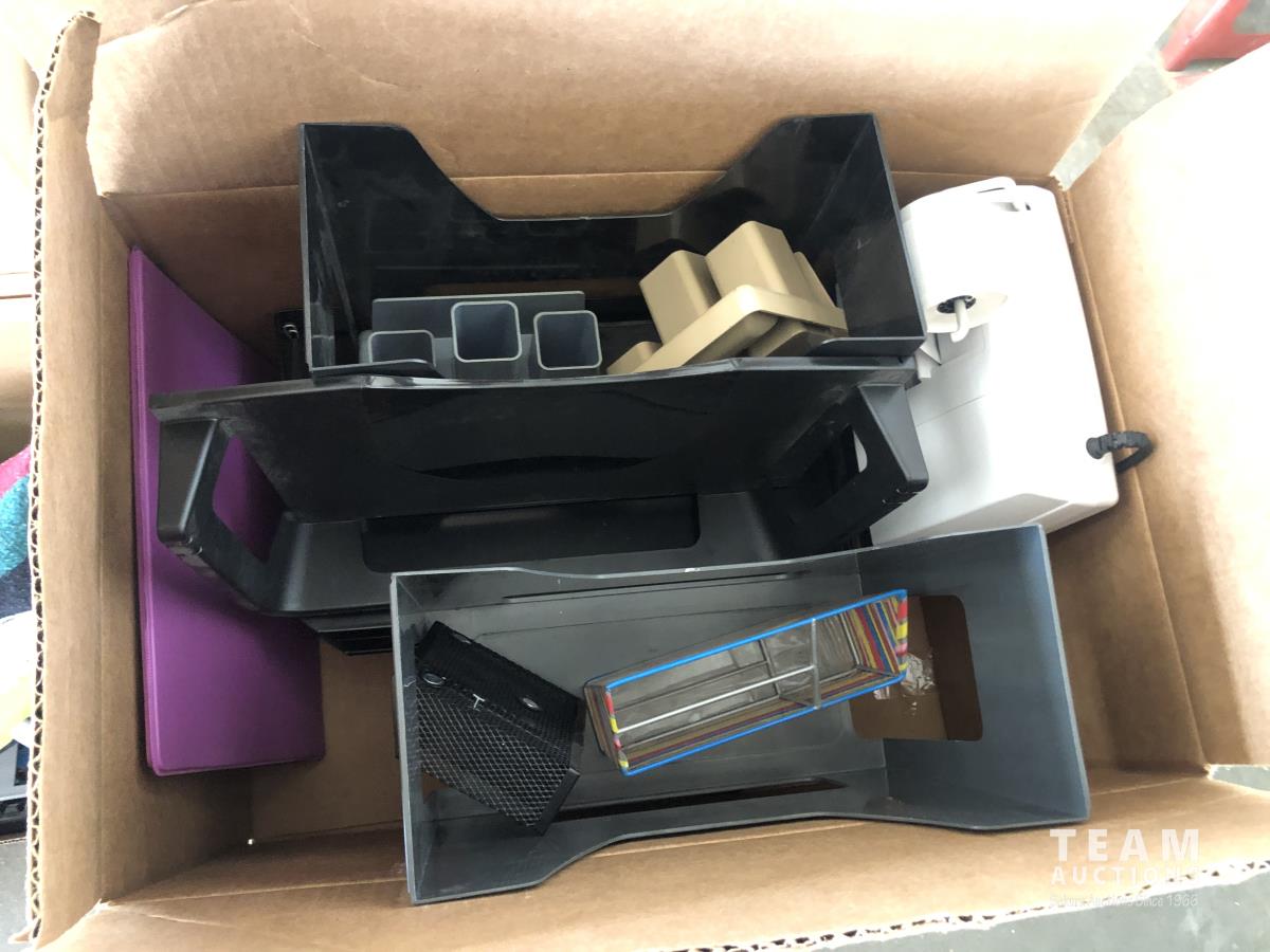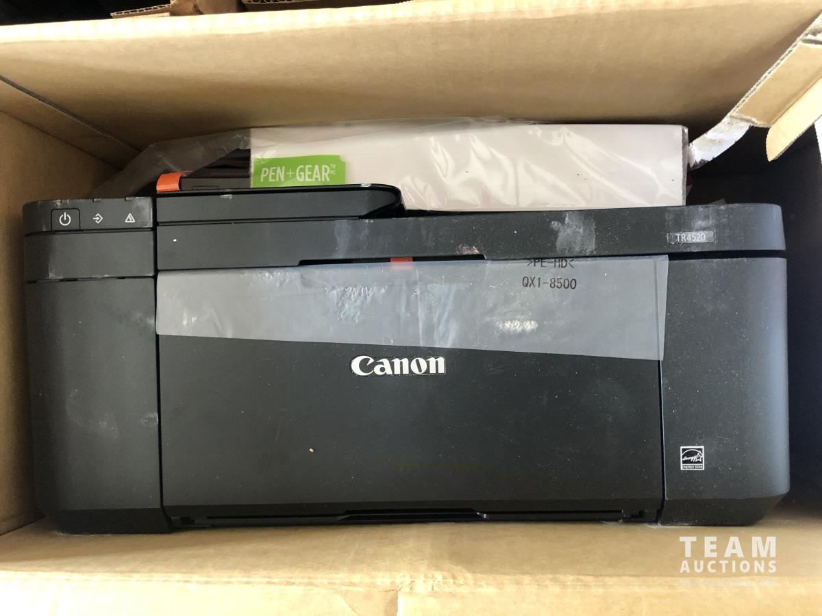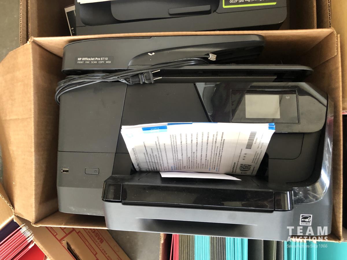 Miscellaneous office supplies, (3) printers, filing cabinet, computer monitor , keyboard & track lights