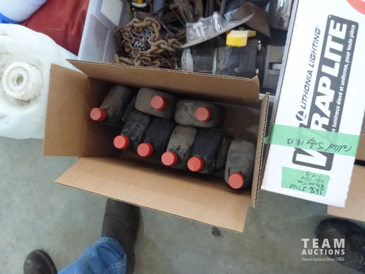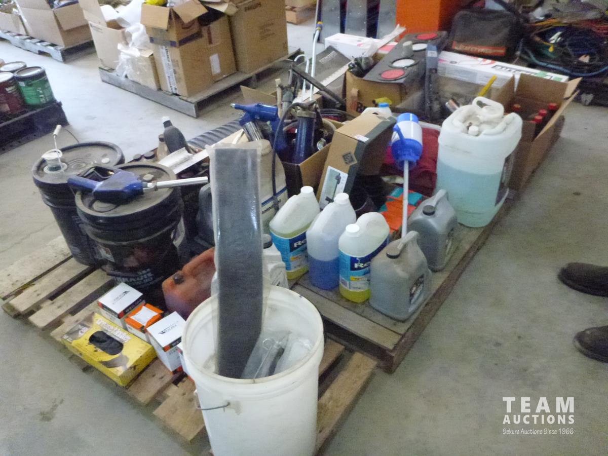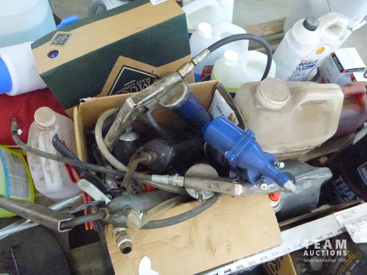 receiver hitch, (8) 1 litre 10W40 motor oil, shop fluids, grease fittings, grease guns, coveralls, hose clamps, misc items
