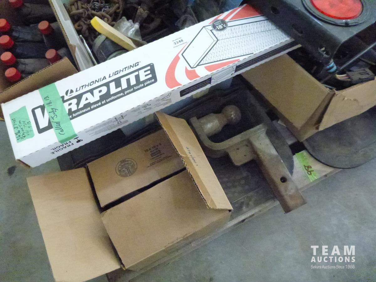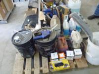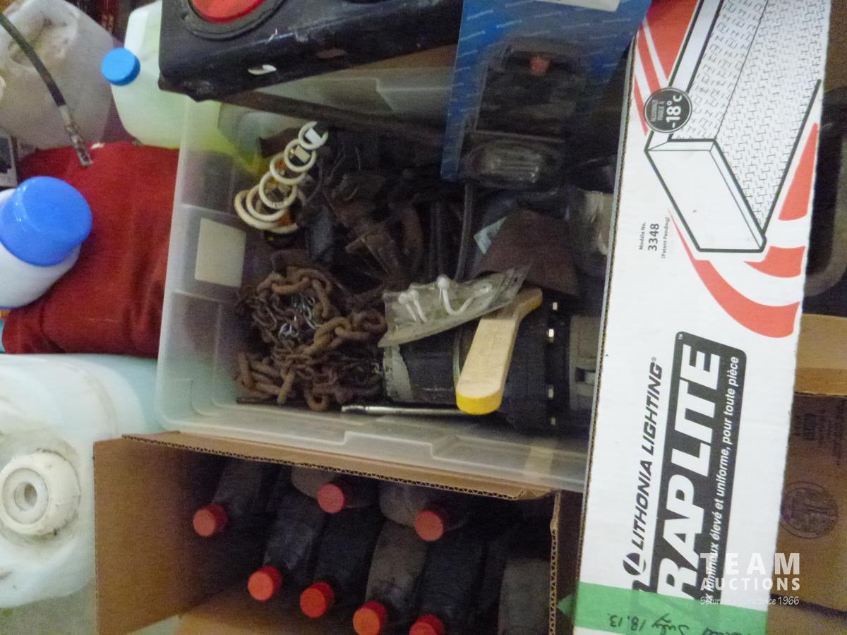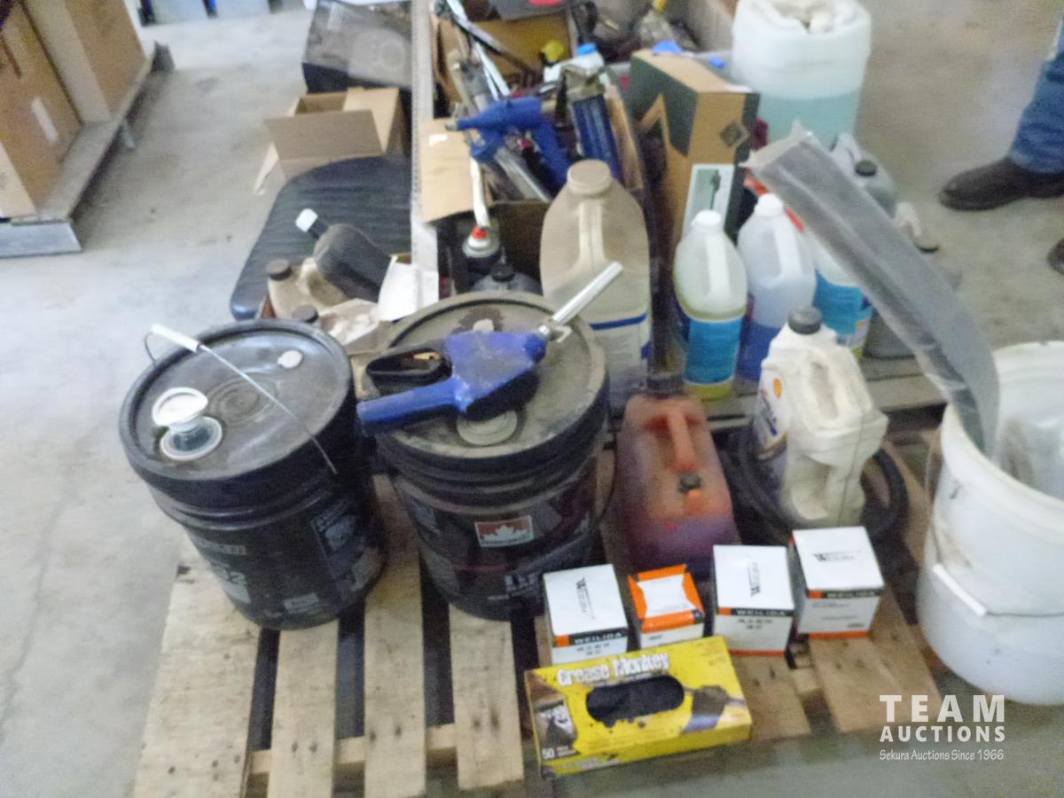 receiver hitch, (8) 1 litre 10W40 motor oil, shop fluids, grease fittings, grease guns, coveralls, hose clamps, misc items